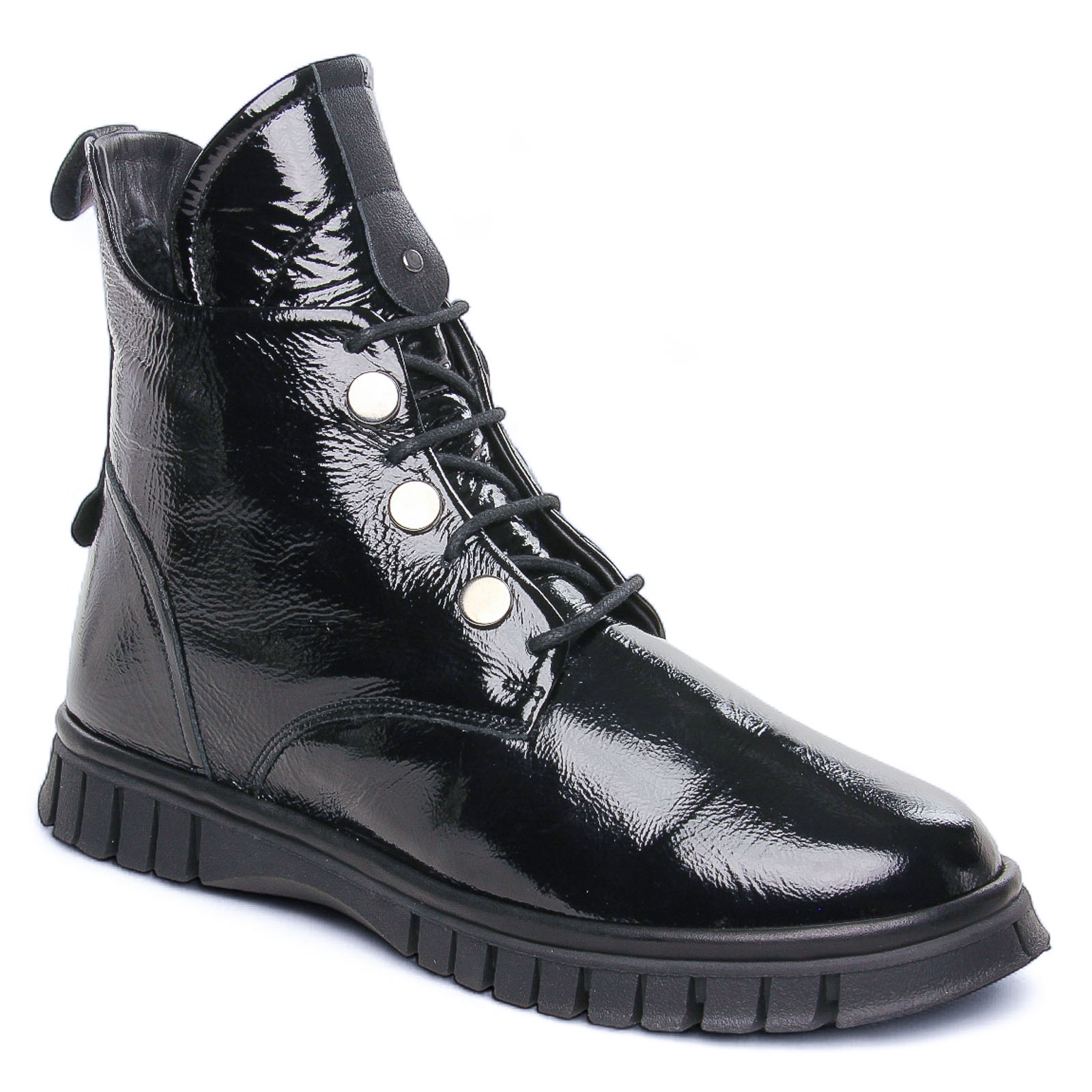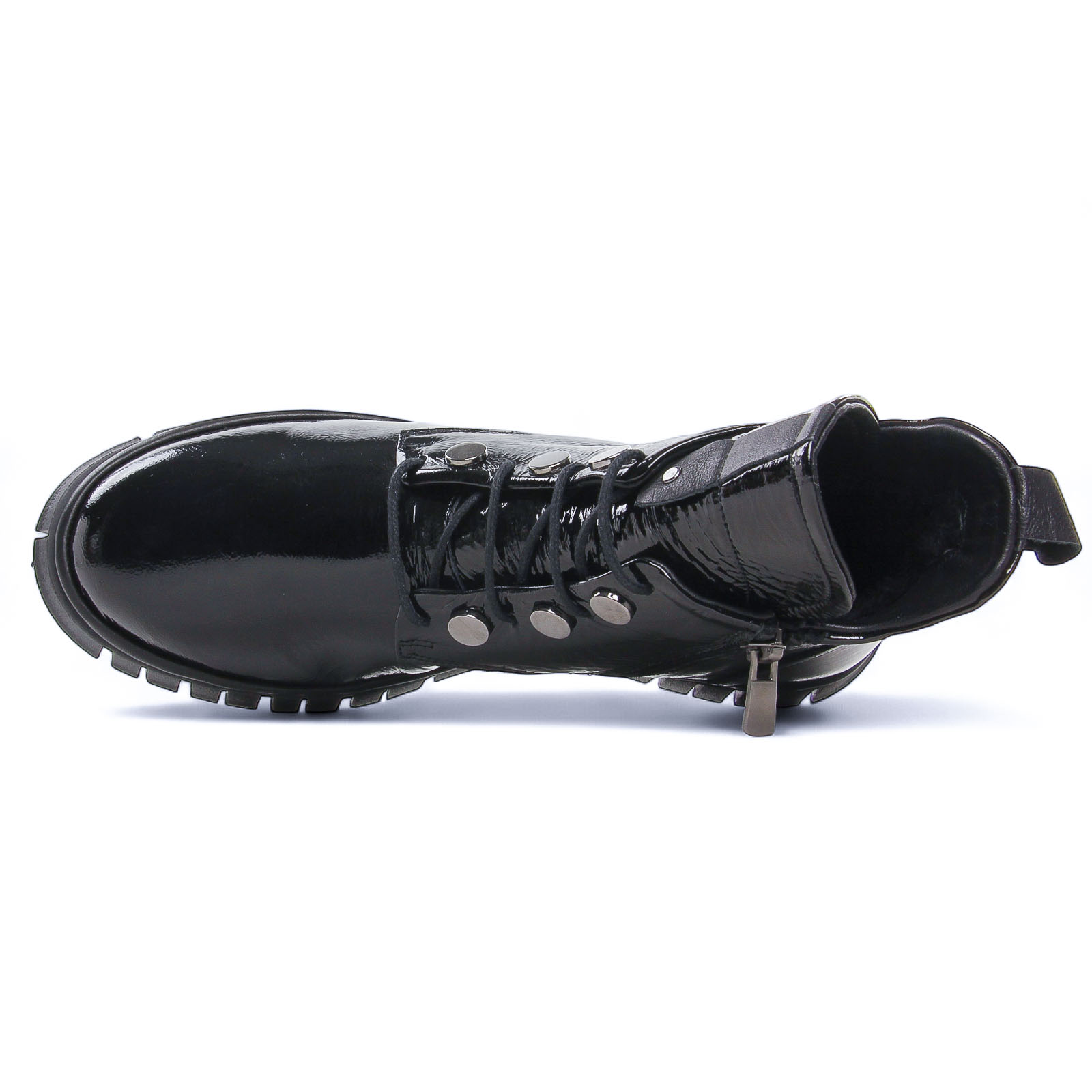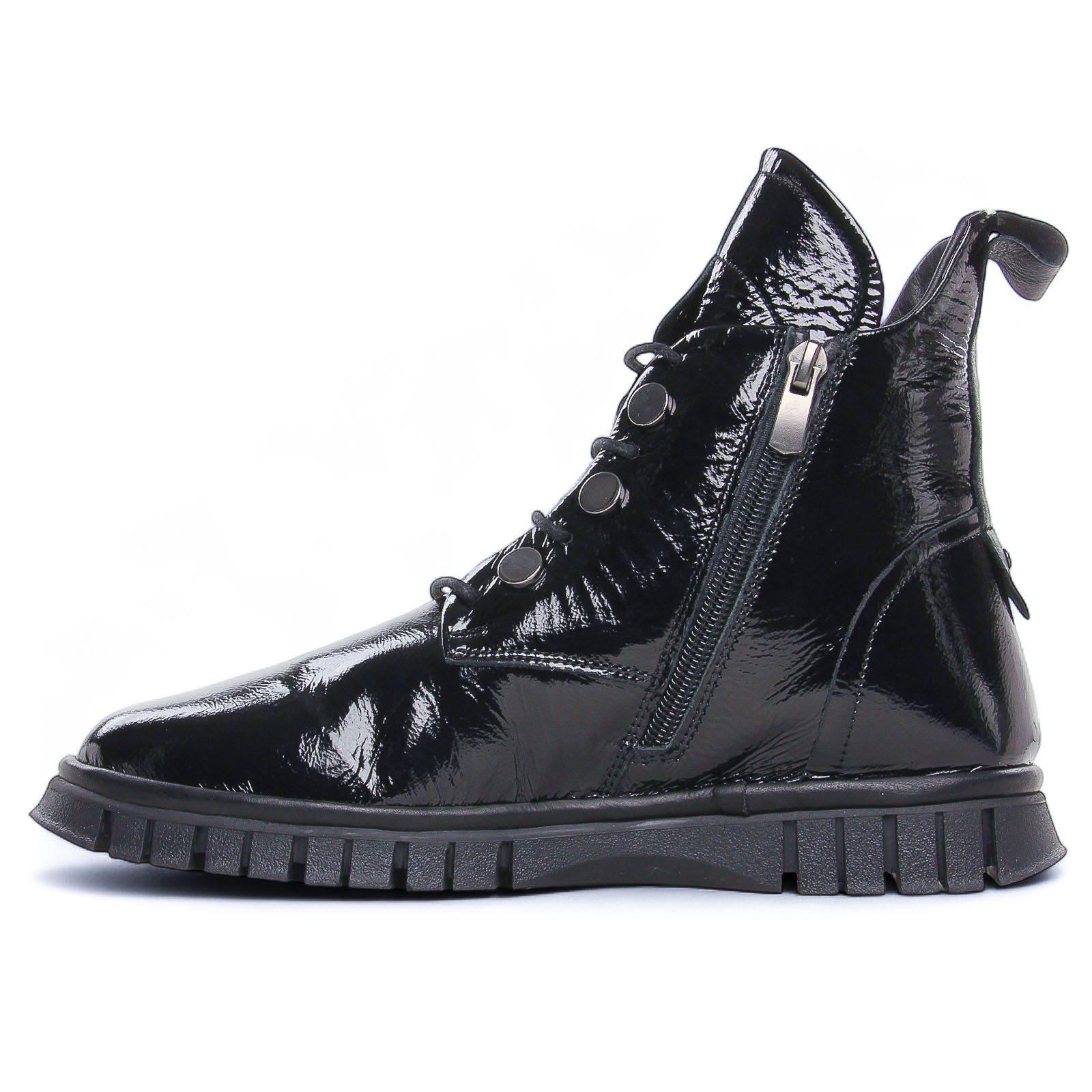 Bottines À Lacets de la marque Altex de couleur noir. Chaussures montantes avec une tige en cuir vernis noir, bottines doublée avec un textile chaud, un zip et des lacets, les passants des lacets avec un effet métal pour une touche glamour supplémentaire, semelle externe en caoutchouc, anti dérapante.