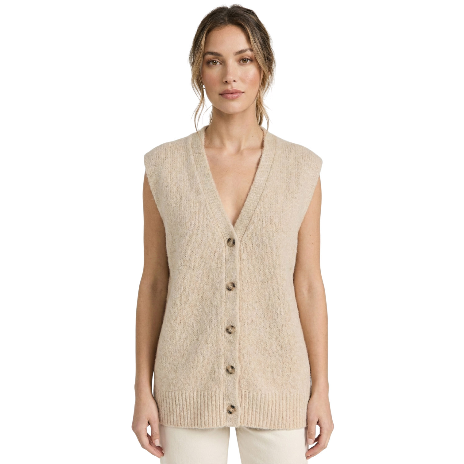 Gilets de la marque Andromède de couleur blanc ecru. Ce gilet avec fermeture par bouton offre une texture moelleuse et un confort idéal pour la mi-saison. Sa coupe sans manche permet une grande liberté de mouvement, tandis que le textile utilisé ajoute une touche décontractée et moderne à votre look. Parfait sur un pull col roulé ou toute autre tenue, il apporte une chaleur légère et stylée.