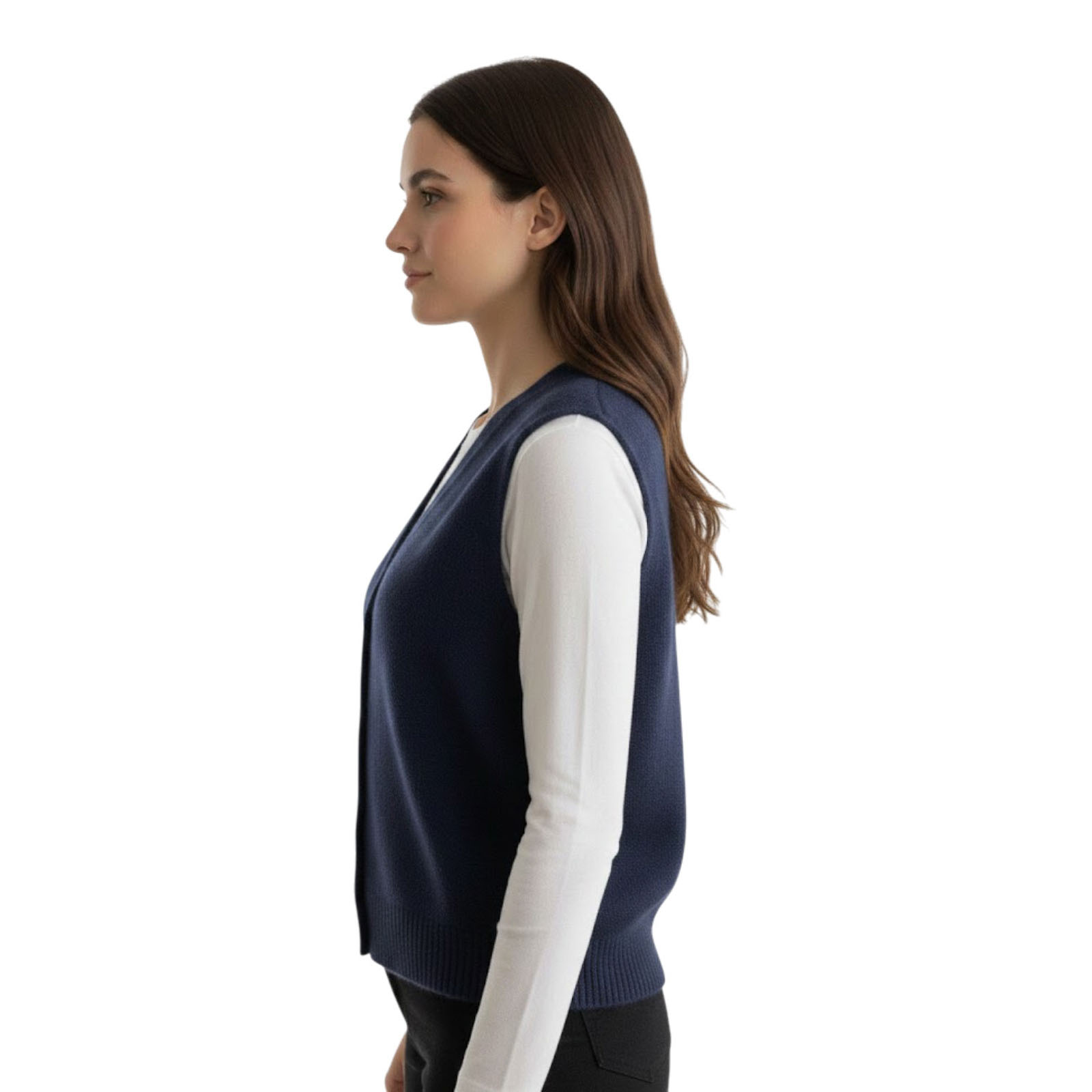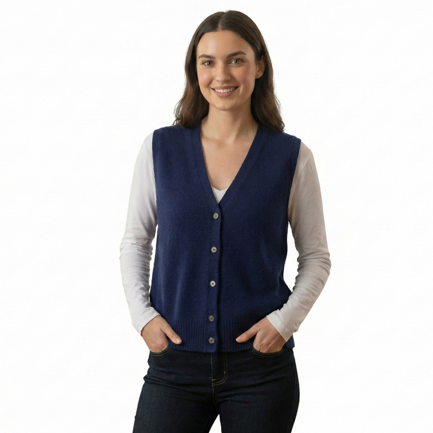 Gilets de la marque Andromède de couleur bleu marine. Ce gilet avec fermeture par bouton offre une texture moelleuse et un confort idéal pour la mi-saison. Sa coupe sans manche permet une grande liberté de mouvement, tandis que le textile utilisé ajoute une touche décontractée et moderne à votre look. Parfait sur un pull col roulé ou toute autre tenue, il apporte une chaleur légère et stylée.