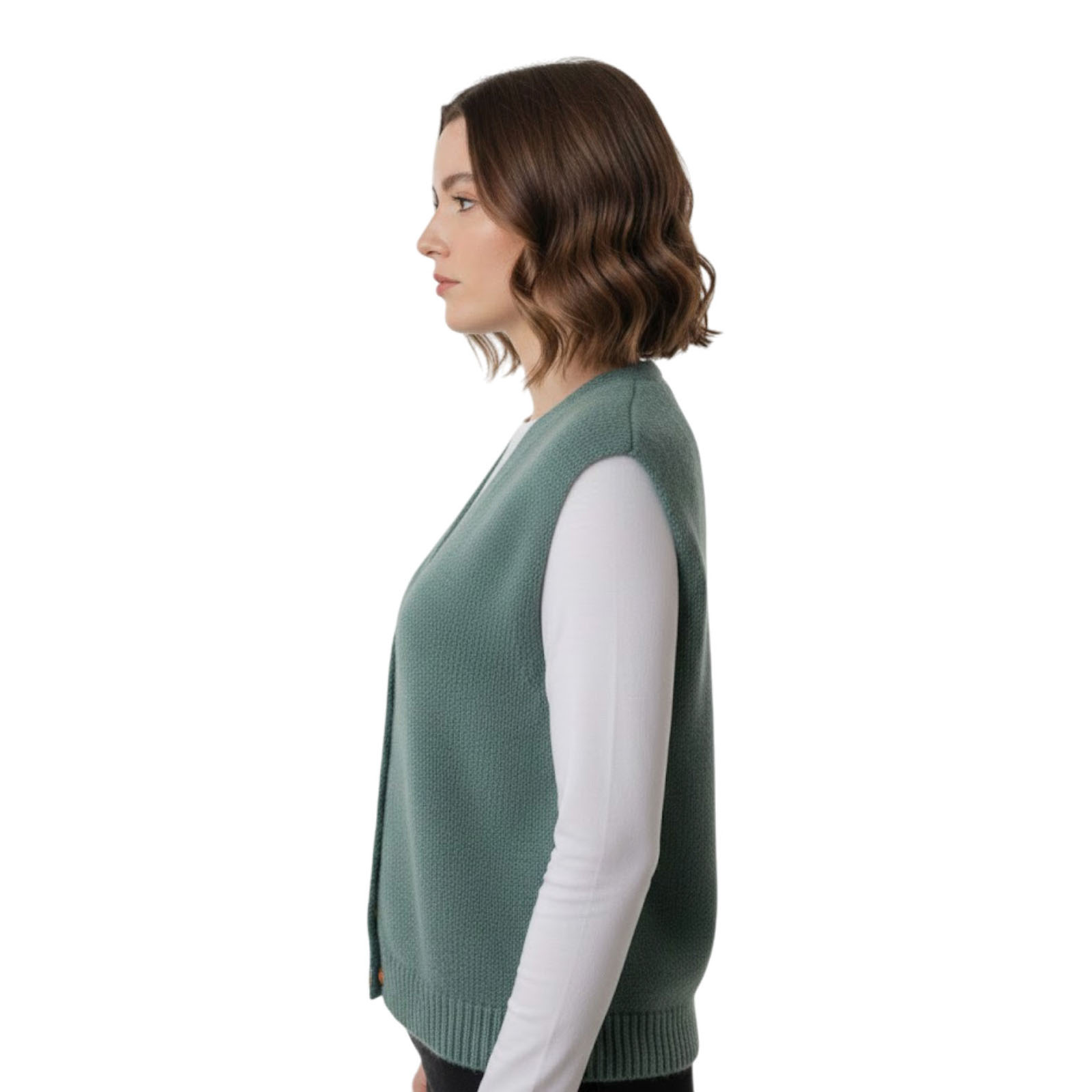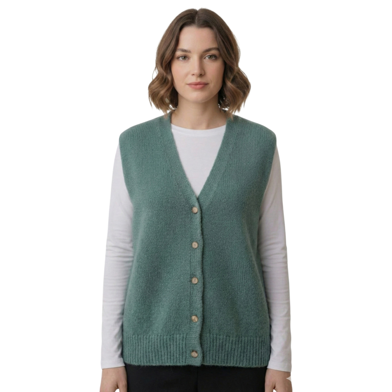 Gilets de la marque Andromède de couleur vert thé. Ce gilet avec fermeture par bouton offre une texture moelleuse et un confort idéal pour la mi-saison. Sa coupe sans manche permet une grande liberté de mouvement, tandis que le textile utilisé ajoute une touche décontractée et moderne à votre look. Parfait sur un pull col roulé ou toute autre tenue, il apporte une chaleur légère et stylée.