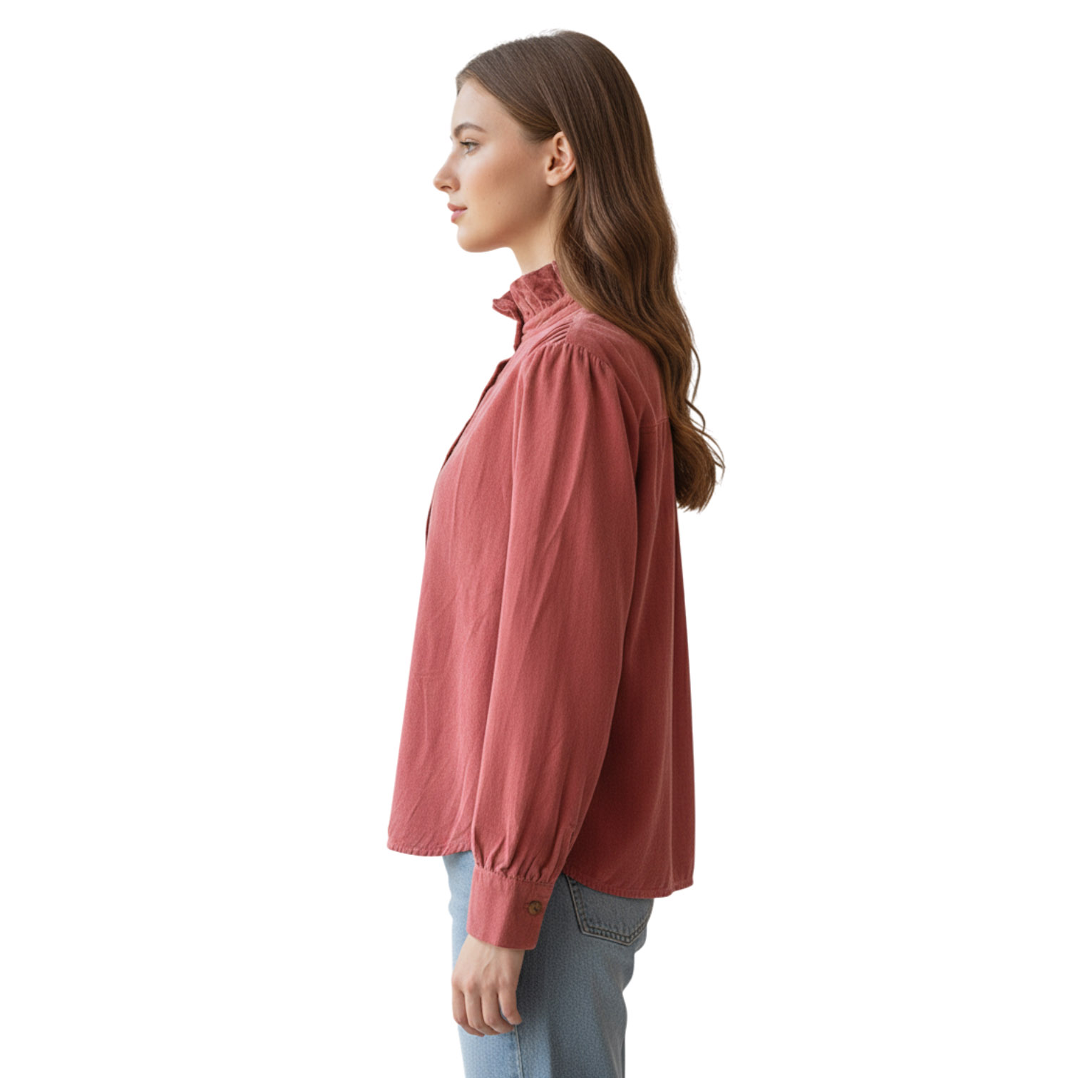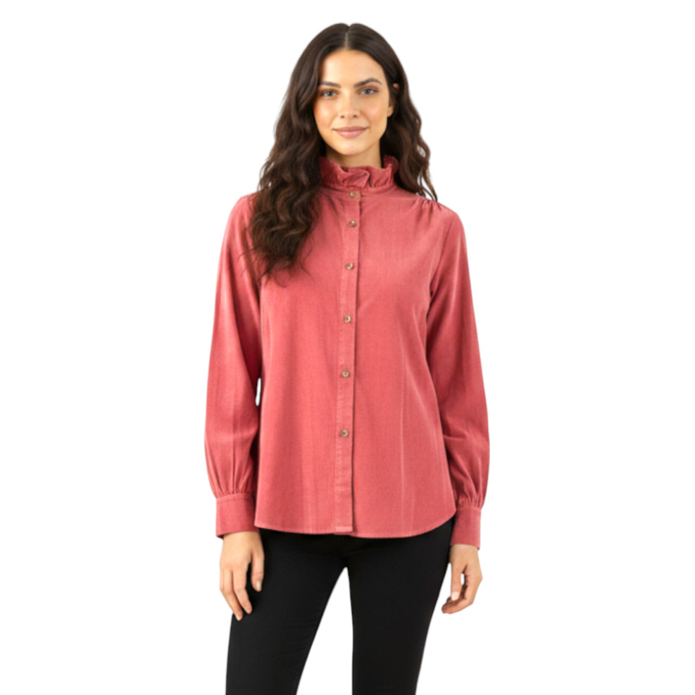 Chemisiers de la marque Andromède de couleur velours rose. Ce chemisier tendance à col montant volanté se distingue par sa matière texturée en velours côtelé qui lui confère une allure douce et chaleureuse. Sa coupe droite et confortable, agrémentée de poignets boutonnés et d'un boutonnage intégral, en fait une pièce facile à intégrer dans un look décontracté ou semi-formel. Idéal pour varier les textures en mi-saison, ce chemisier est un essentiel pour un style à la fois chic, féminin et confortable.
