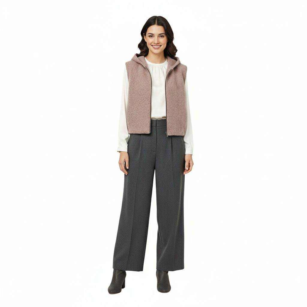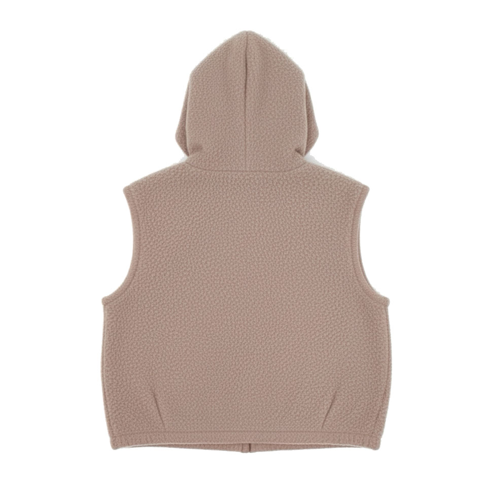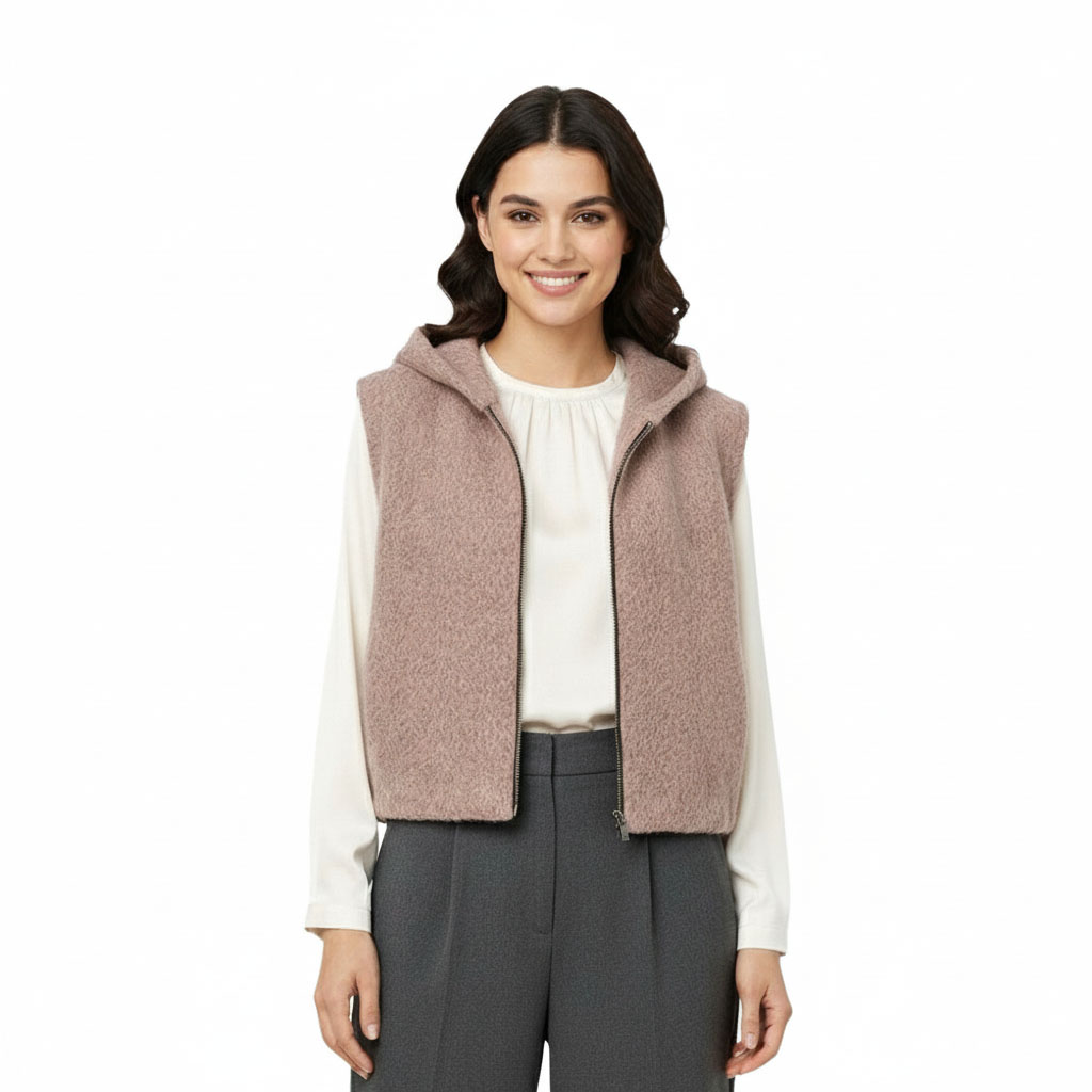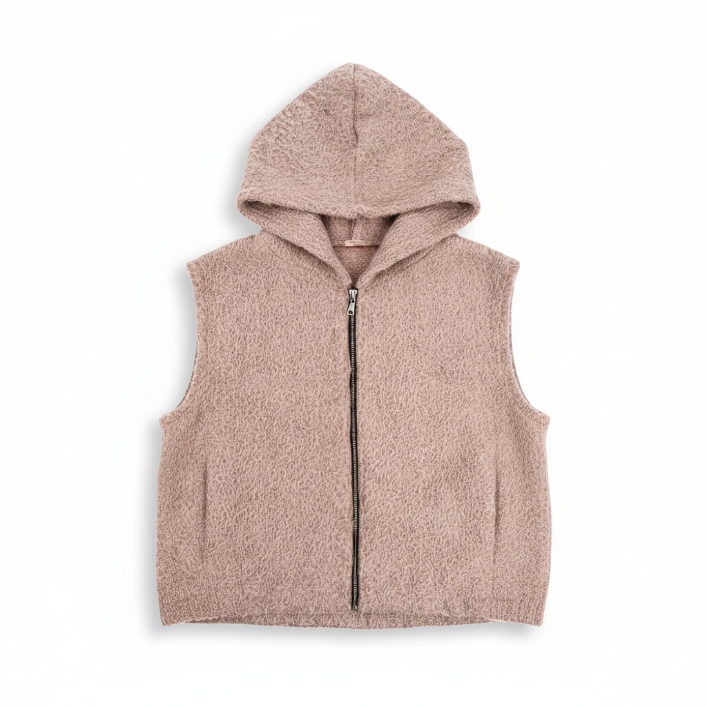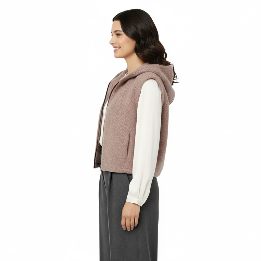 Gilets de la marque Andromède de couleur rose. Ce gilet à capuche et fermeture éclair est un essentiel pour la superposition, offrant une texture moelleuse et un confort idéal pour la mi-saison. Sa coupe sans manches permet une grande liberté de mouvement, tandis que le tissu texturé ajoute une touche décontractée et moderne à votre look. Parfait sur un pull col roulé ou toute autre tenue, il apporte une chaleur légère et stylée.