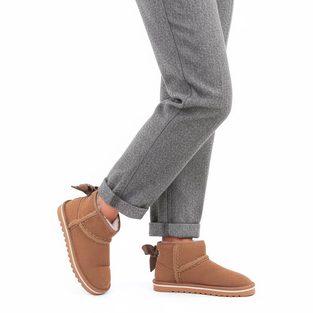 Boots Fourrées de la marque Armistice de couleur marron camel. Low boots à bout rond sur semelle en caoutchouc EVA légère, doublure chaude en textile effet lainage, une tige en cuir suédé nubuck, gros noeud tendance et chic au talon, parfaite pour un look bohème chic, boots d'hiver signées par la marque française Armistice.