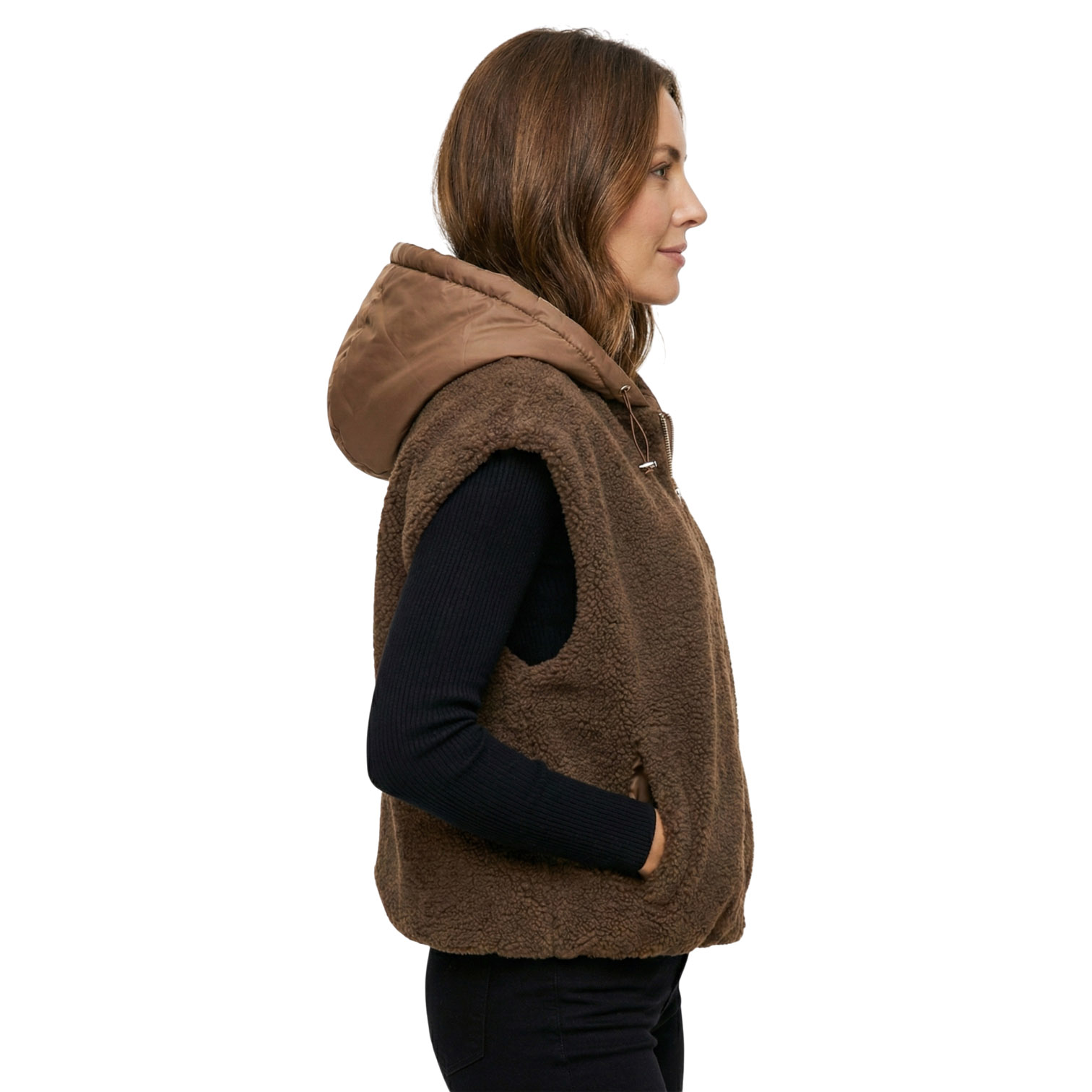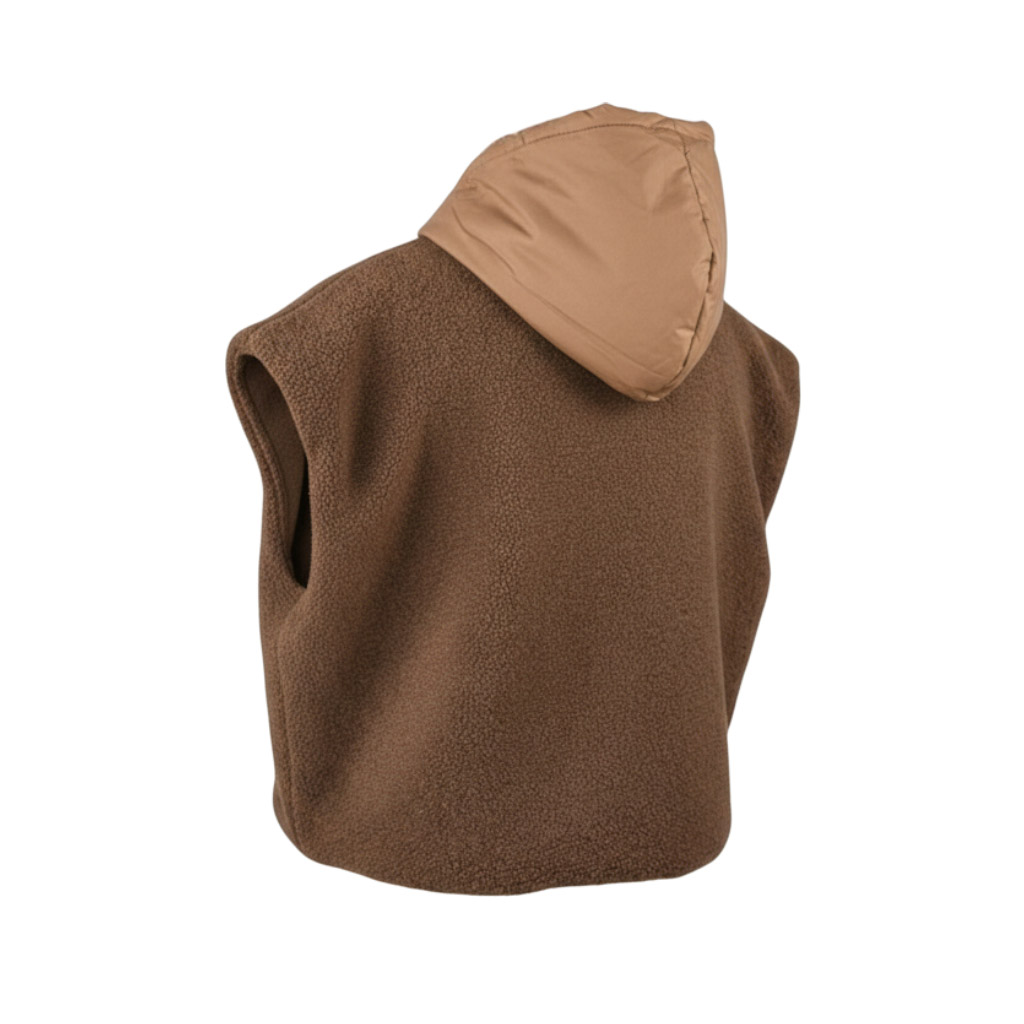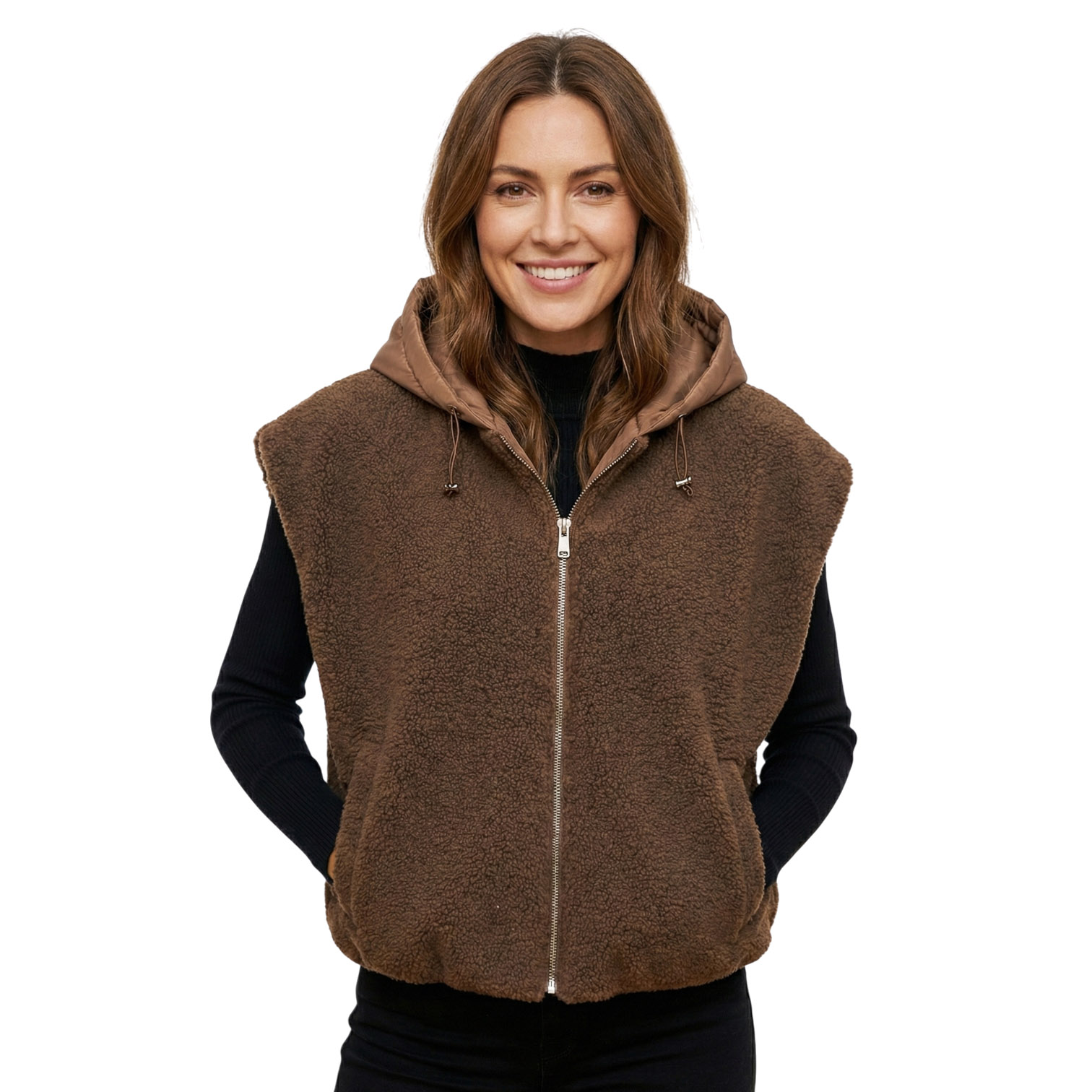 Gilets de la marque Astra de couleur marron. Craquez pour le confort de ce gilet sans manches à capuche, confectionné dans une fausse fourrure sherpa marron ultra-douce pour un look cocooning. Alliant style et fonctionnalité, cette pièce se dote d'une fermeture zippée centrale et d'une capuche ajustable par cordons pour vous protéger du froid avec modernité. Parfaite pour les jeux de superpositions, elle se porte aisément sur un pull fin ou un col roulé pour une allure hivernale décontractée et chaleureuse.