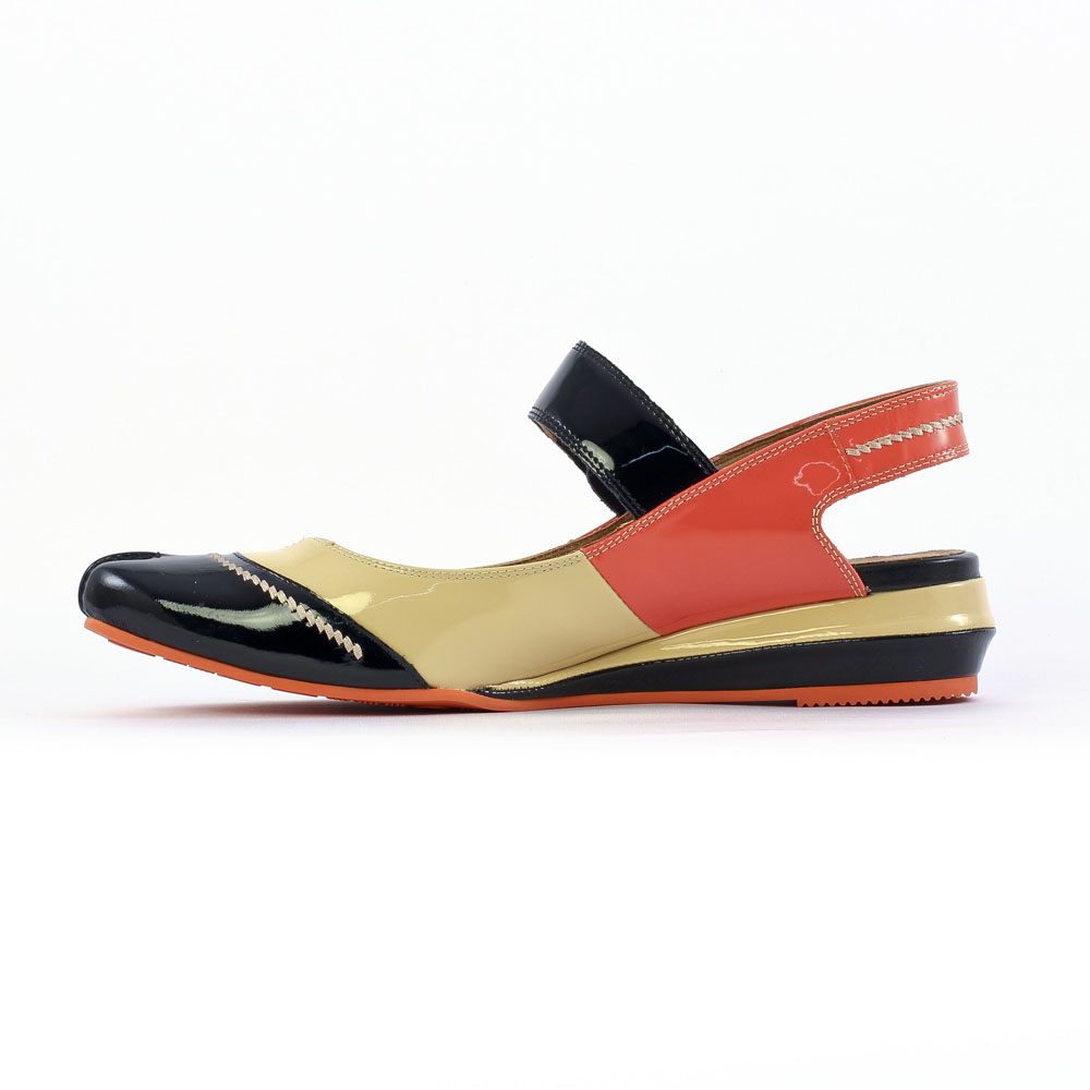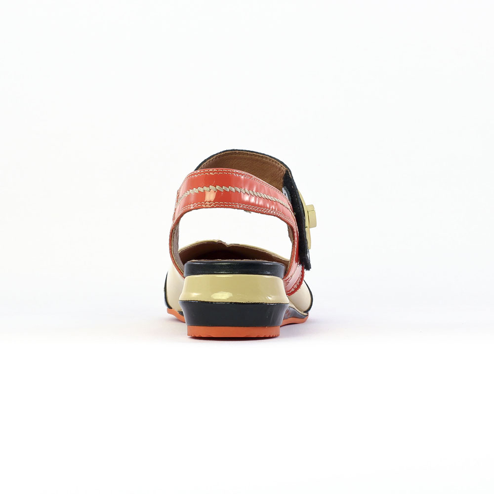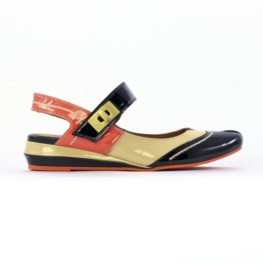 Babies Confort de la marque Mamzelle de couleur beige orange. Talon ouvert, bride à scratch, décliné en trois couleurs: noir, beige orange et blanc argent. Petit talon compensé de 4 cm. Tout cuir sur une semelle souple confortable en gomme élastomère. Confort et tendance signés Mam'zelle.