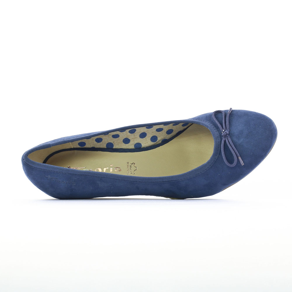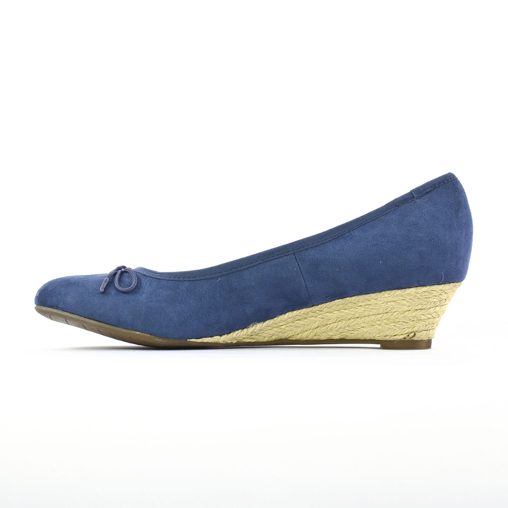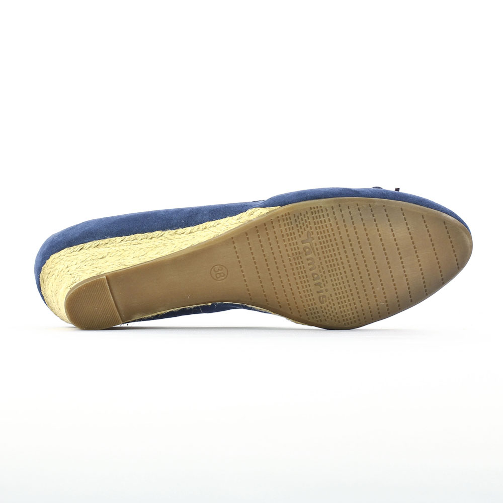 Ballerines Compensées de la marque Tamaris de couleur bleu. Chaussure compensée, tige en textile velours ras qui joue avec la lumière et rend la couleur chatoyante. Existe en rose, bleu et noir. Talon compensé en corde tendance.