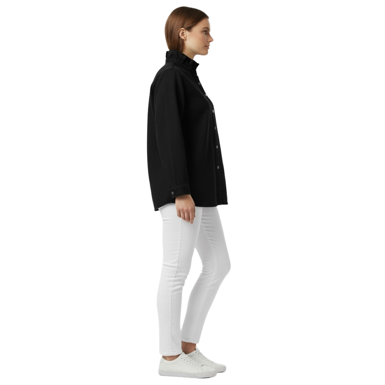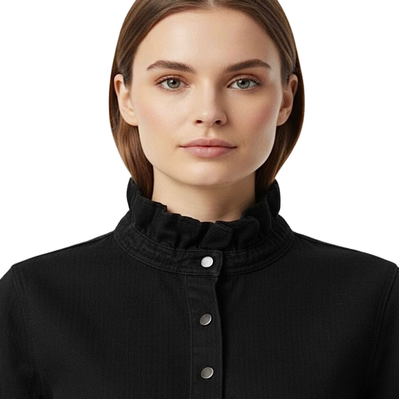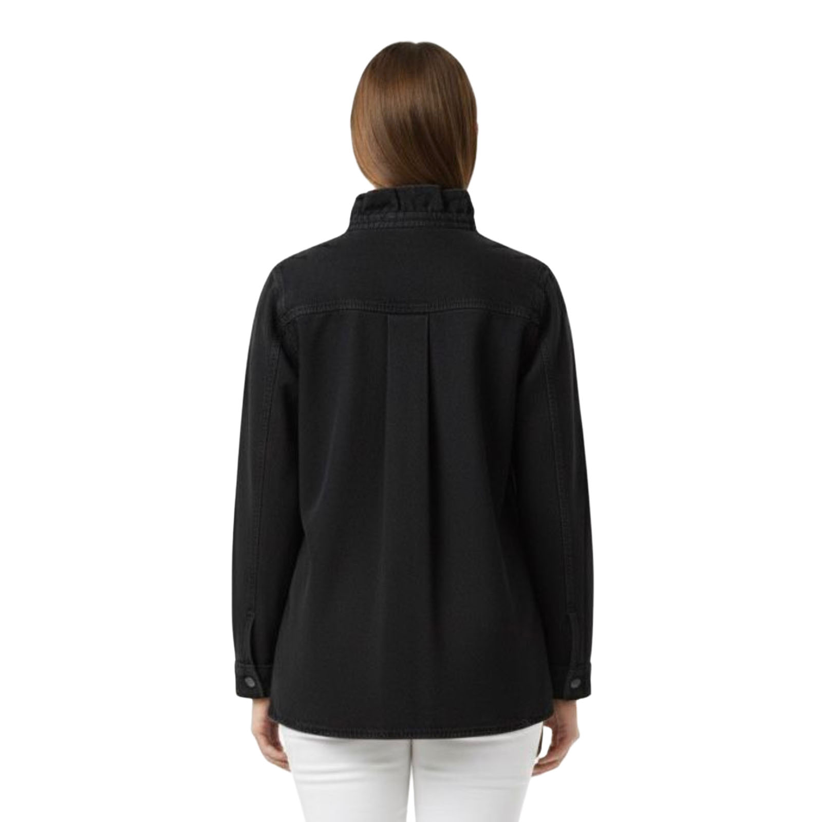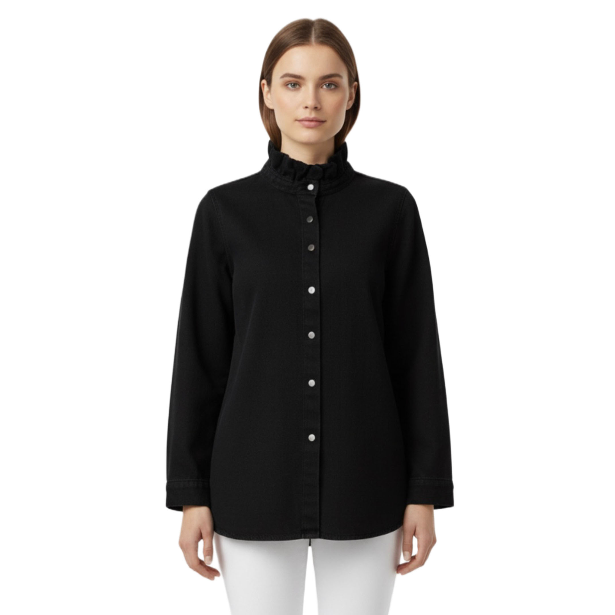 Vestes de la marque Bilibbi de couleur jean noir. Cette veste ou sur-chemise noire unie offre une touche d'élégance grâce à son col montant volanté qui apporte une féminité délicate. Confectionnée dans un tissu jean au tombé souple, elle présente une coupe classique à manches longues, rehaussée par une patte de boutonnage ornée de boutons clairs contrastants. Elle s'associe parfaitement à un pantalon blanc pour un style monochrome chic et raffiné.