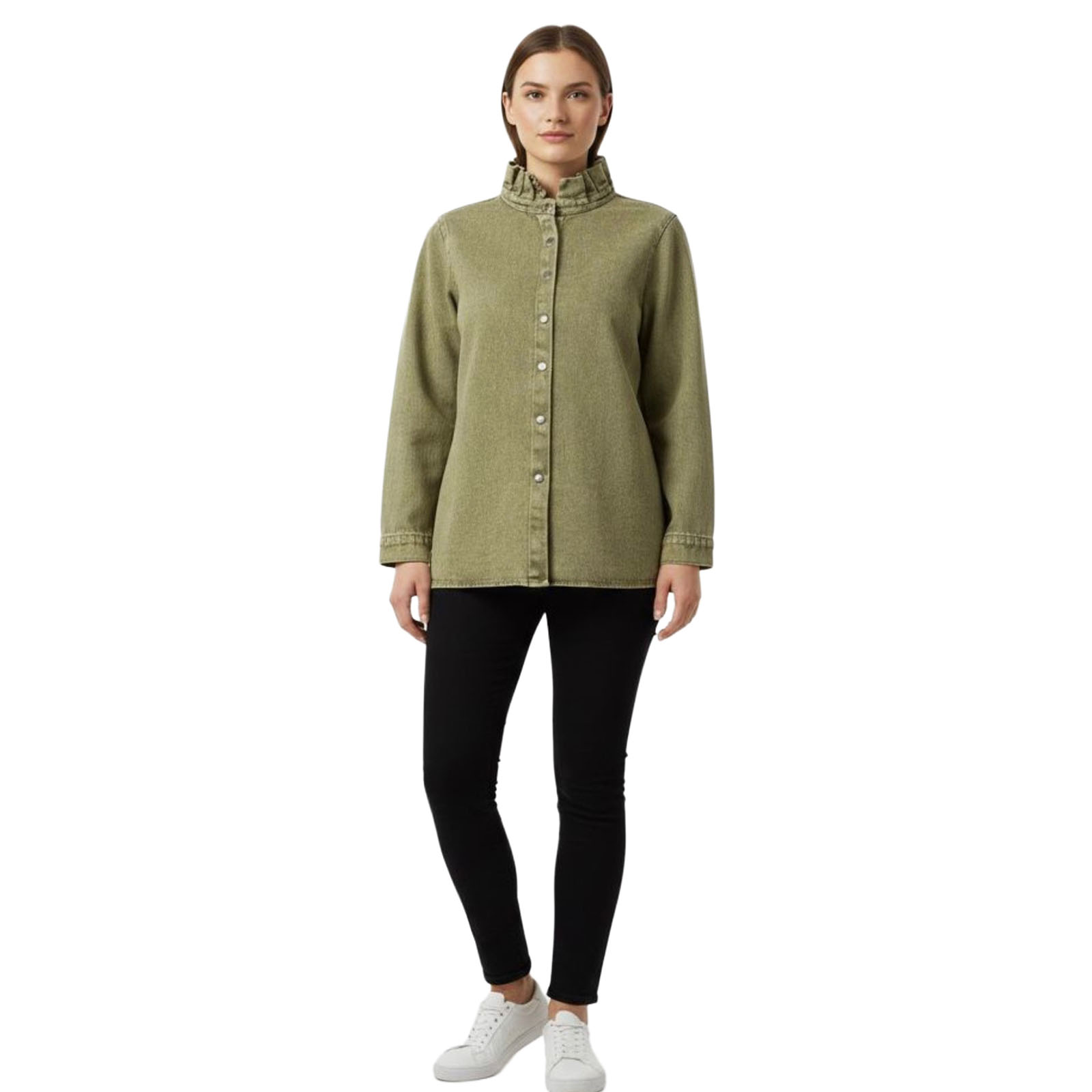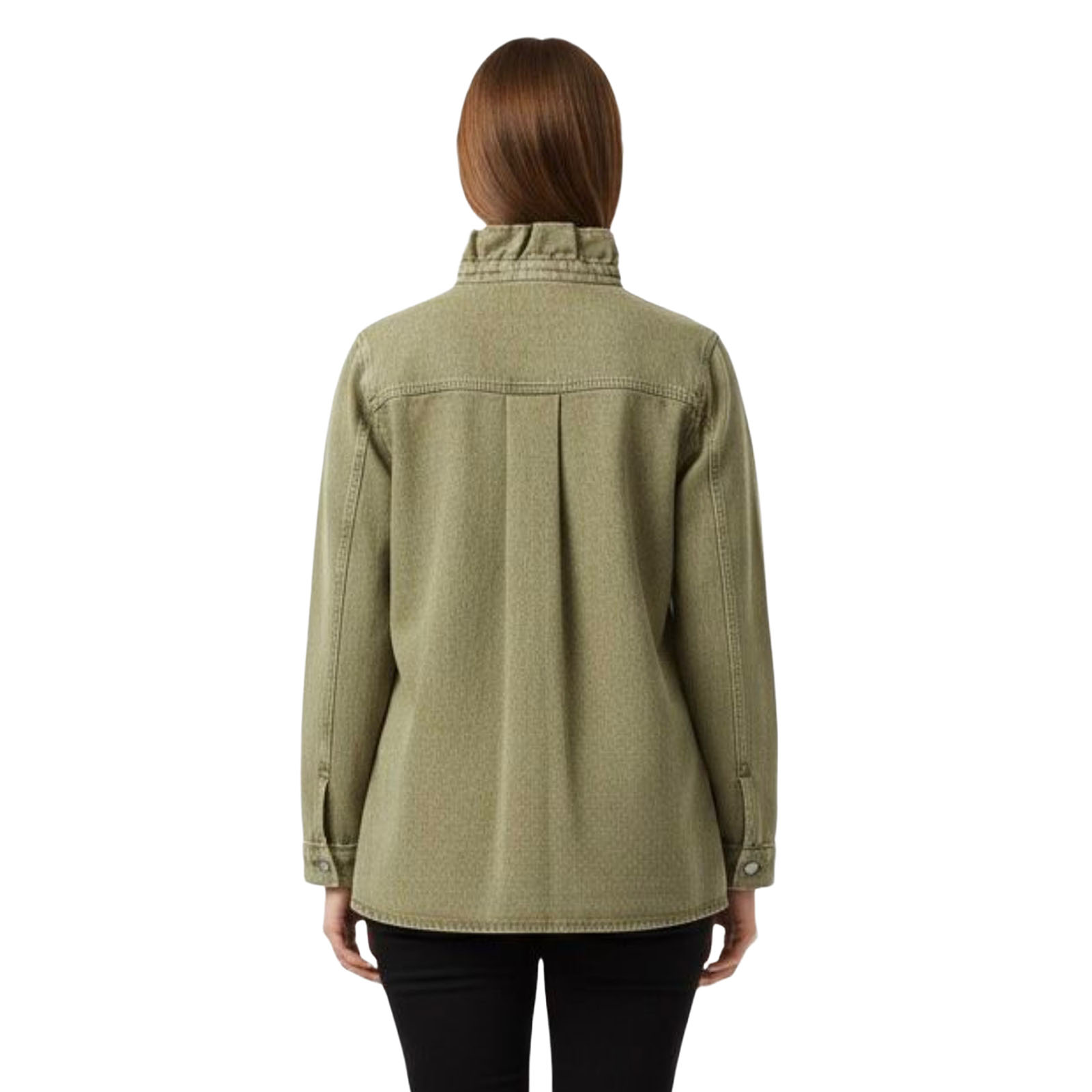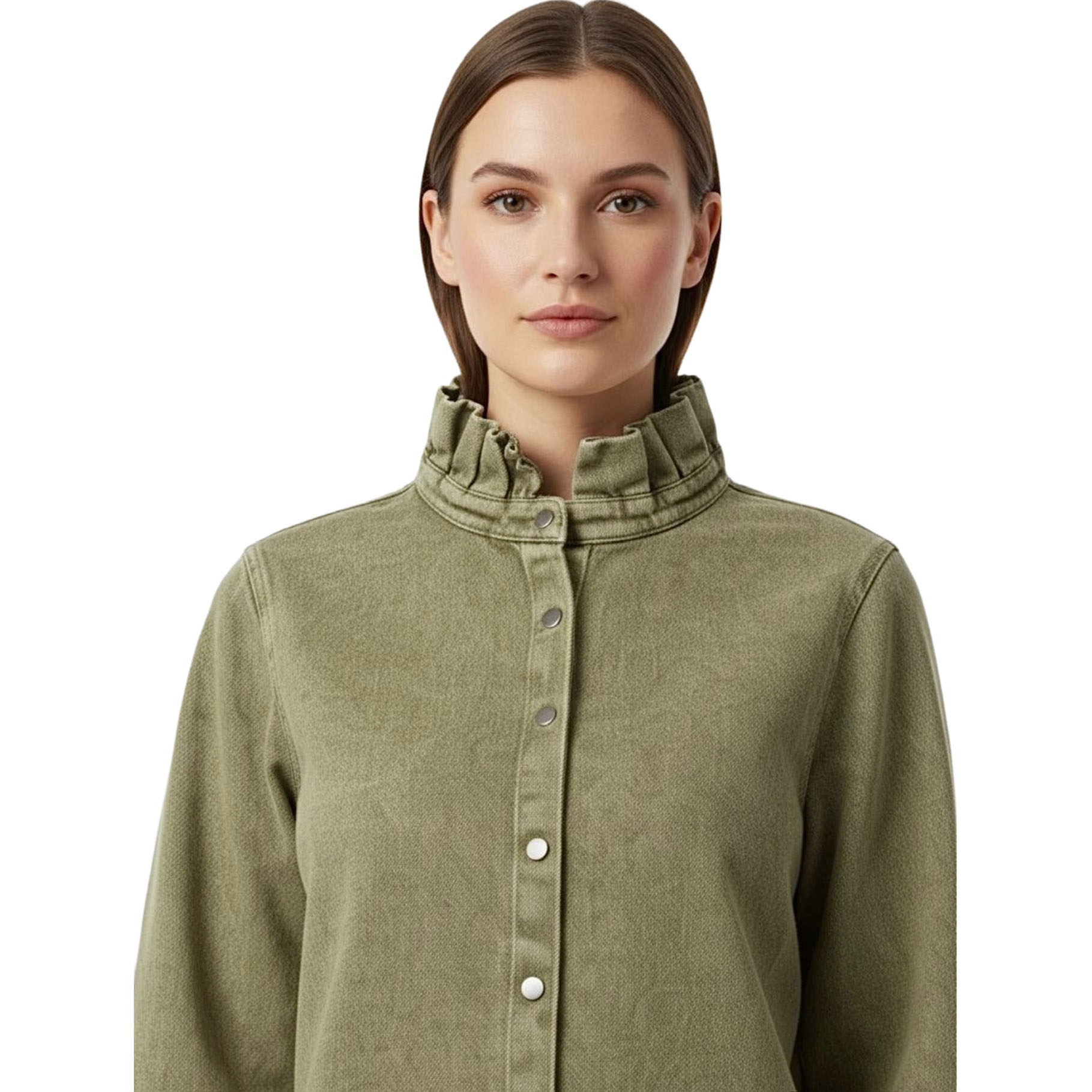 Vestes de la marque Bilibbi de couleur vert kaki. Cette veste ou sur-chemise noire unie offre une touche d'élégance grâce à son col montant volanté qui apporte une féminité délicate. Confectionnée dans un tissu jean au tombé souple, elle présente une coupe classique à manches longues, rehaussée par une patte de boutonnage ornée de boutons clairs contrastants. Elle s'associe parfaitement à un pantalon blanc pour un style monochrome chic et raffiné.