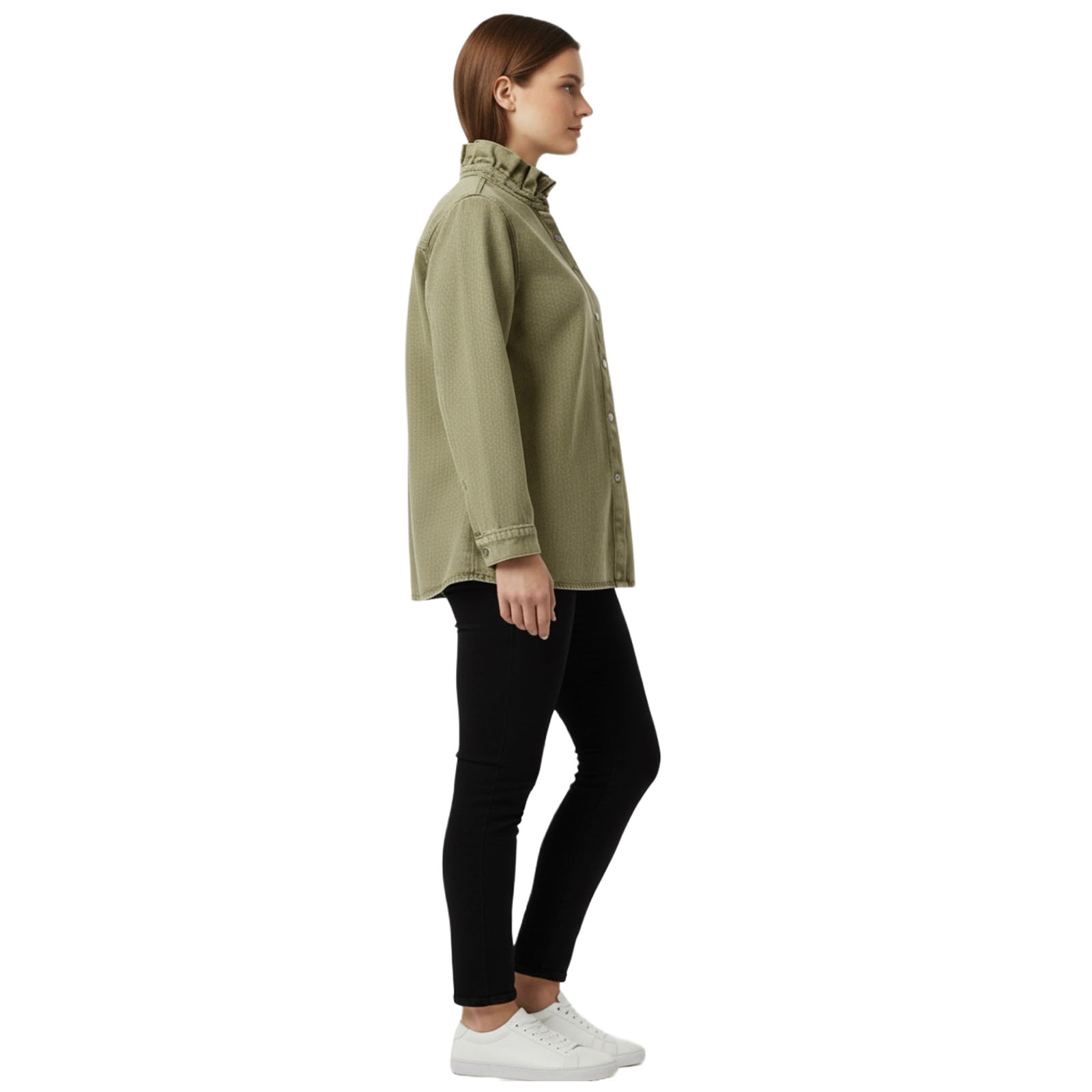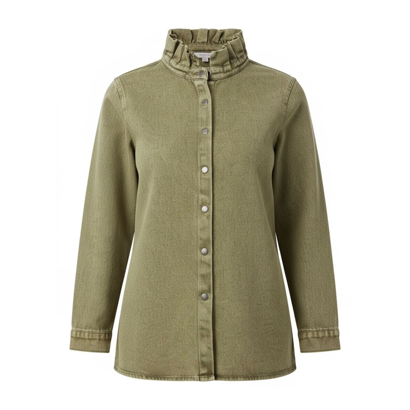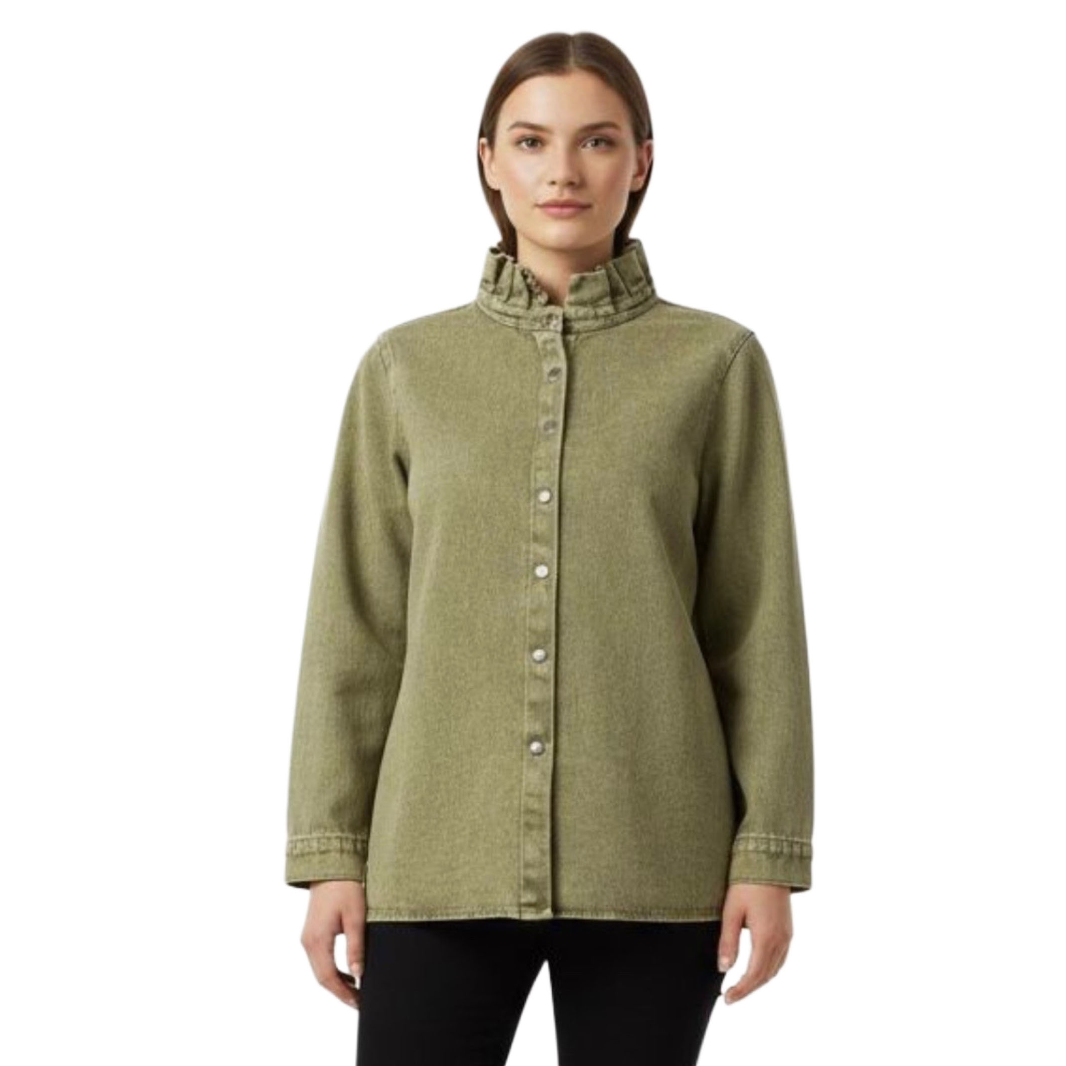 Vestes de la marque Bilibbi de couleur vert kaki. Cette veste ou sur-chemise noire unie offre une touche d'élégance grâce à son col montant volanté qui apporte une féminité délicate. Confectionnée dans un tissu jean au tombé souple, elle présente une coupe classique à manches longues, rehaussée par une patte de boutonnage ornée de boutons clairs contrastants. Elle s'associe parfaitement à un pantalon blanc pour un style monochrome chic et raffiné.