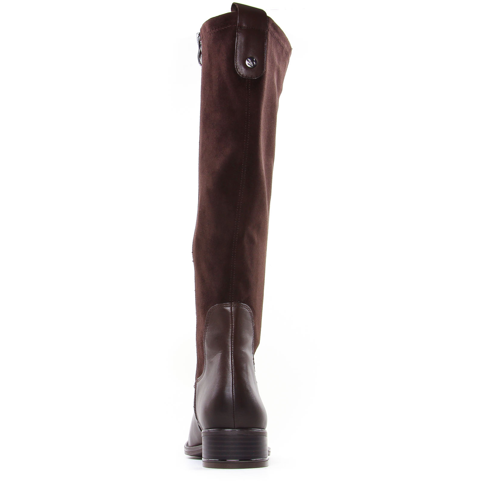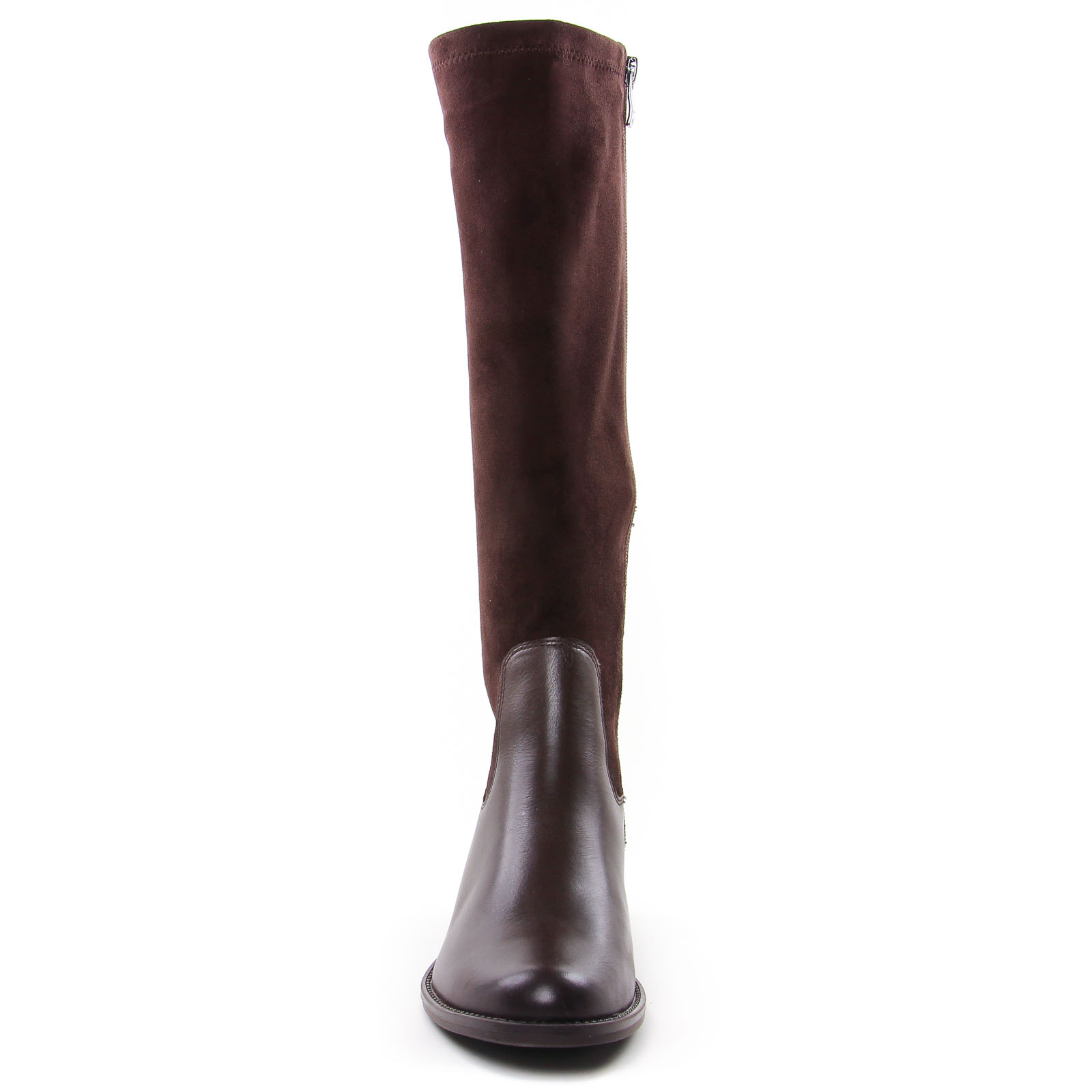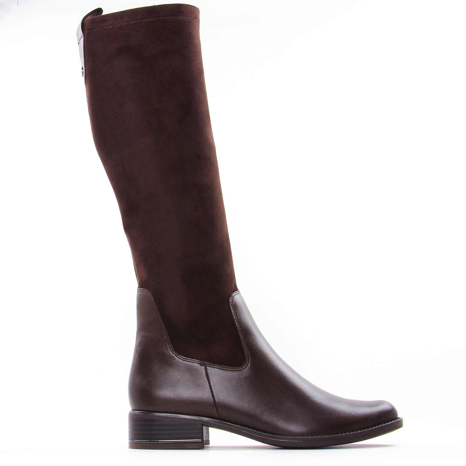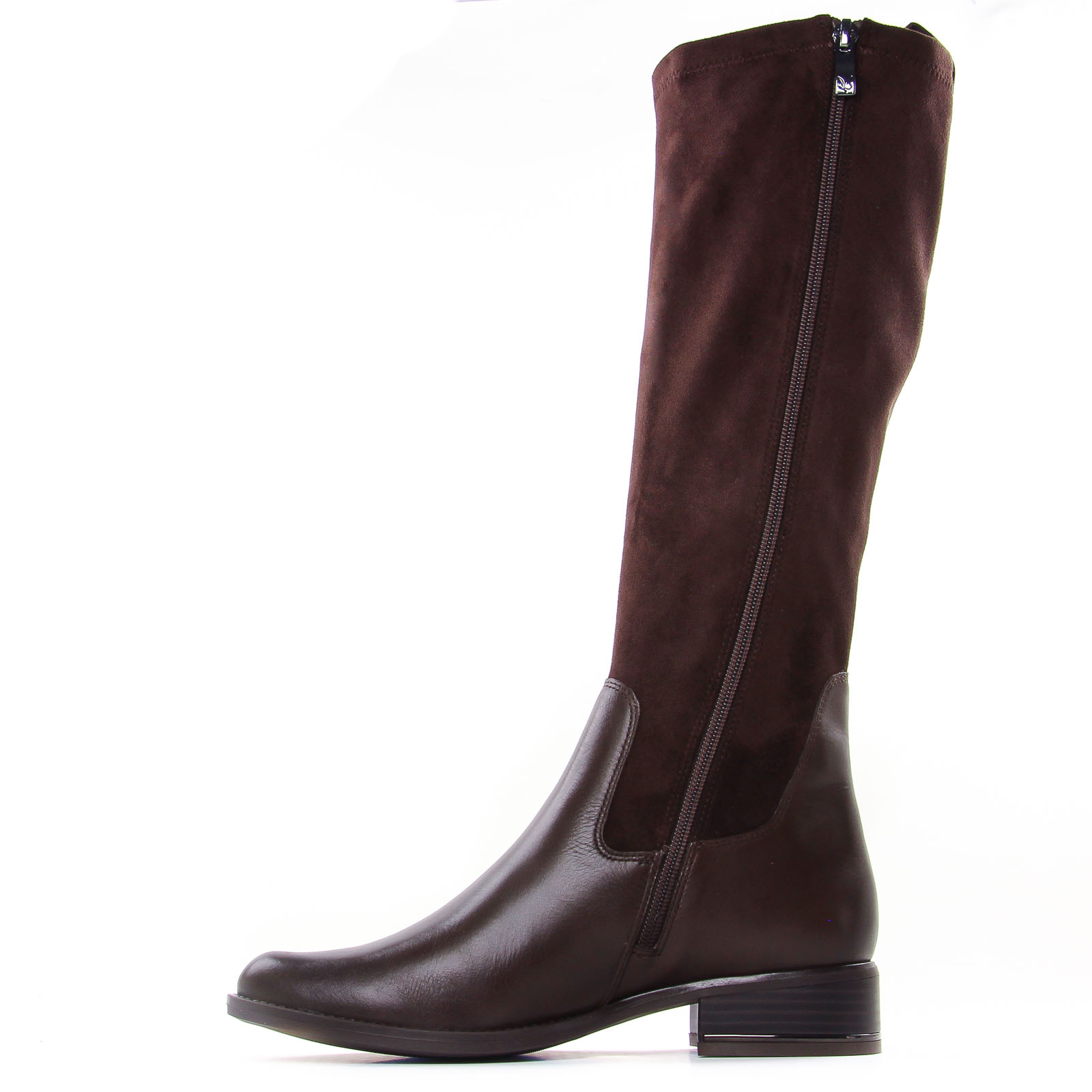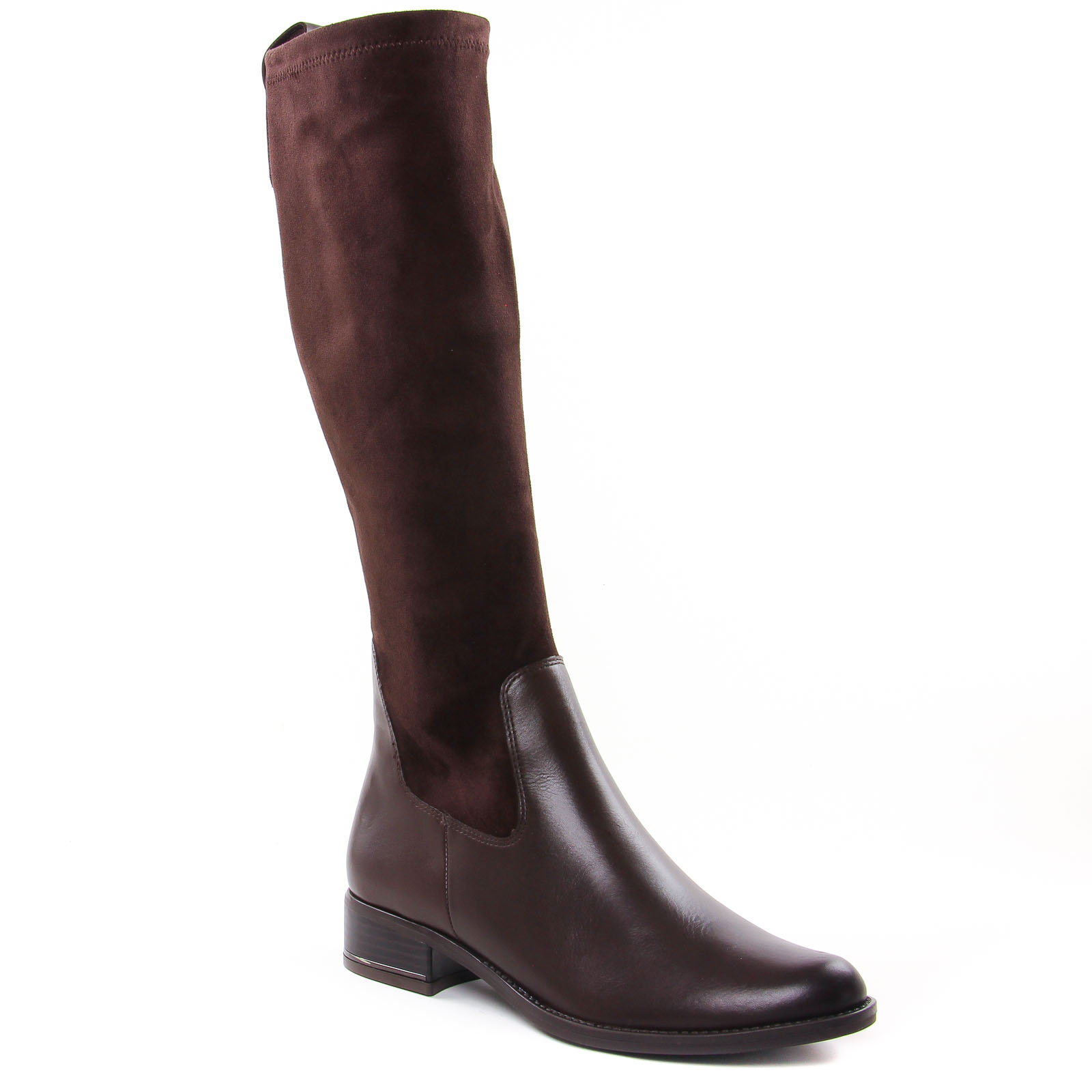 Bottes Stretch de la marque Caprice de couleur marron. Jolies bottes chics en stretch et cuir lisse marron brun ou noir, une doublure textile et une première textile, un talon plat, une tige velours noir haute de 30 cm au dessus du coup de pied, bottes signées Caprice.