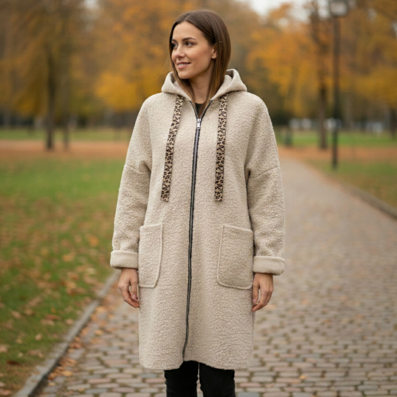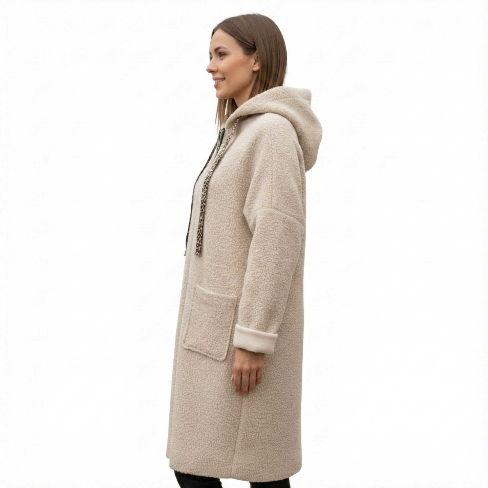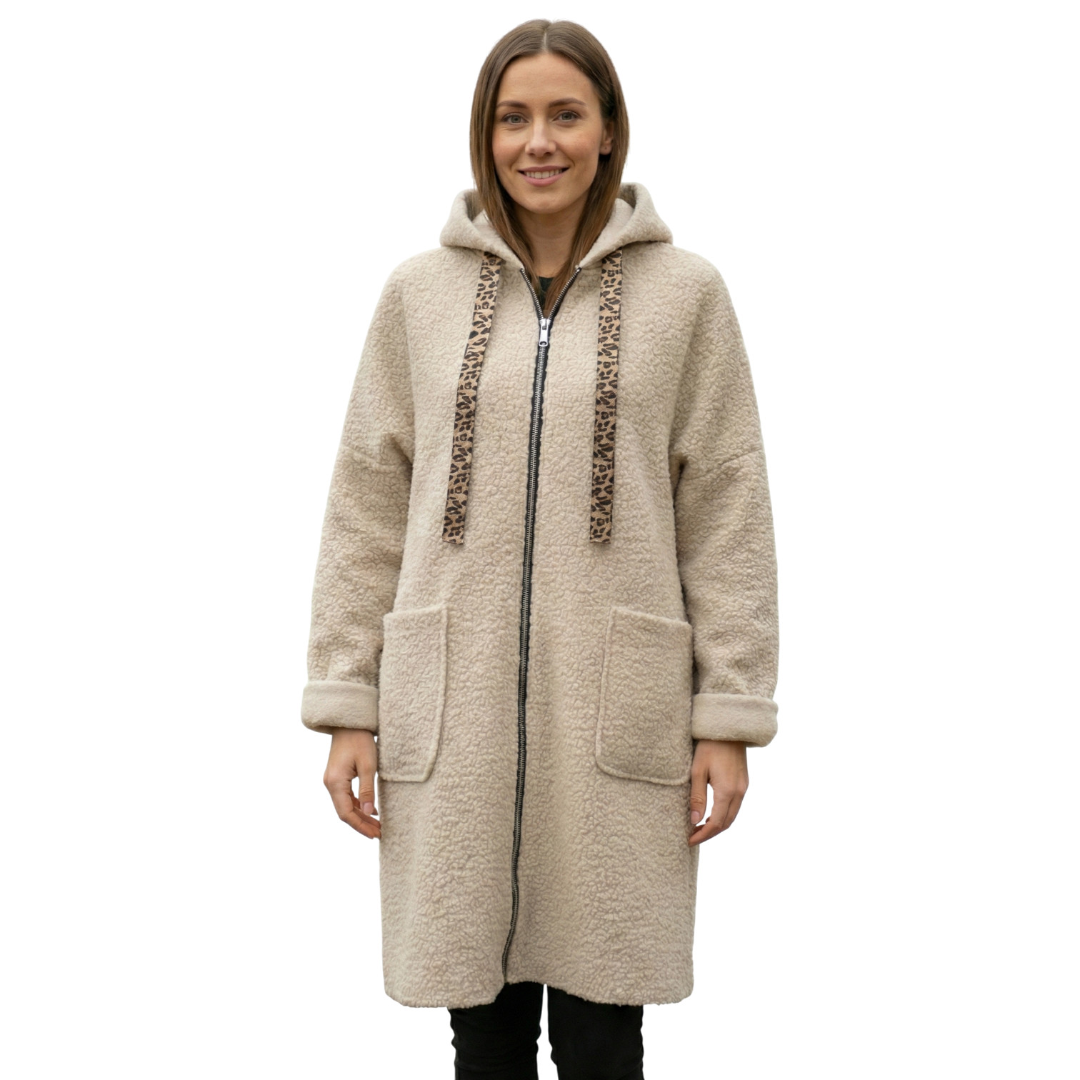 Manteaux de la marque Charmante de couleur blanc. Ce manteau long à capuche en laine polaire pour femme se distingue par sa coupe oversize très tendance et sa matière bouclée effet "teddy" qui garantit une chaleur maximale pour l'hiver. Il est doté d'une fermeture éclair centrale qui court sur toute sa longueur, élégamment rehaussée par un galon décoratif à motif léopard sur les bordures et la capuche, lui conférant un style street-chic original. Pièce maîtresse pour une allure décontractée et enveloppante, ce modèle est idéal pour associer confort moderne et une touche de caractère affirmé dans vos tenues.