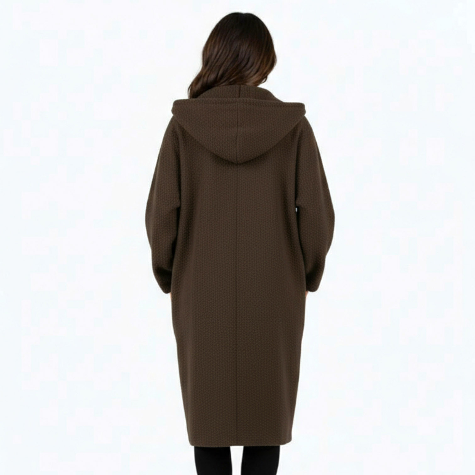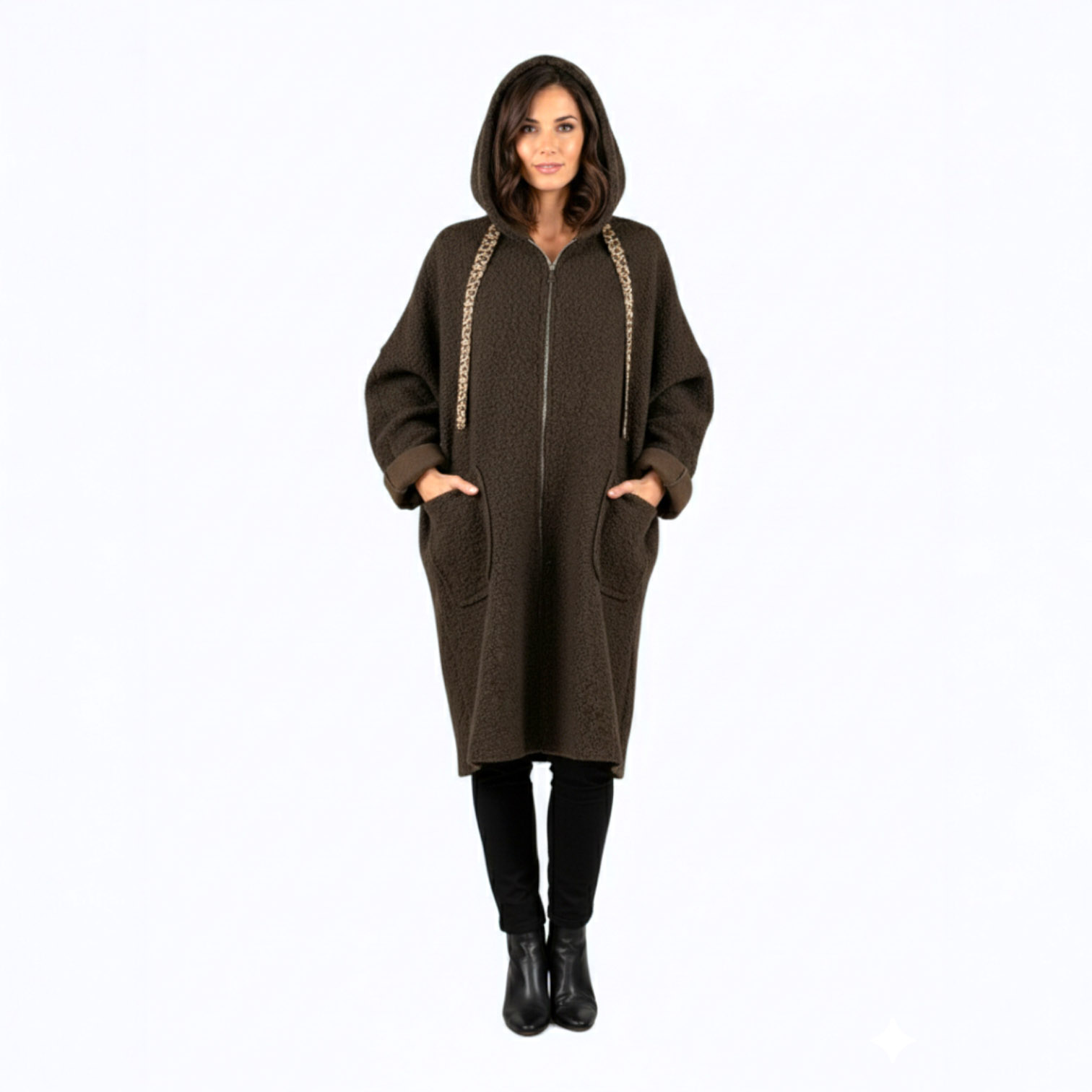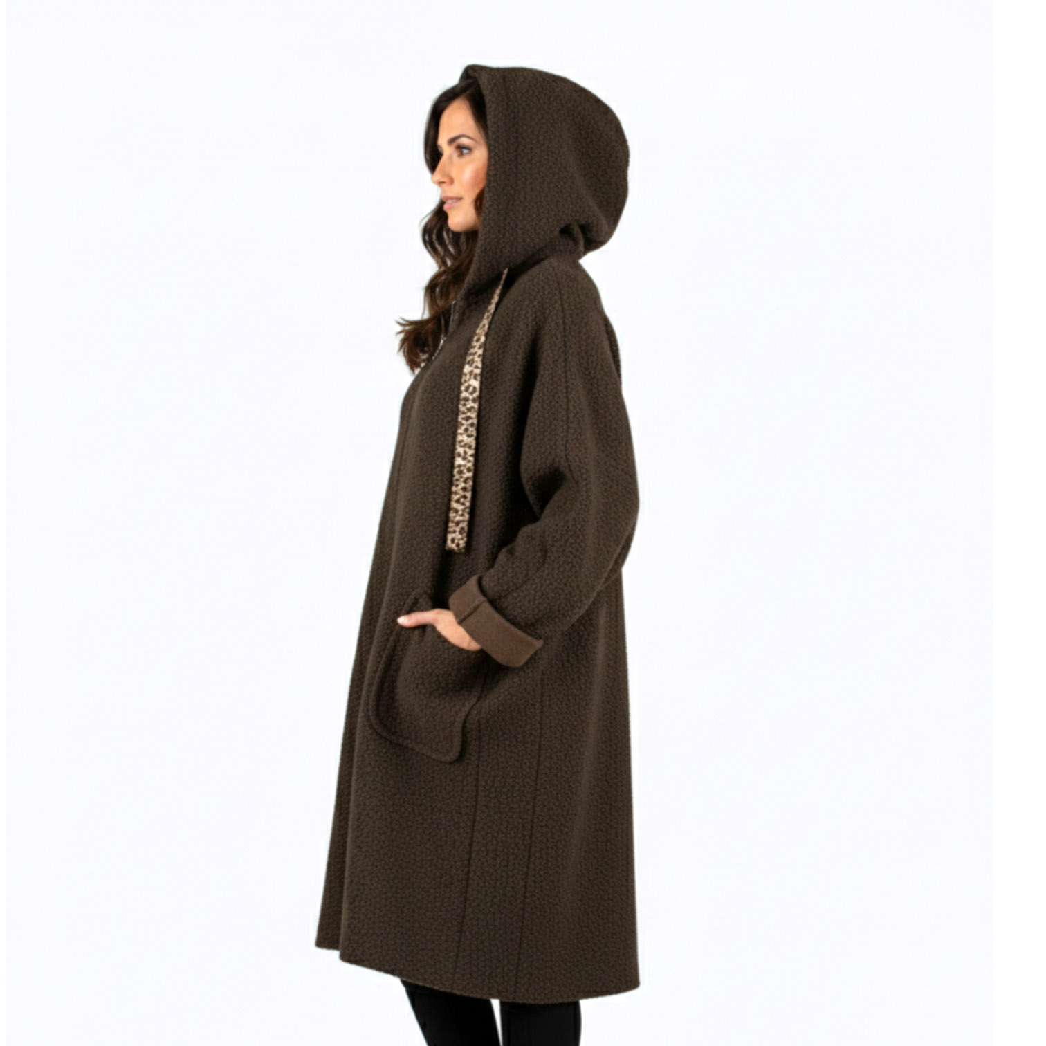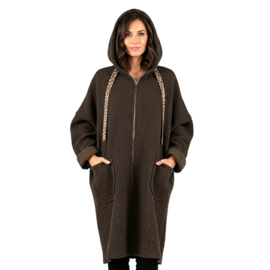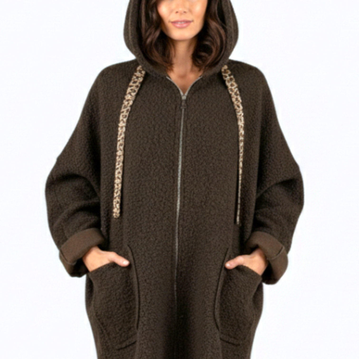 Manteaux de la marque Charmante de couleur marron. Ce manteau long à capuche en laine polaire pour femme se distingue par sa coupe oversize très tendance et sa matière bouclée effet "teddy" qui garantit une chaleur maximale pour l'hiver. Il est doté d'une fermeture éclair centrale qui court sur toute sa longueur, élégamment rehaussée par un galon décoratif à motif léopard sur les bordures et la capuche, lui conférant un style street-chic original. Pièce maîtresse pour une allure décontractée et enveloppante, ce modèle est idéal pour associer confort moderne et une touche de caractère affirmé dans vos tenues.