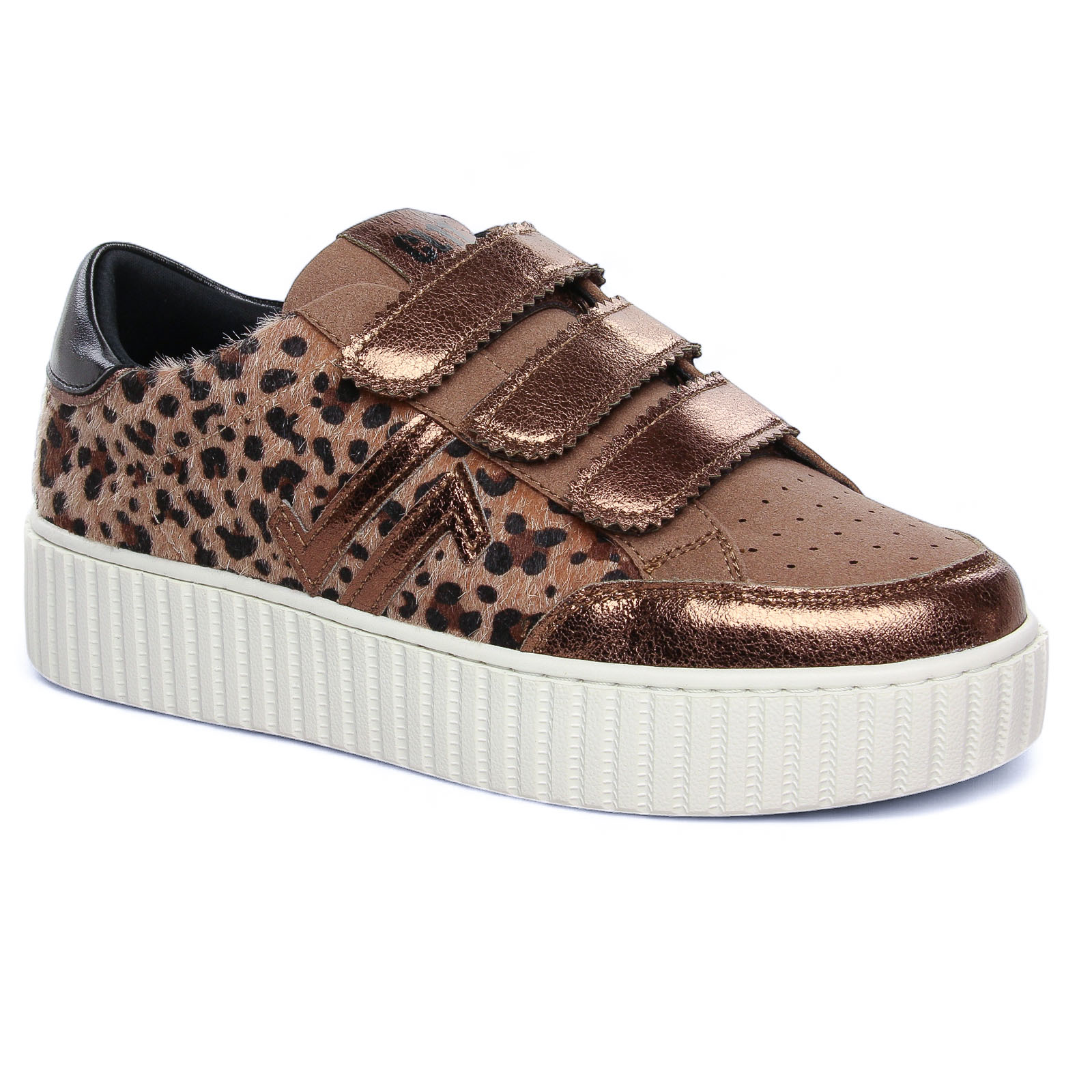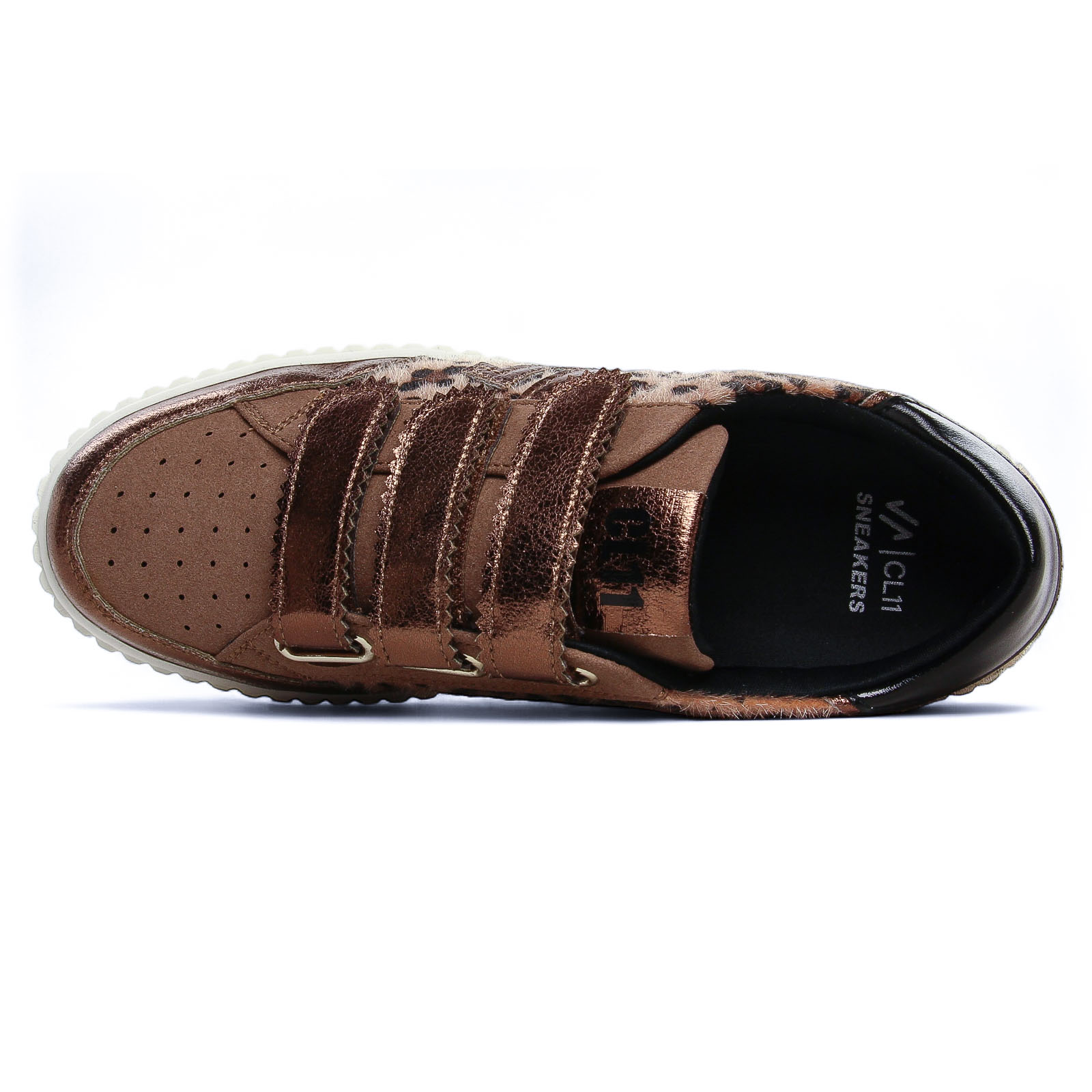 Baskets Mode de la marque Cl11 de couleur marron. Tennis mode plateforme avec un triple velcros métallisés, une première textile amovible si besoin, une touche de glamour un insert léopard, une semelle blanche.