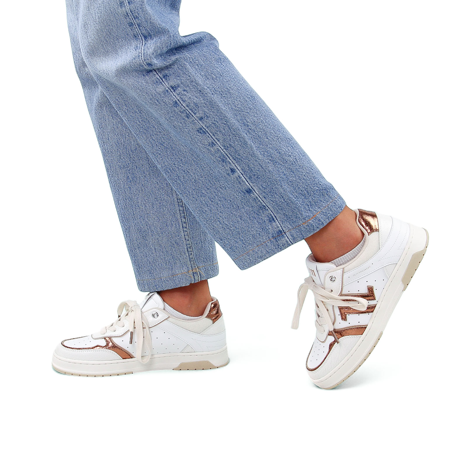 Tennis de la marque Cl11 de couleur blanc bronze. Tennis habillées, parfaites pour une touche mode sporty chic, un liseré, contrefort dorés ainsi que le logo CL11 Sneakers, bout rond à lacet.