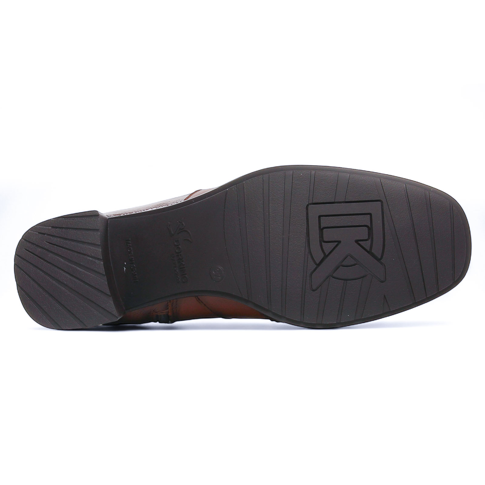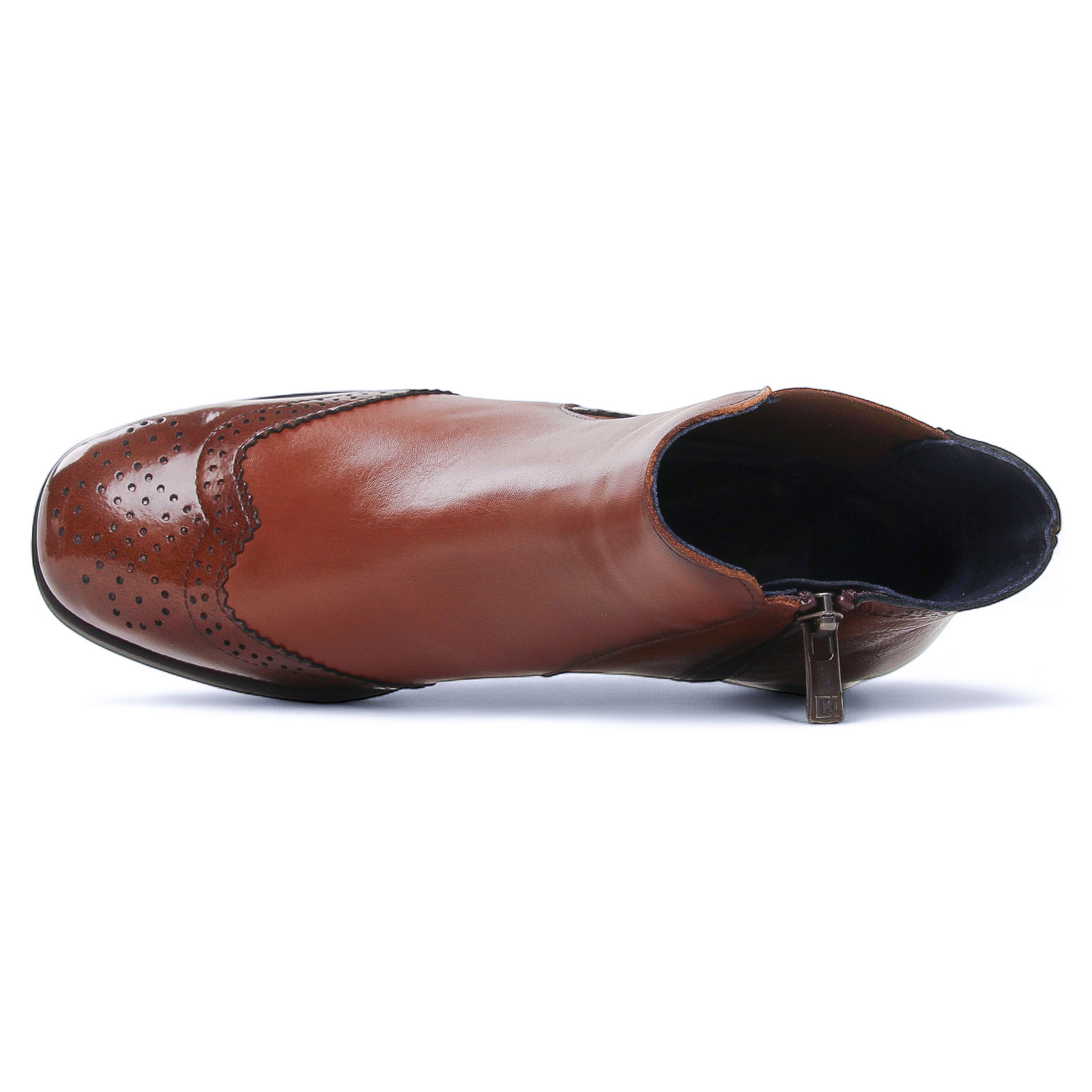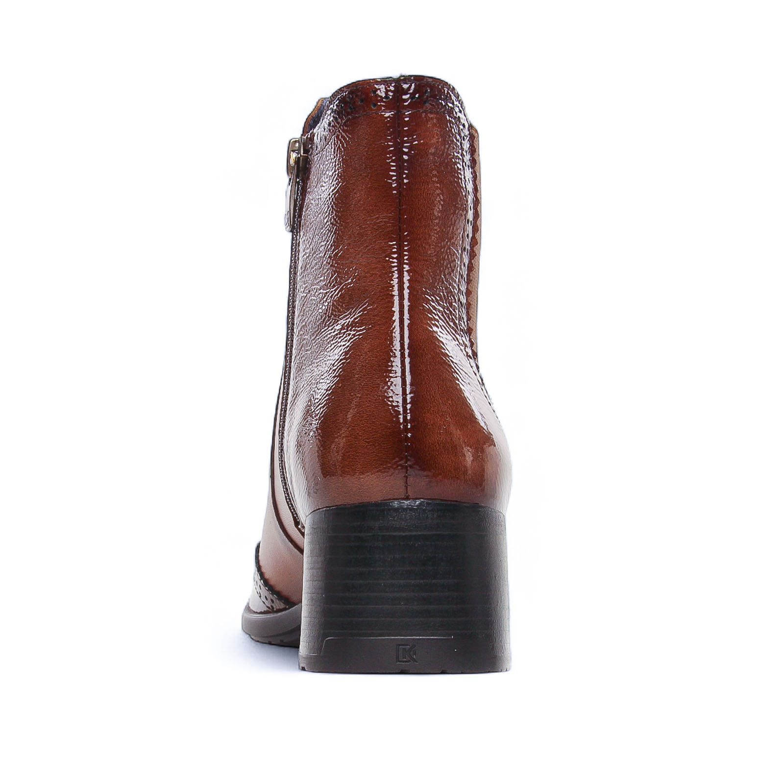 Boots Élastiquées de la marque Dorking de couleur marron. Élégantes et chics bottines style Chelsea en cuir lisse en vernis, disponible en marron cognac cette nouvelle collection Dorking by Fluchos, un talon bloc haut de 5 cm, un bout fin très féminin, une fermeture éclair pour une chausse facile, une semelle fine noir en gomme élastomère souple.