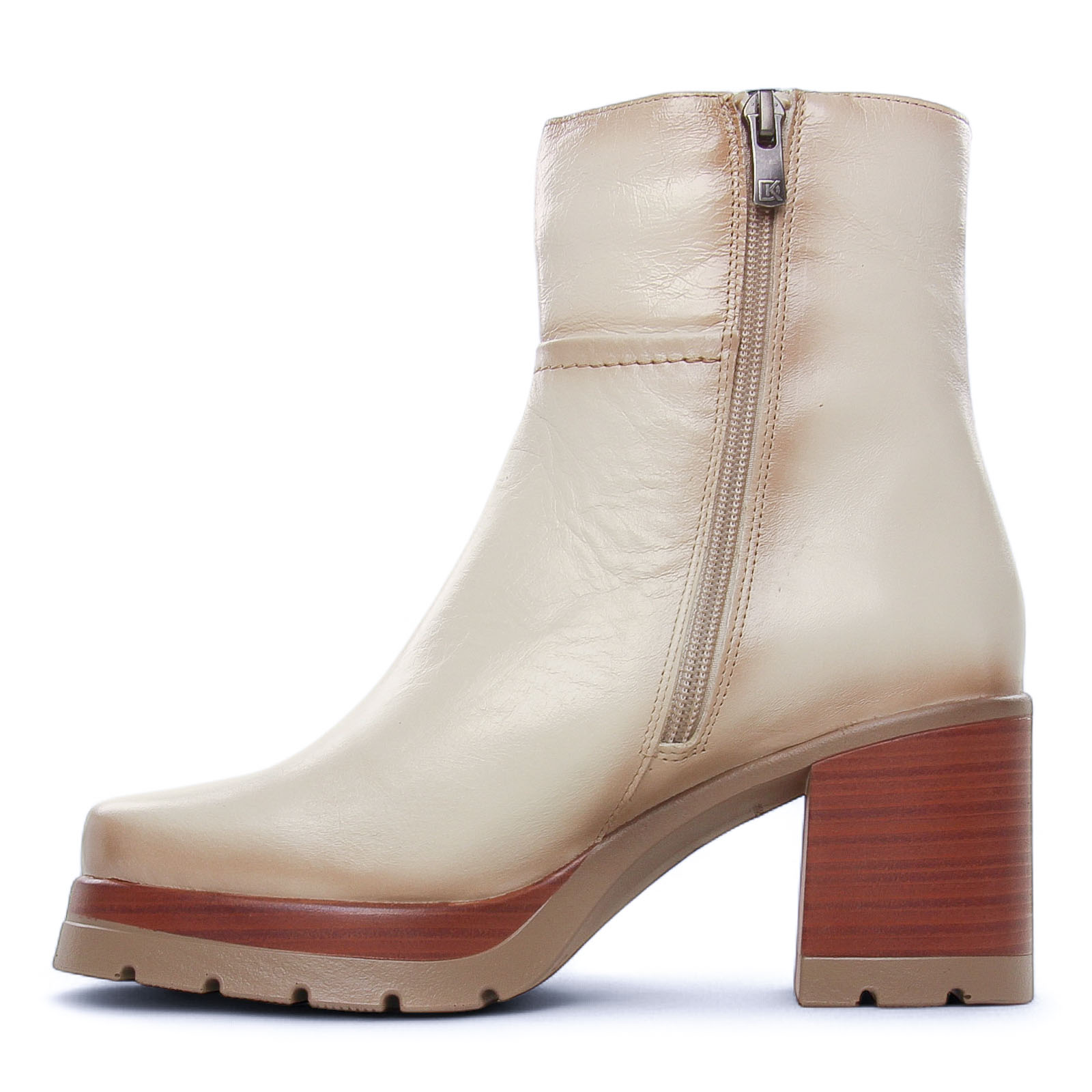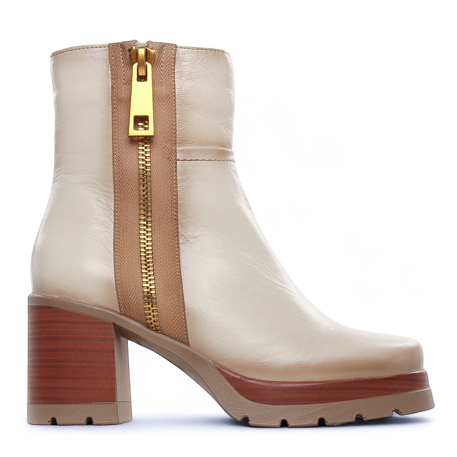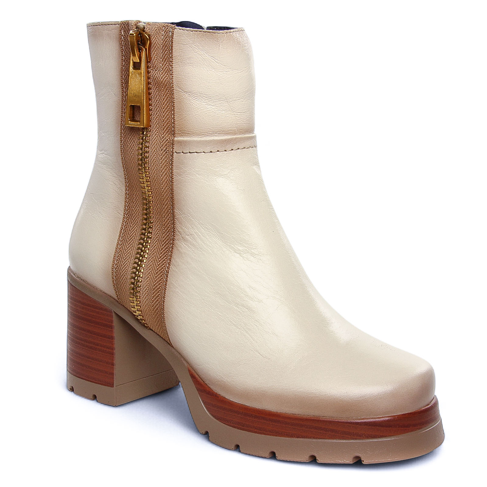 Bottines À Talon de la marque Dorking de couleur blanc creme. Hyper glamours et élégantes, ces bottines à talon haut en cuir lisse crème auront une place de choix dans votre garde robe, boots signées Dorking by Fluchos, un talon bloc haut de 6 cm, un bout rond, une fermeture éclair fantaisie dorée, un zip coté intérieur pour une chausse facile, une semelle plateau haute de 2.5 cm à l'avant marron en gomme élastomère souple.