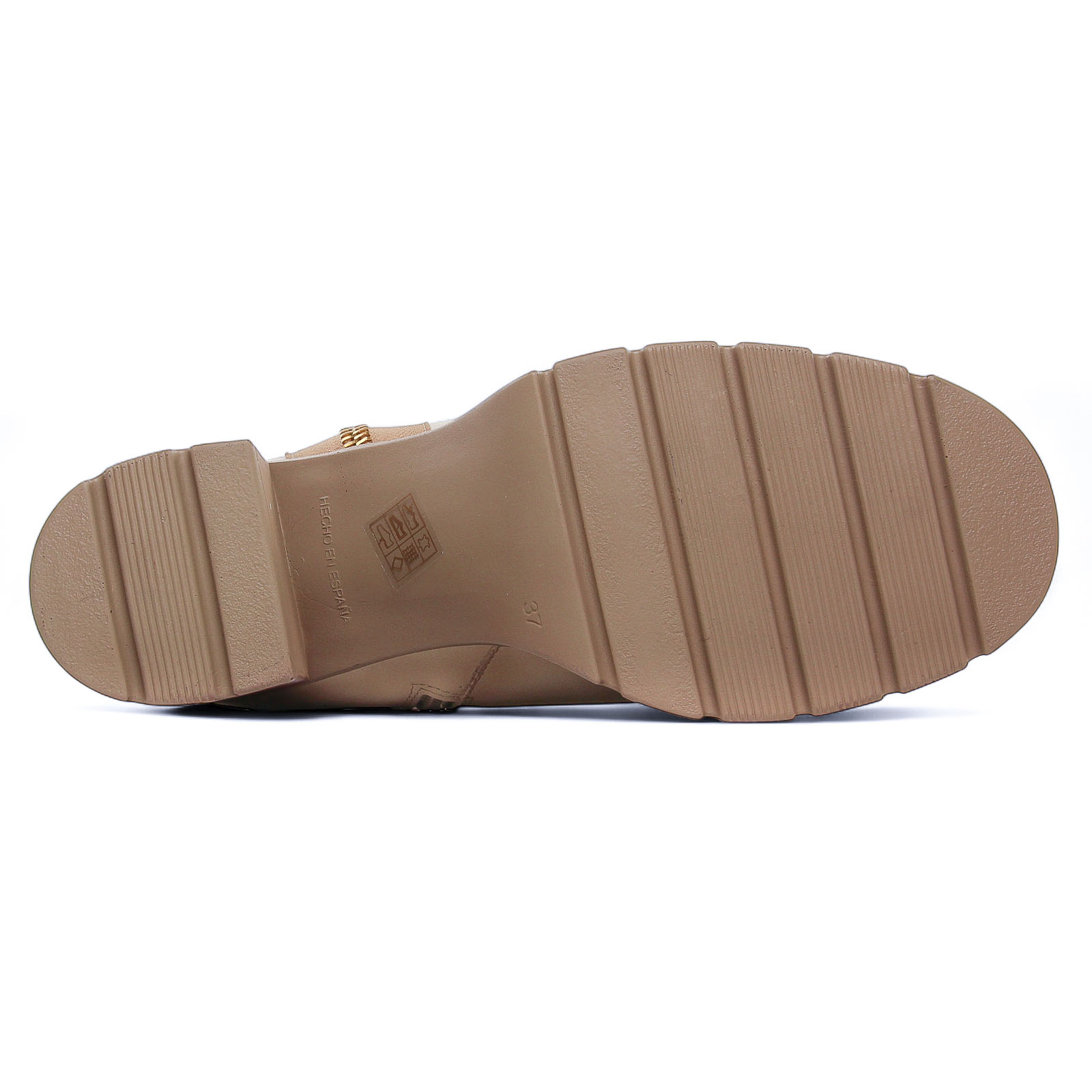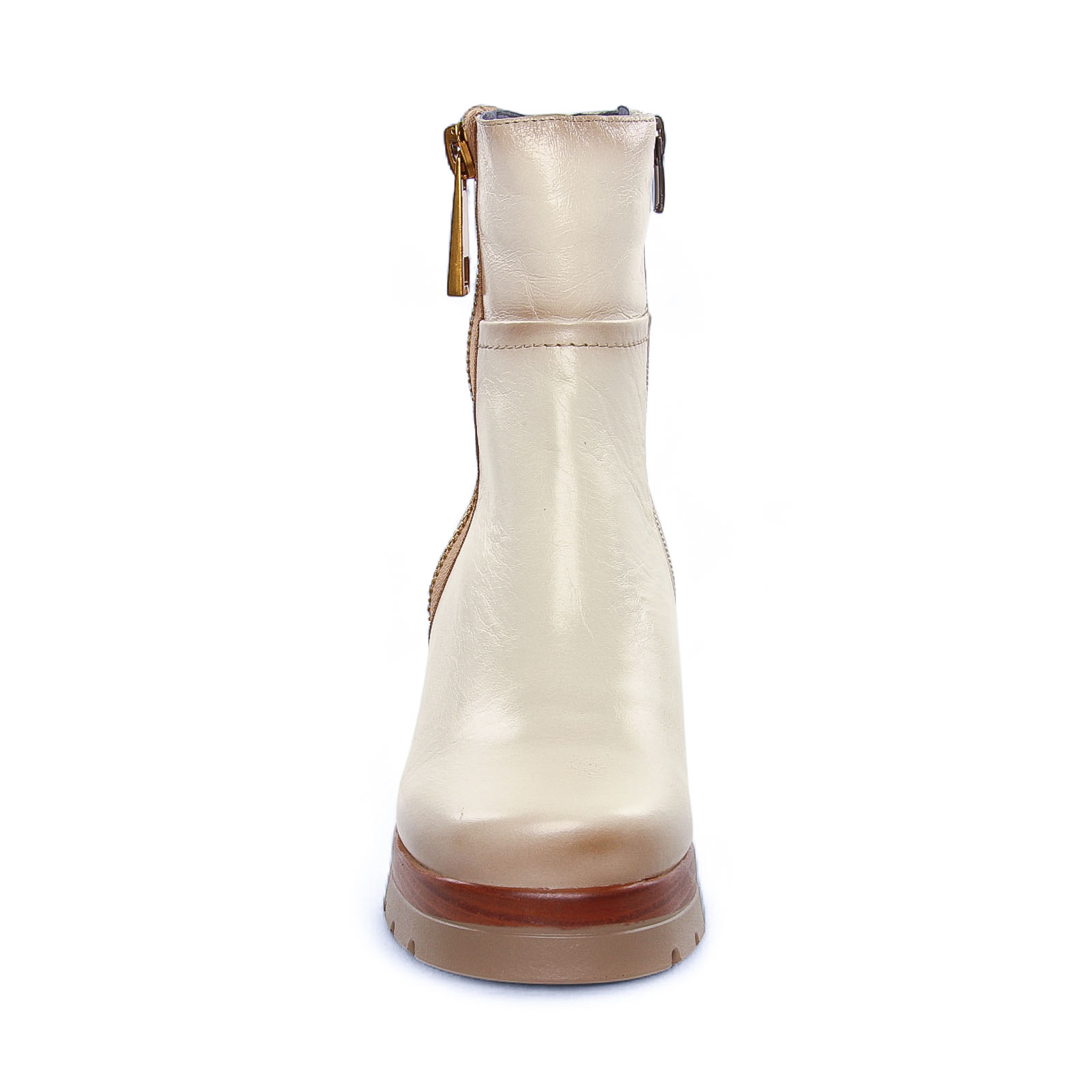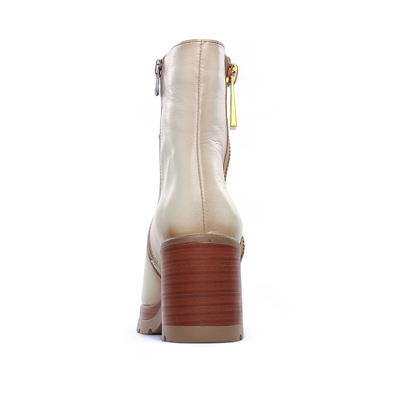 Bottines À Talon de la marque Dorking de couleur blanc creme. Hyper glamours et élégantes, ces bottines à talon haut en cuir lisse crème auront une place de choix dans votre garde robe, boots signées Dorking by Fluchos, un talon bloc haut de 6 cm, un bout rond, une fermeture éclair fantaisie dorée, un zip coté intérieur pour une chausse facile, une semelle plateau haute de 2.5 cm à l'avant marron en gomme élastomère souple.