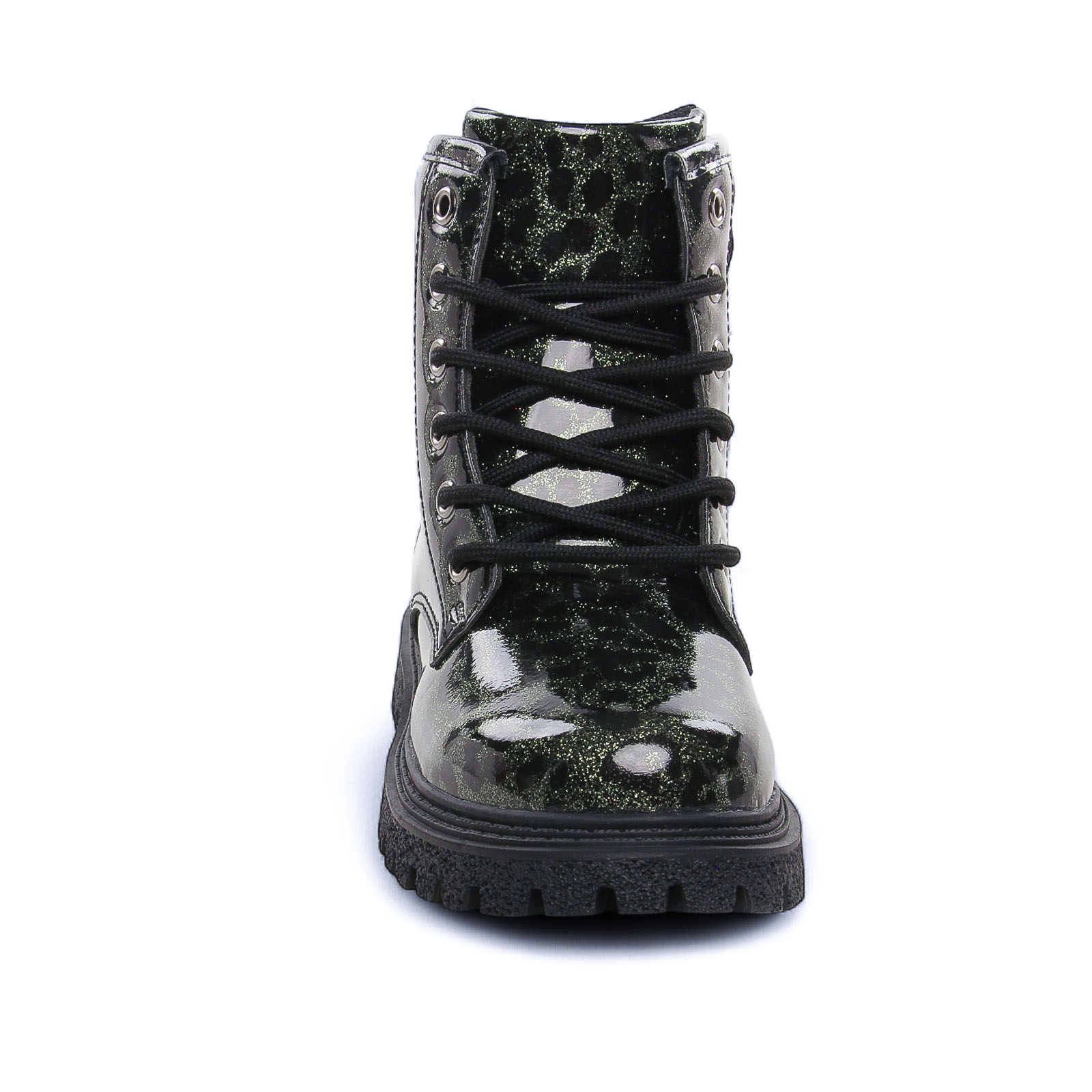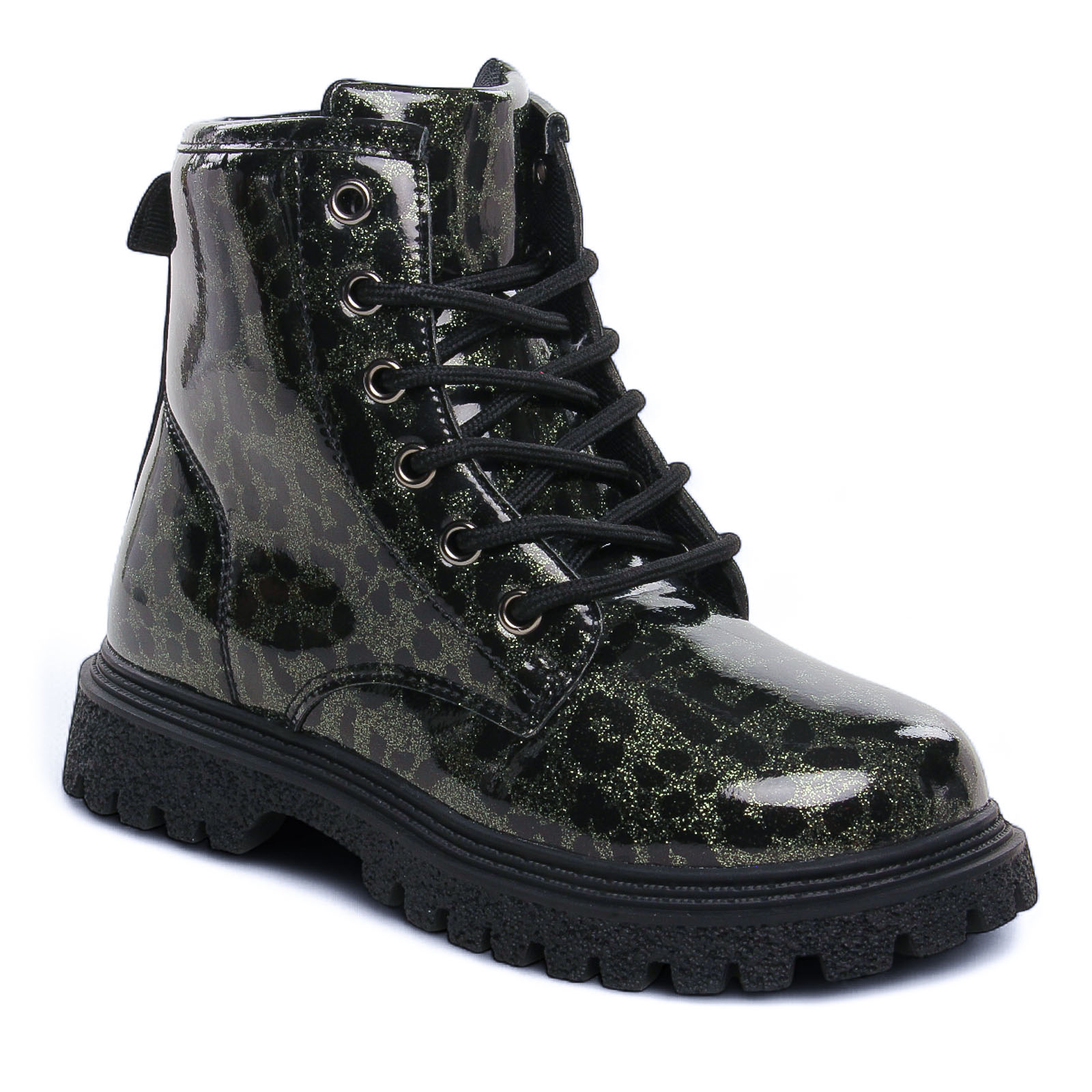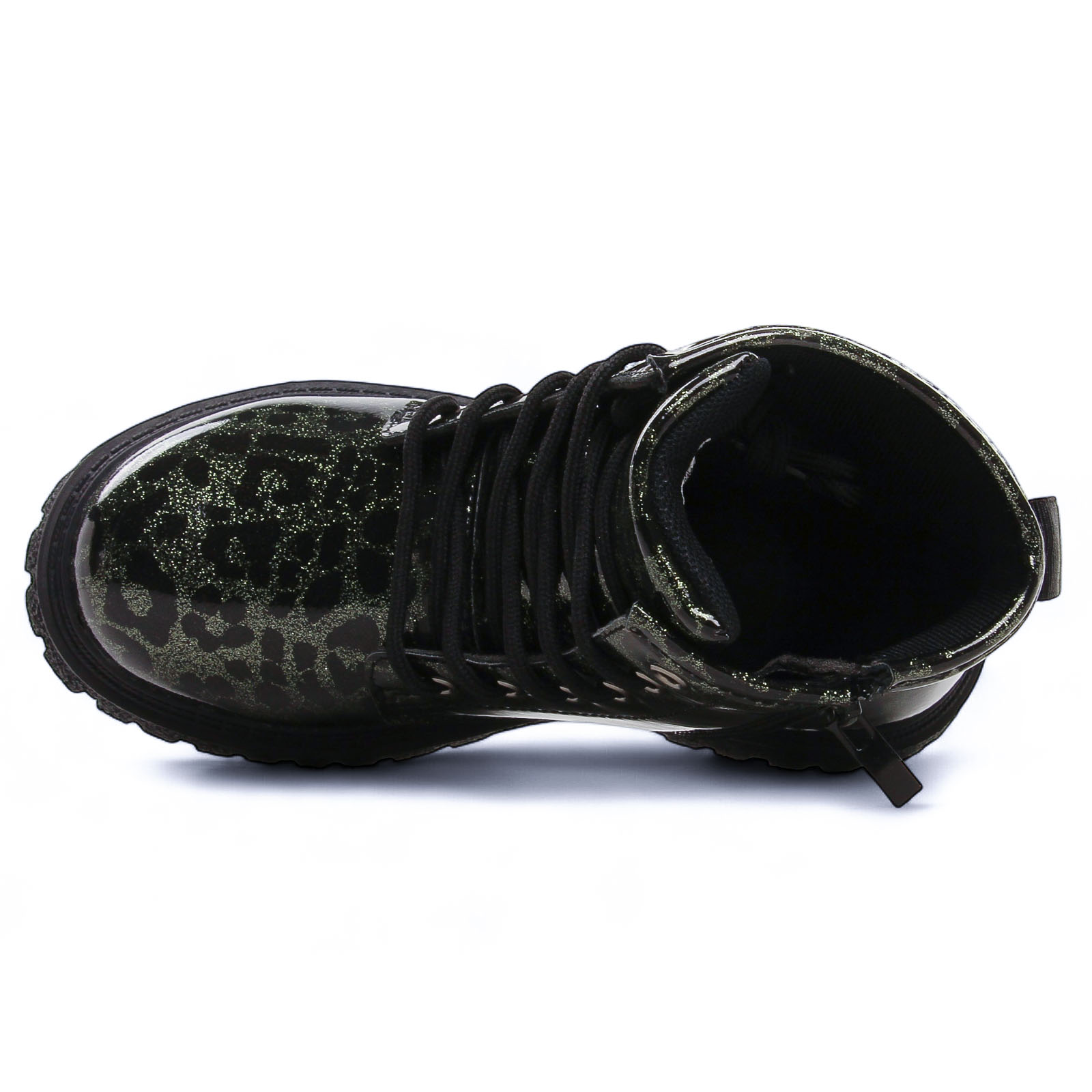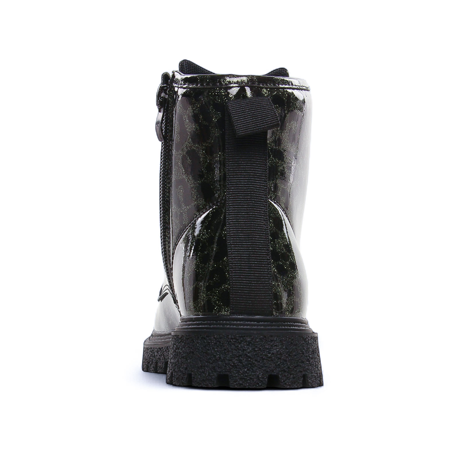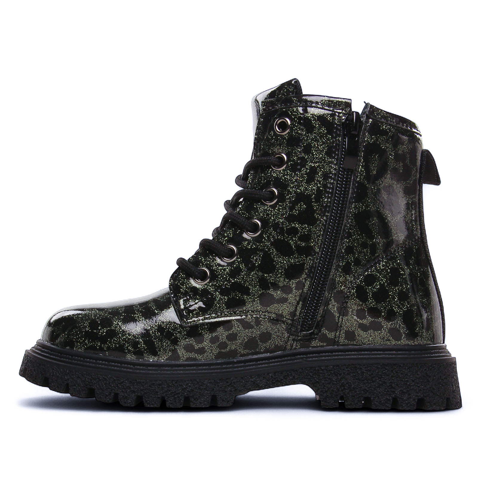 Chaussures Montantes de la marque Happy Bee de couleur vert kaki. Jolies chaussures montantes en simili vernis léopard et kaki, montantes pour enfants, une fermeture lacets et zip, semelle souple, chaussures chics et confortables signées Happy Bee à un prix démocratique !
