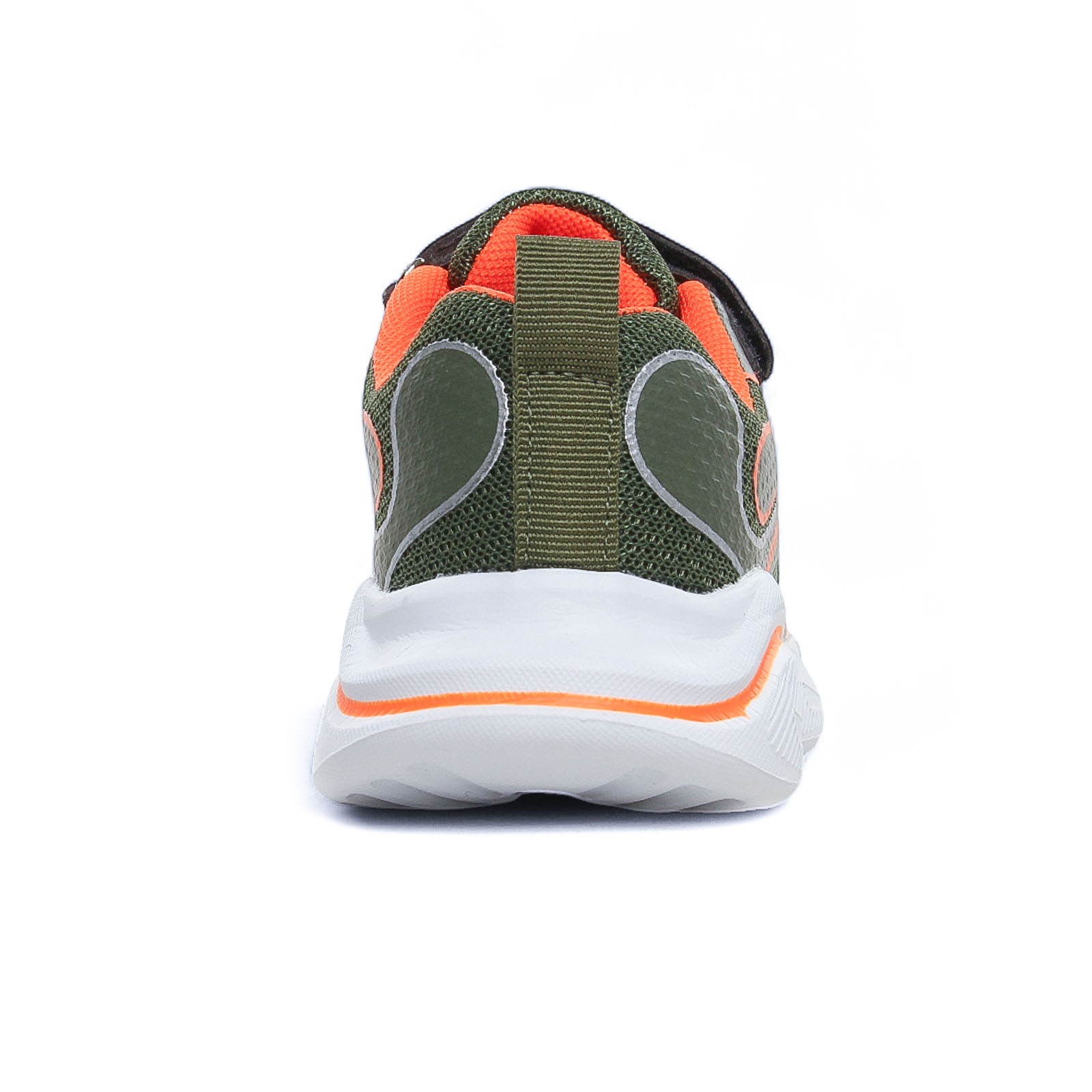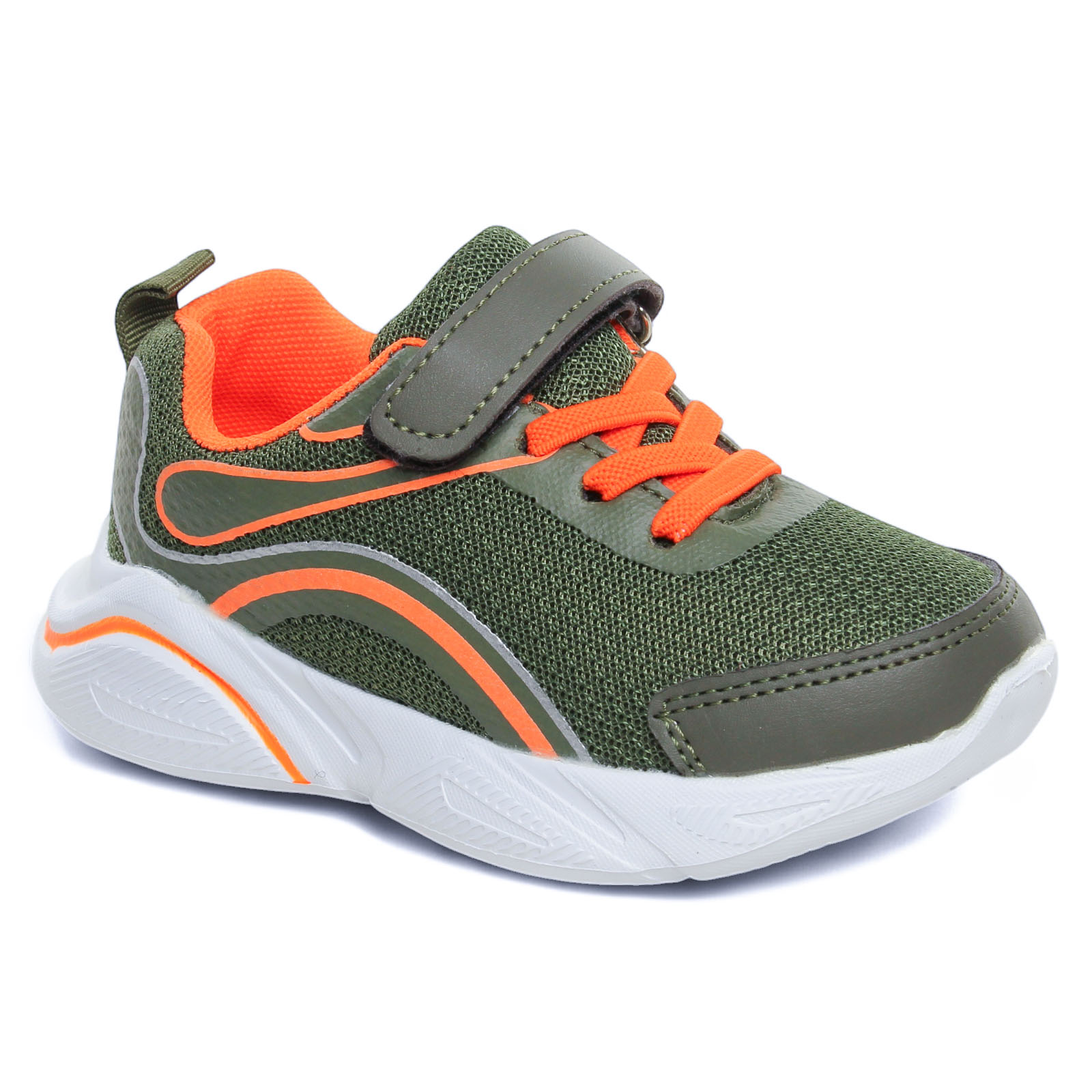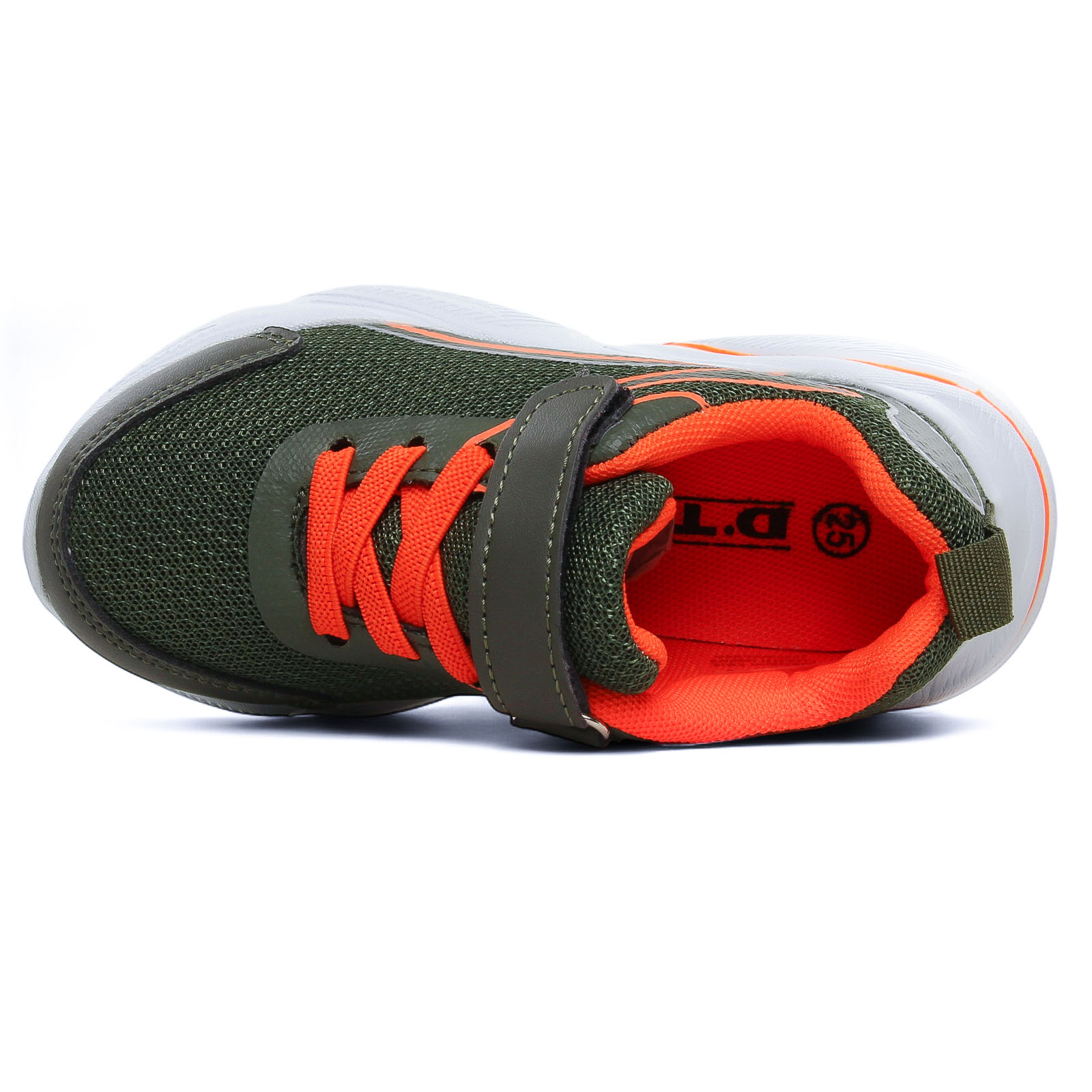 Baskets Enfants de la marque Dt New York de couleur vert kaki. Jolies sneakers basses à velcro et lacets en simili cuir dans des teintes kaki et orange, baskets basses pour petite enfance, avec une semelle souple, des chaussures confortables signées DT New York avec un prix tout doux !
