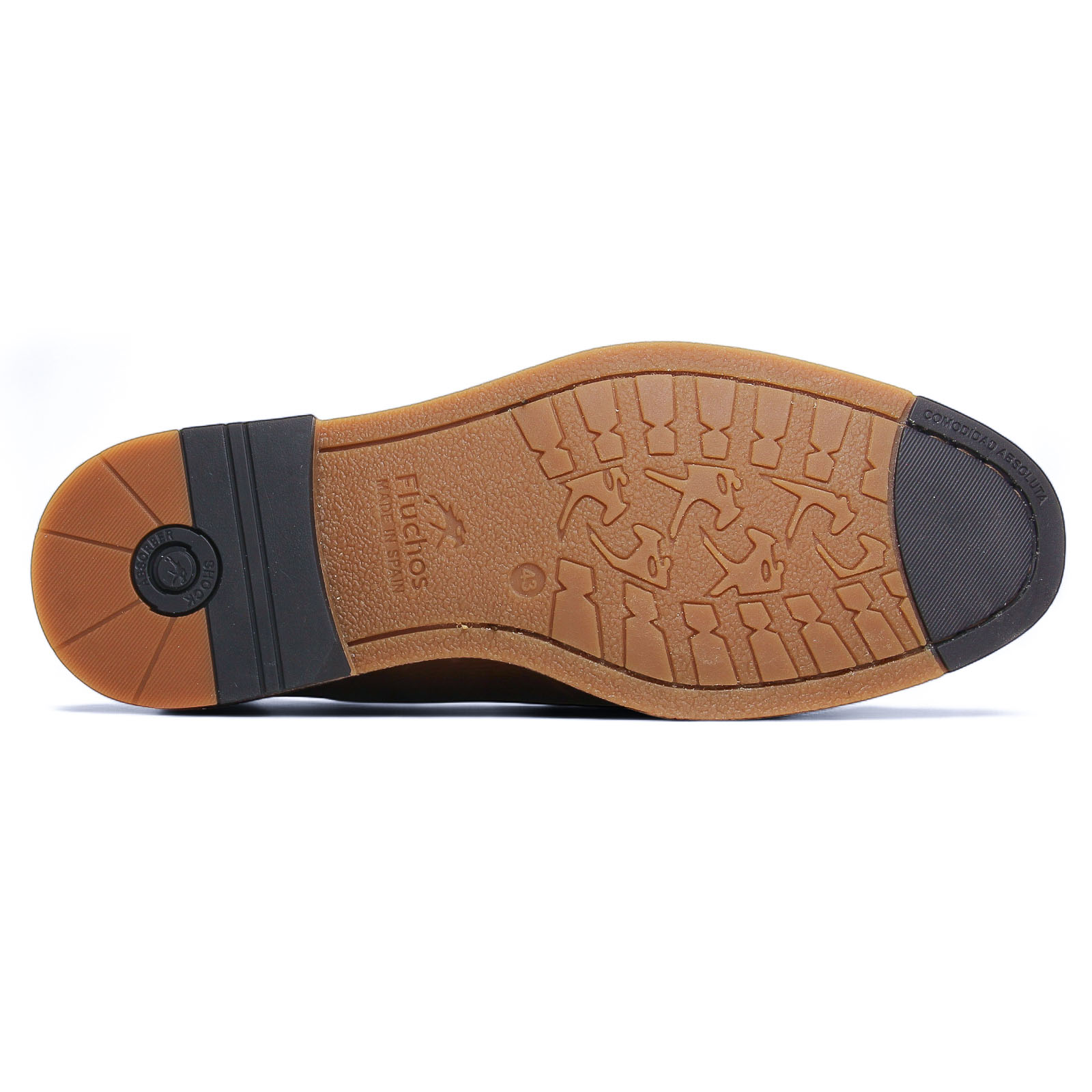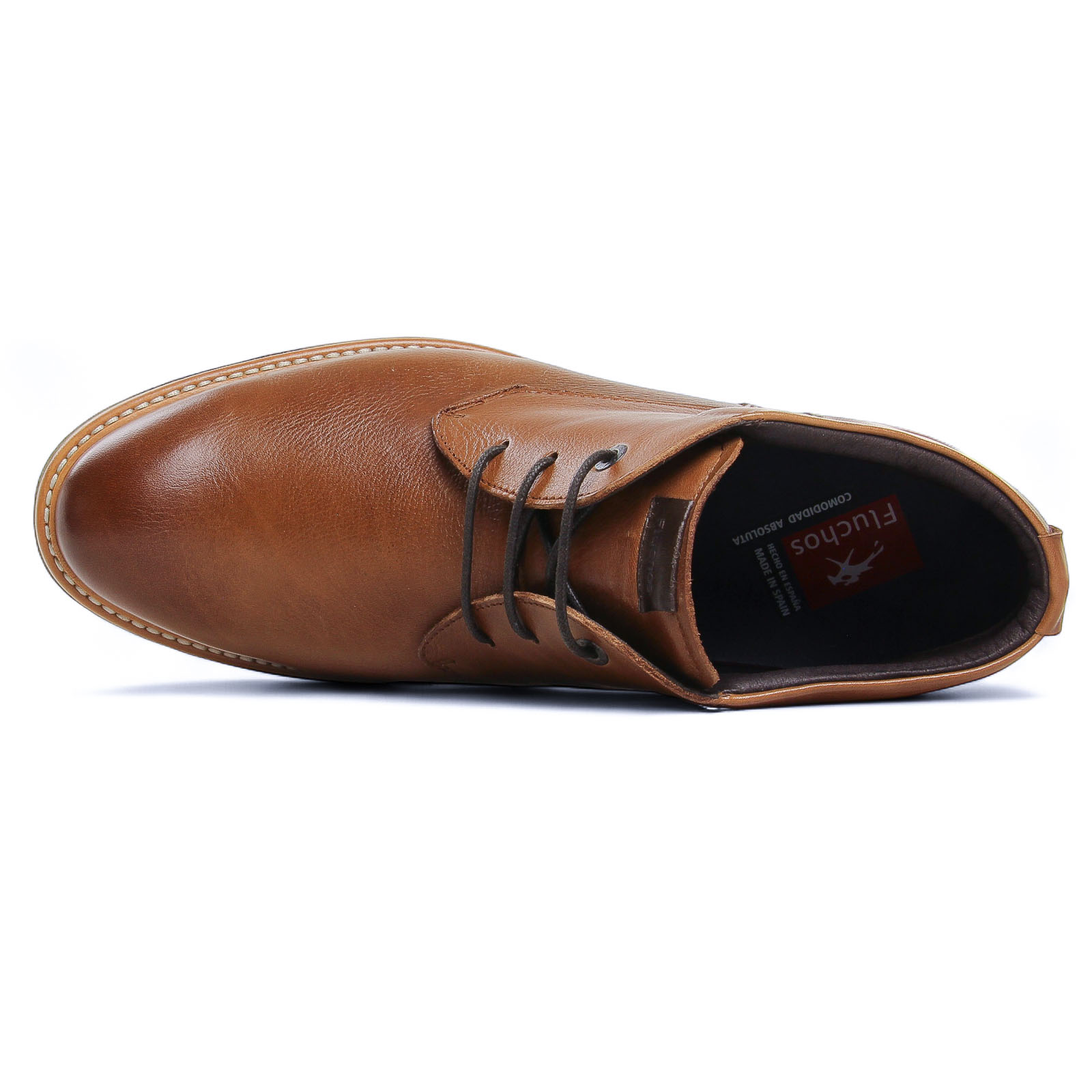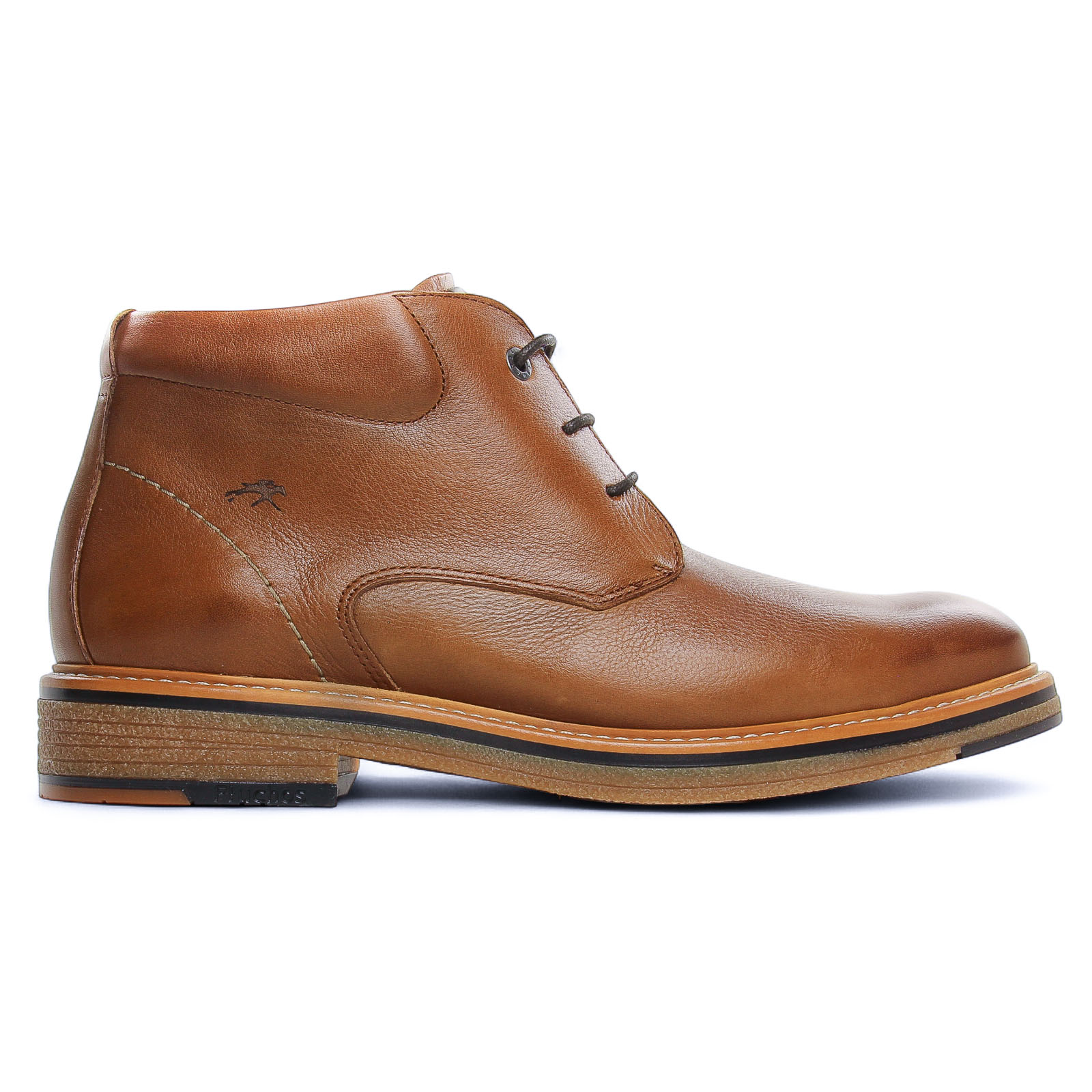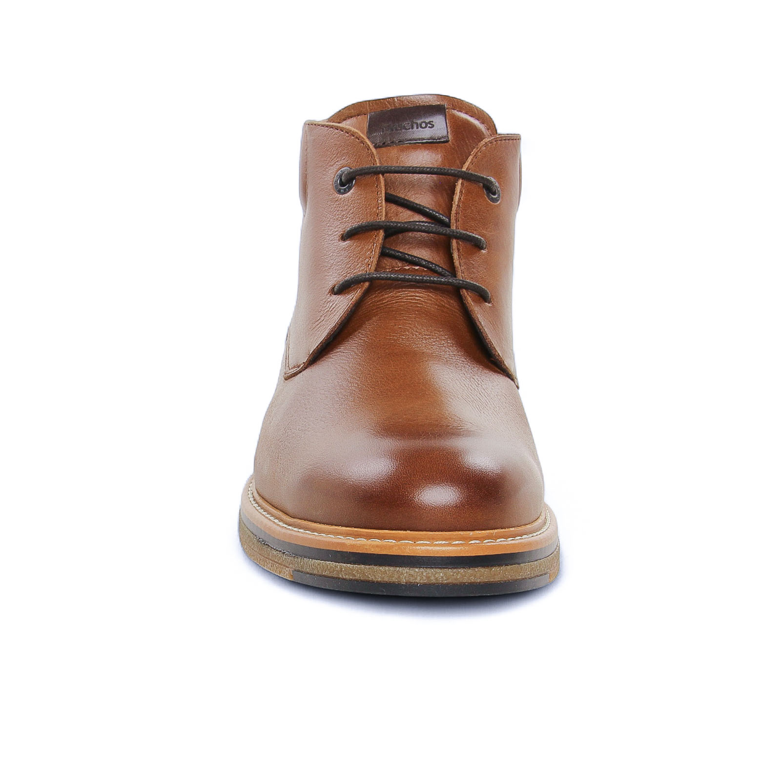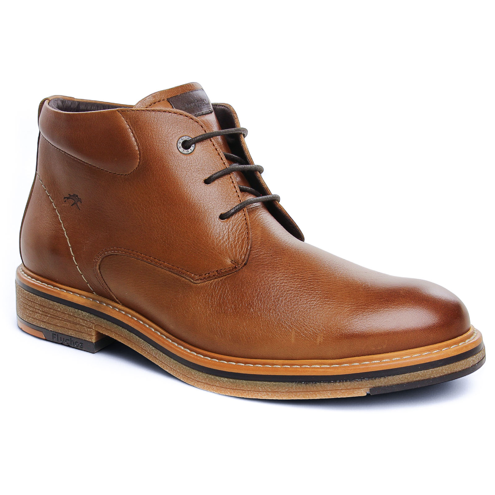 Chaussures Montantes de la marque Fluchos de couleur camel. Chaussures montantes style godillot avec une tige en cuir lise cognac, une première amovible, une doublure textile microfibre, chaussures confortables taillées pour l'hiver et signées Fluchos.