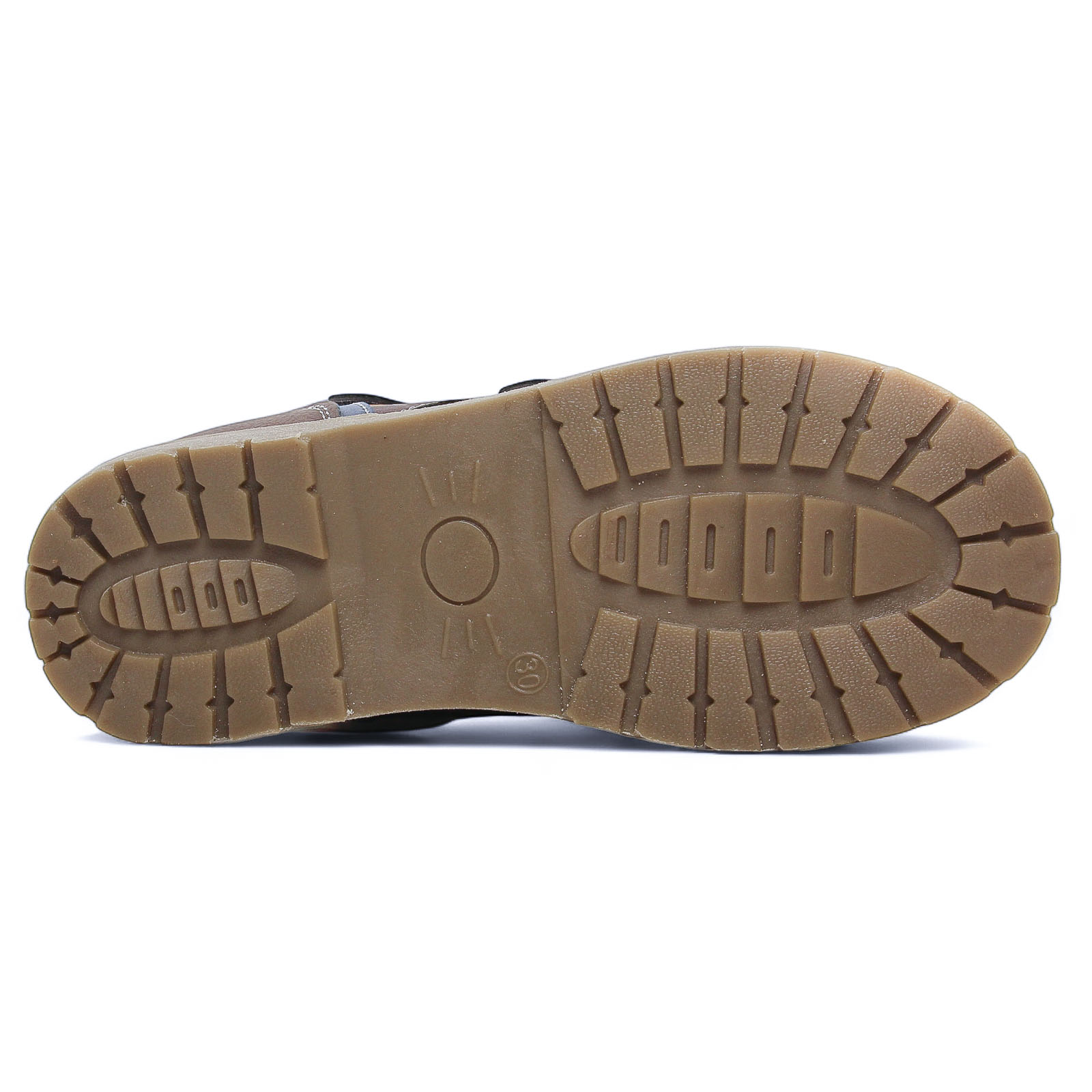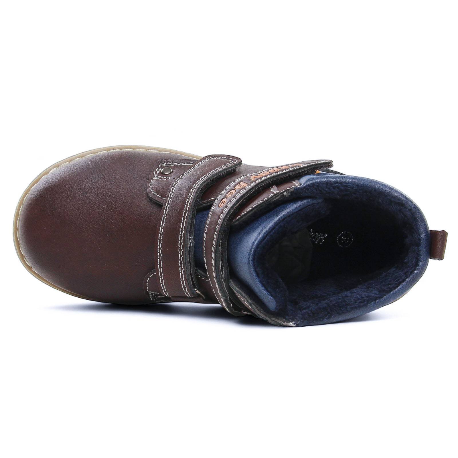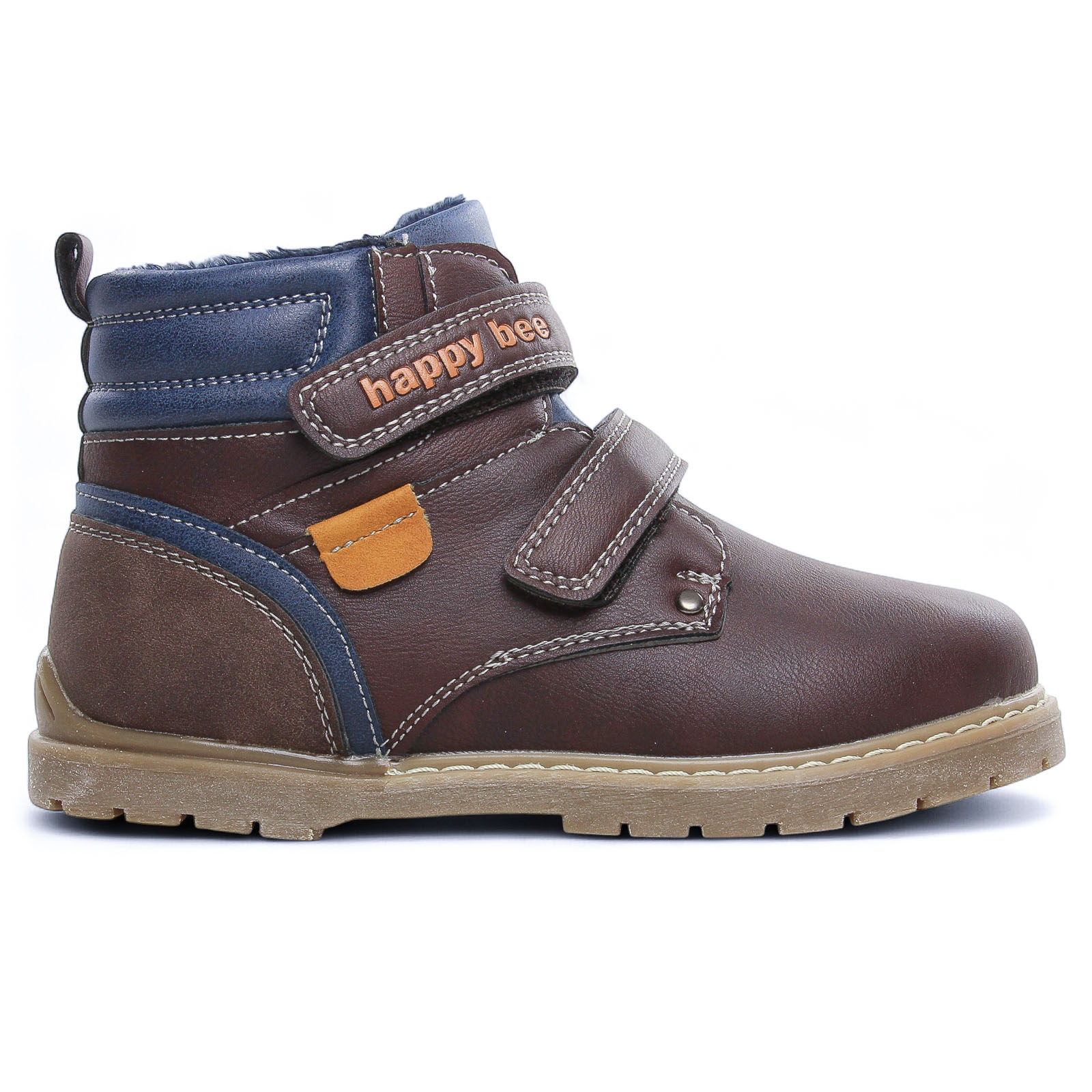 Chaussures Montantes de la marque Happy Bee de couleur marron. Jolies chaussures montantes en simili cuir dans une teinte marron foncé et des touche de bleu marine, chaussures pour enfants avec une fermeture par scratch pratique, une semelle souple, chaussures confortables signées Happy Be avec un prix tout petit !