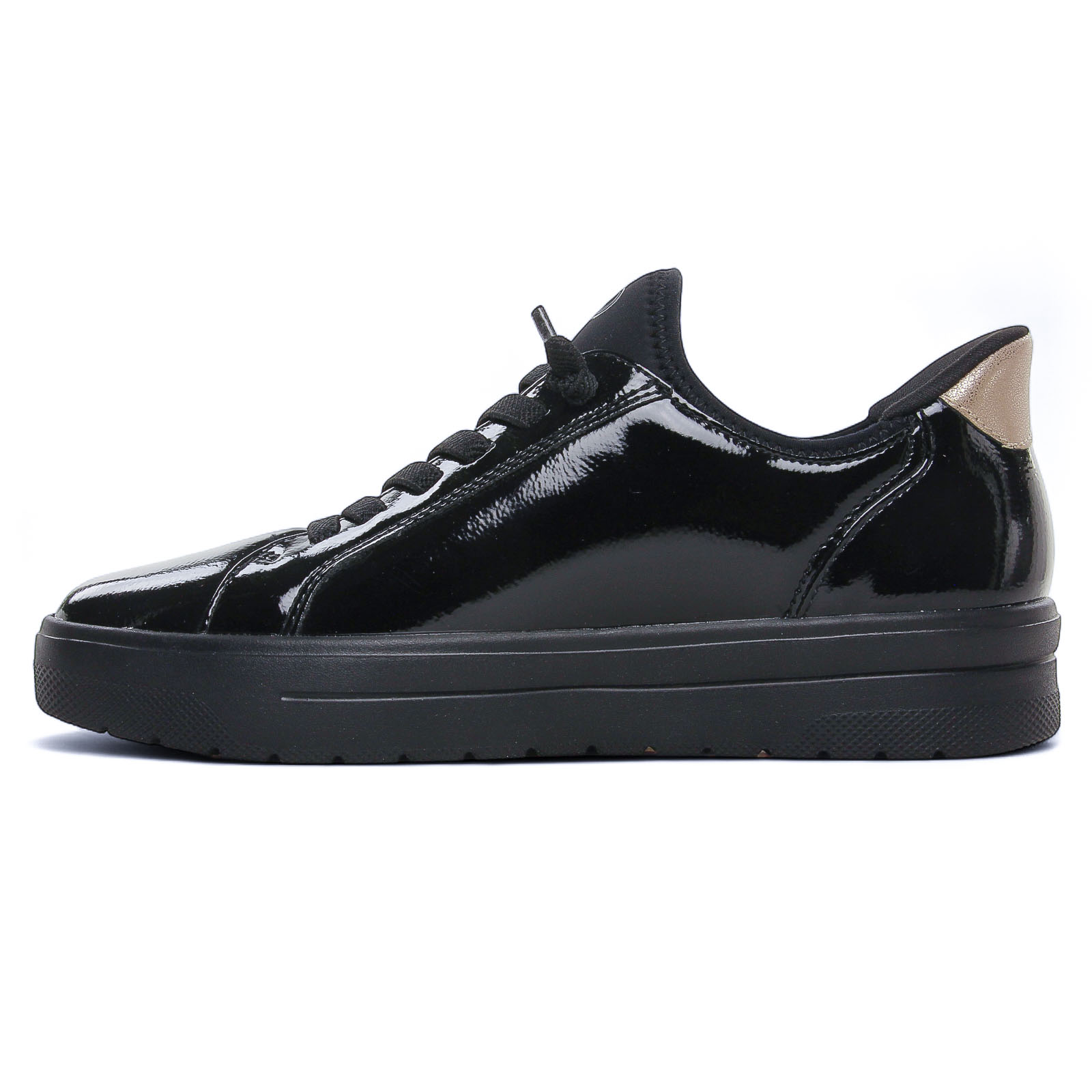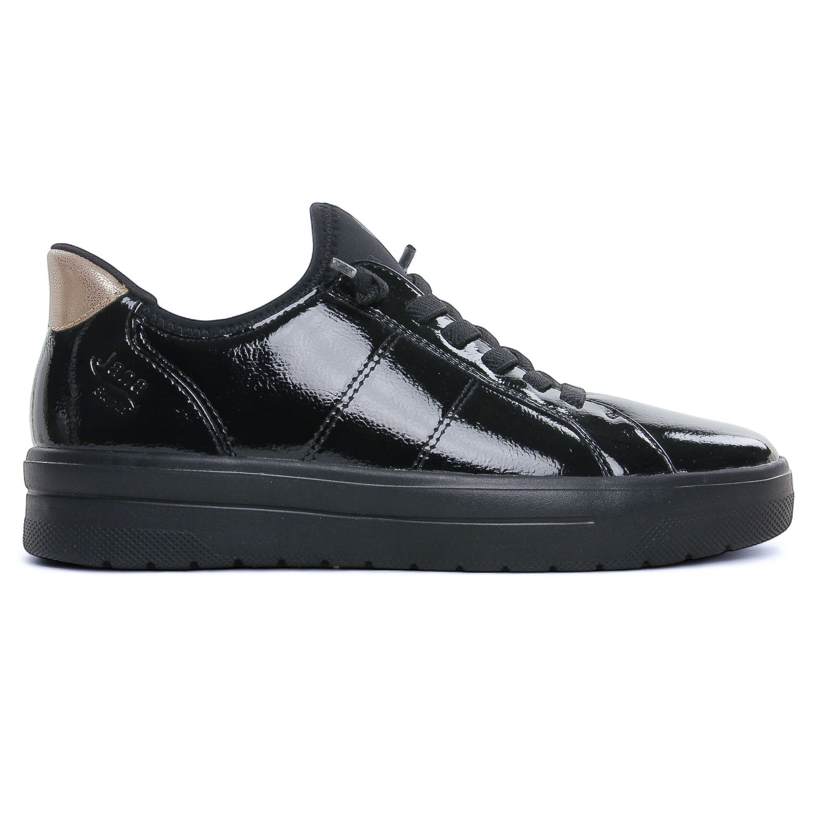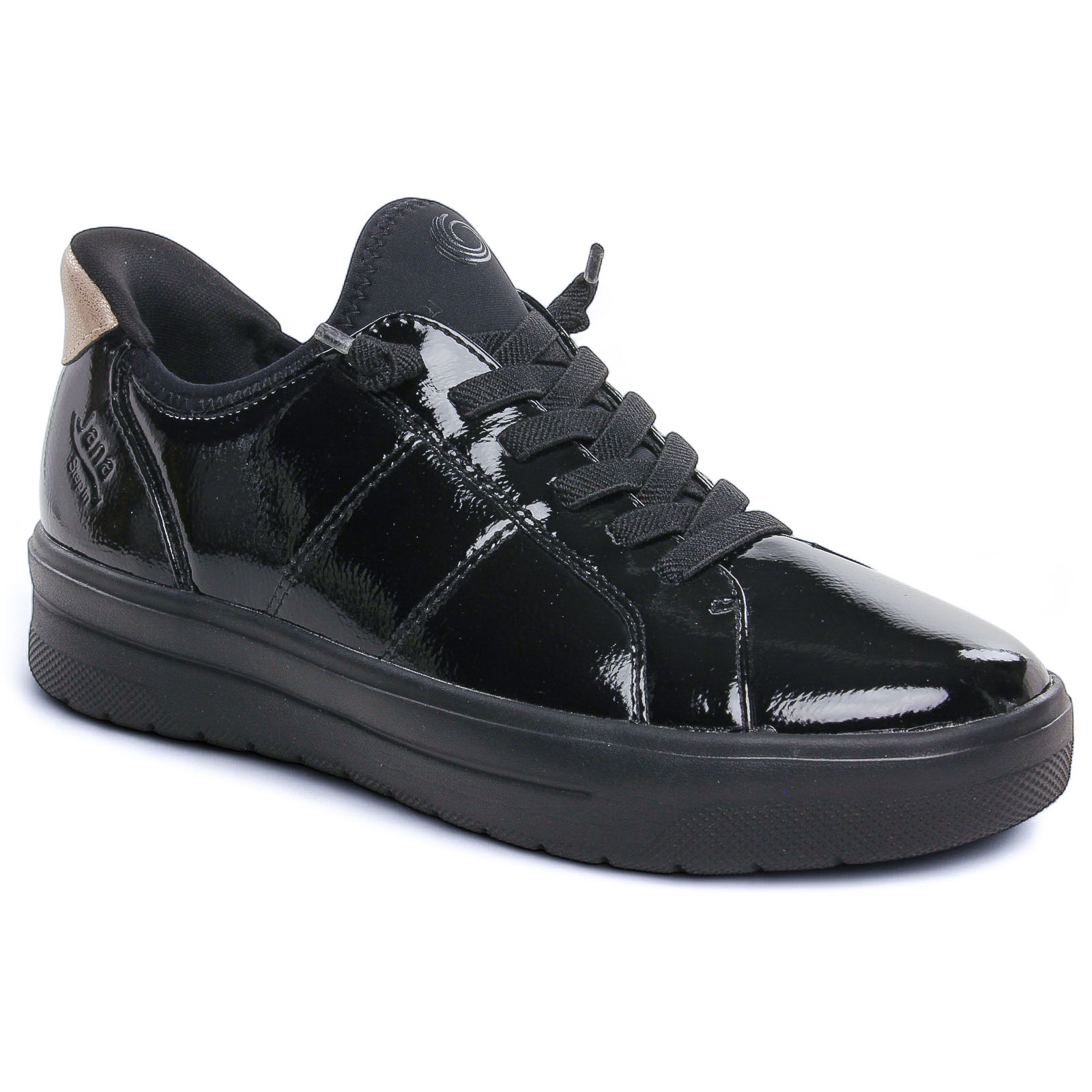 Baskets Mode de la marque Jana de couleur noir. Step-in signées Jana, baskets légères et certifiées Vegan, idéales pour pied large, une tige blanche ou vernis noir en simili cuir, lacets élastiqués chaussant à enfiler grâce au chausse pied intégré, pièce au talon or irisé sur la version noires, une semelle plateau souple d'une hauteur de 3.5 cm.