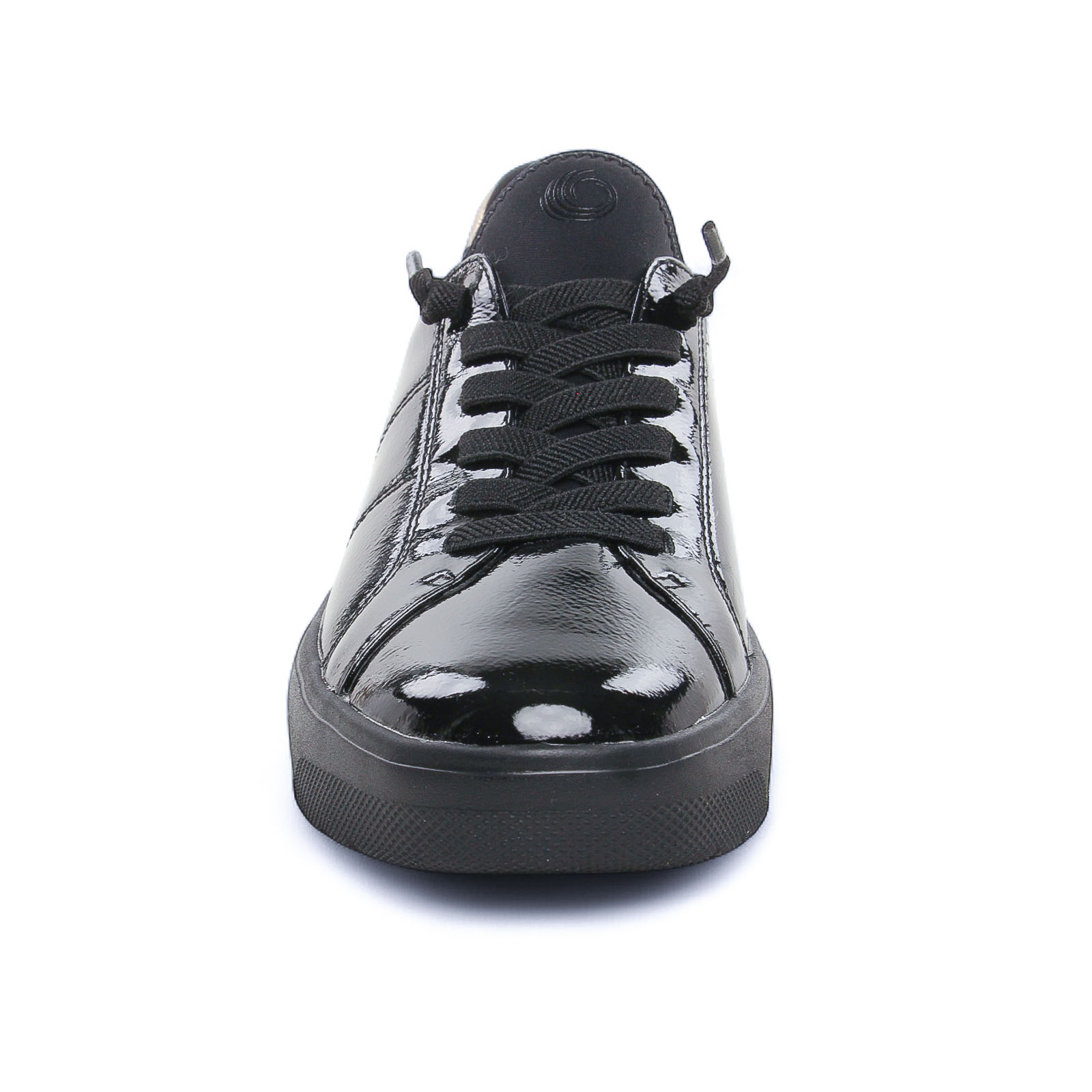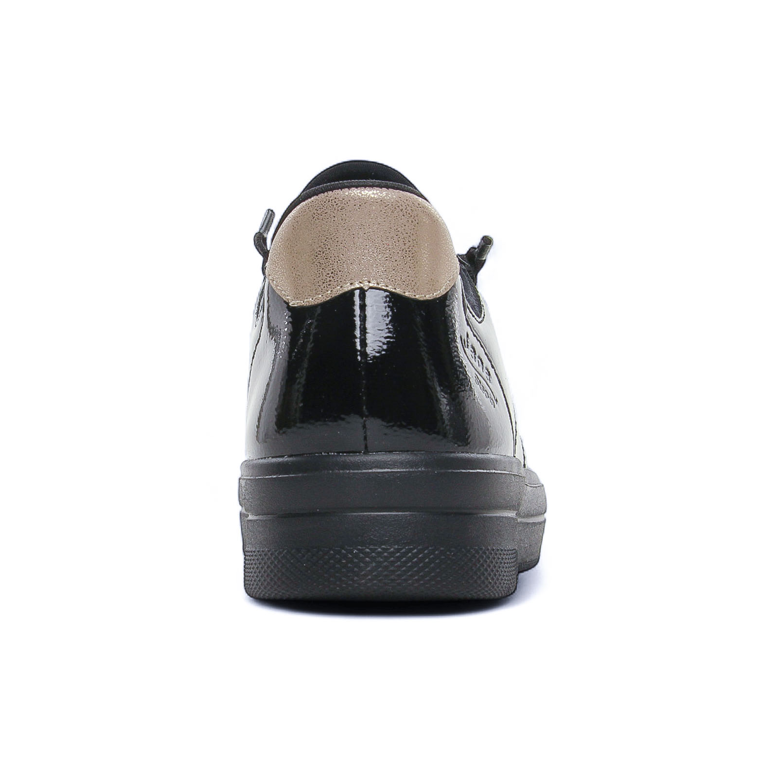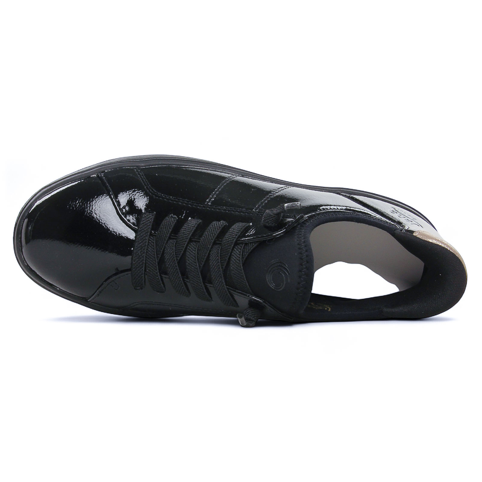 Baskets Mode de la marque Jana de couleur noir. Step-in signées Jana, baskets légères et certifiées Vegan, idéales pour pied large, une tige blanche ou vernis noir en simili cuir, lacets élastiqués chaussant à enfiler grâce au chausse pied intégré, pièce au talon or irisé sur la version noires, une semelle plateau souple d'une hauteur de 3.5 cm.