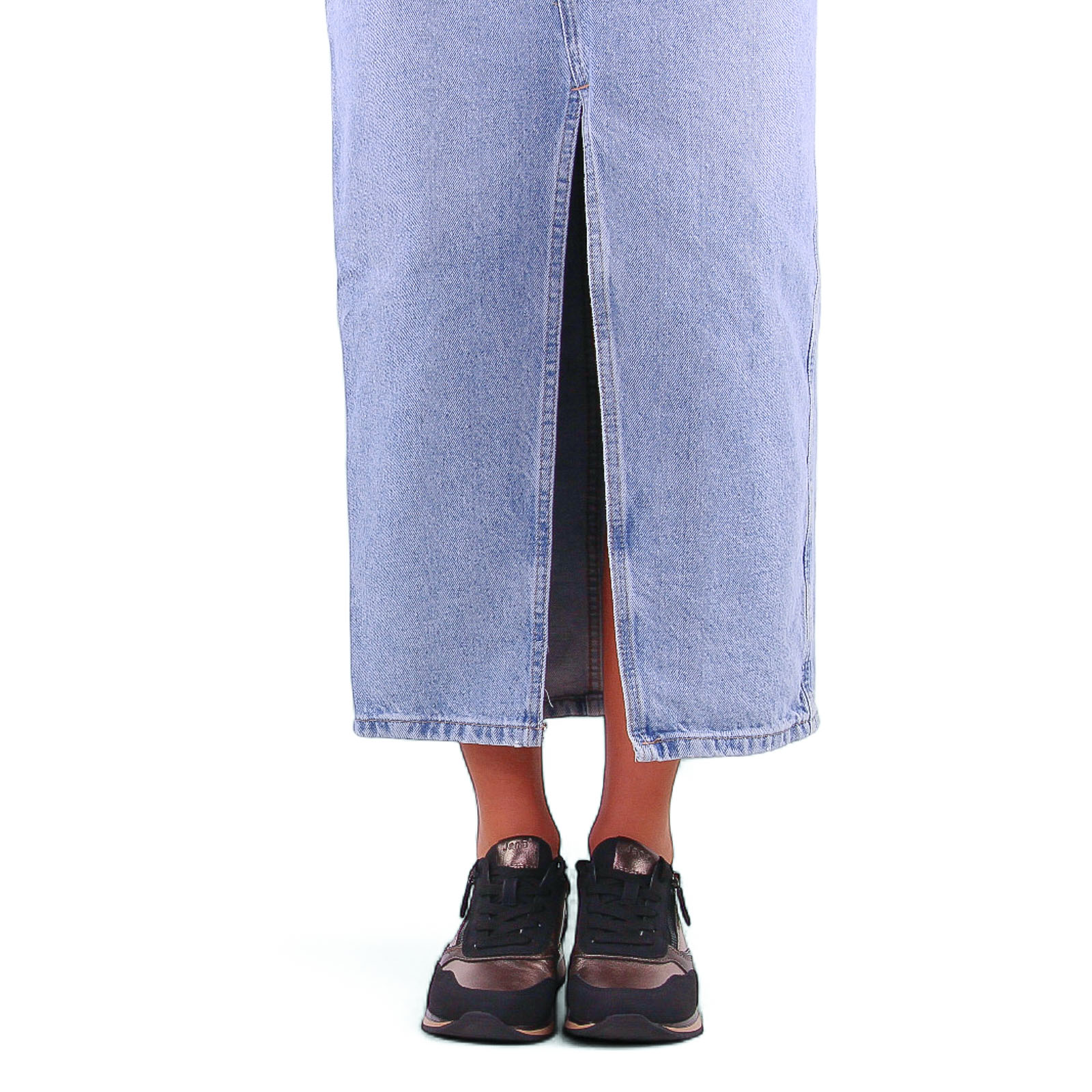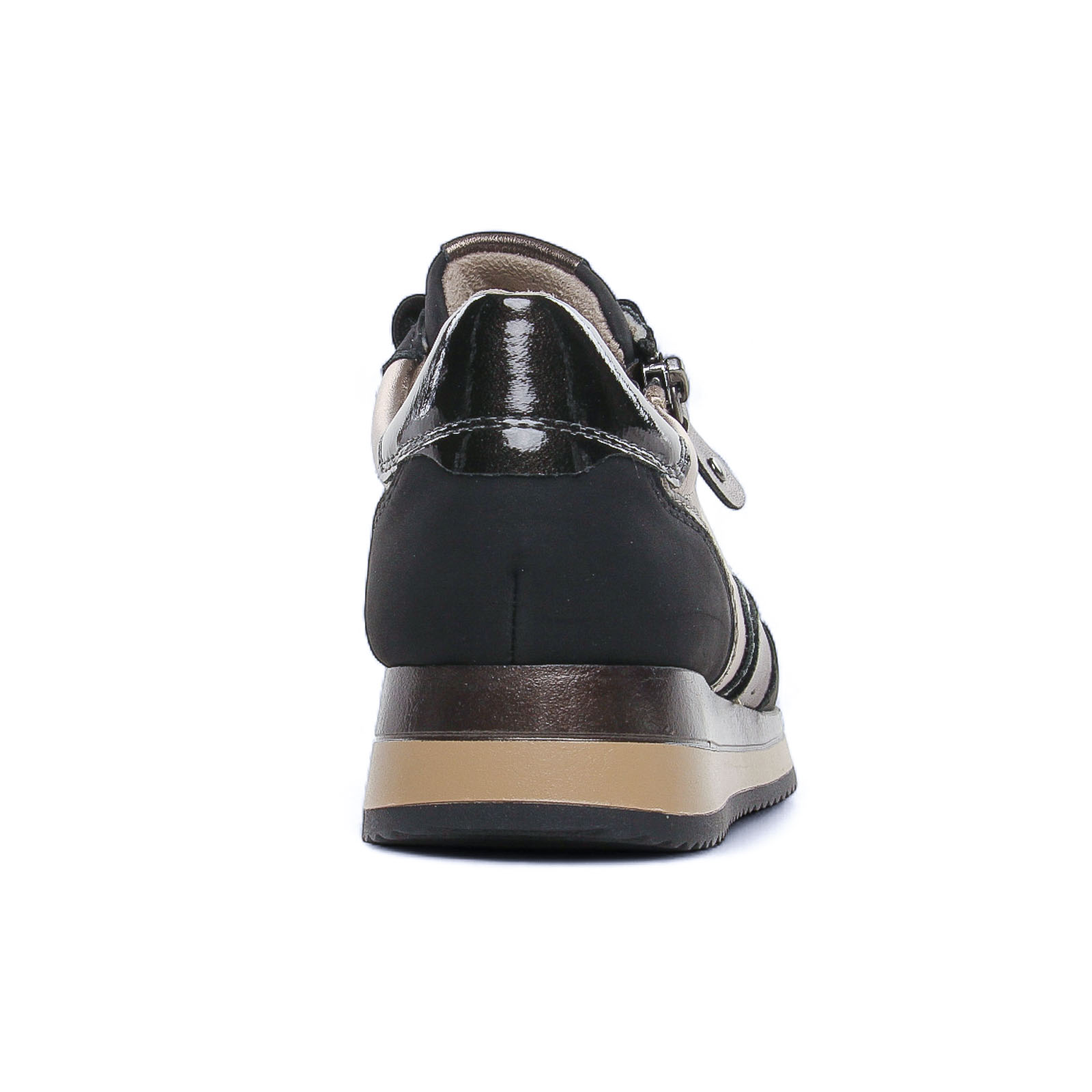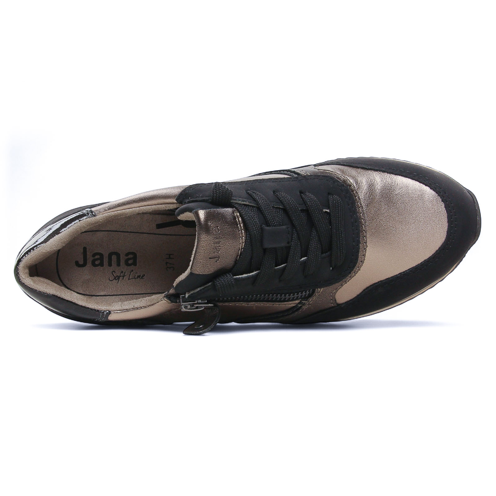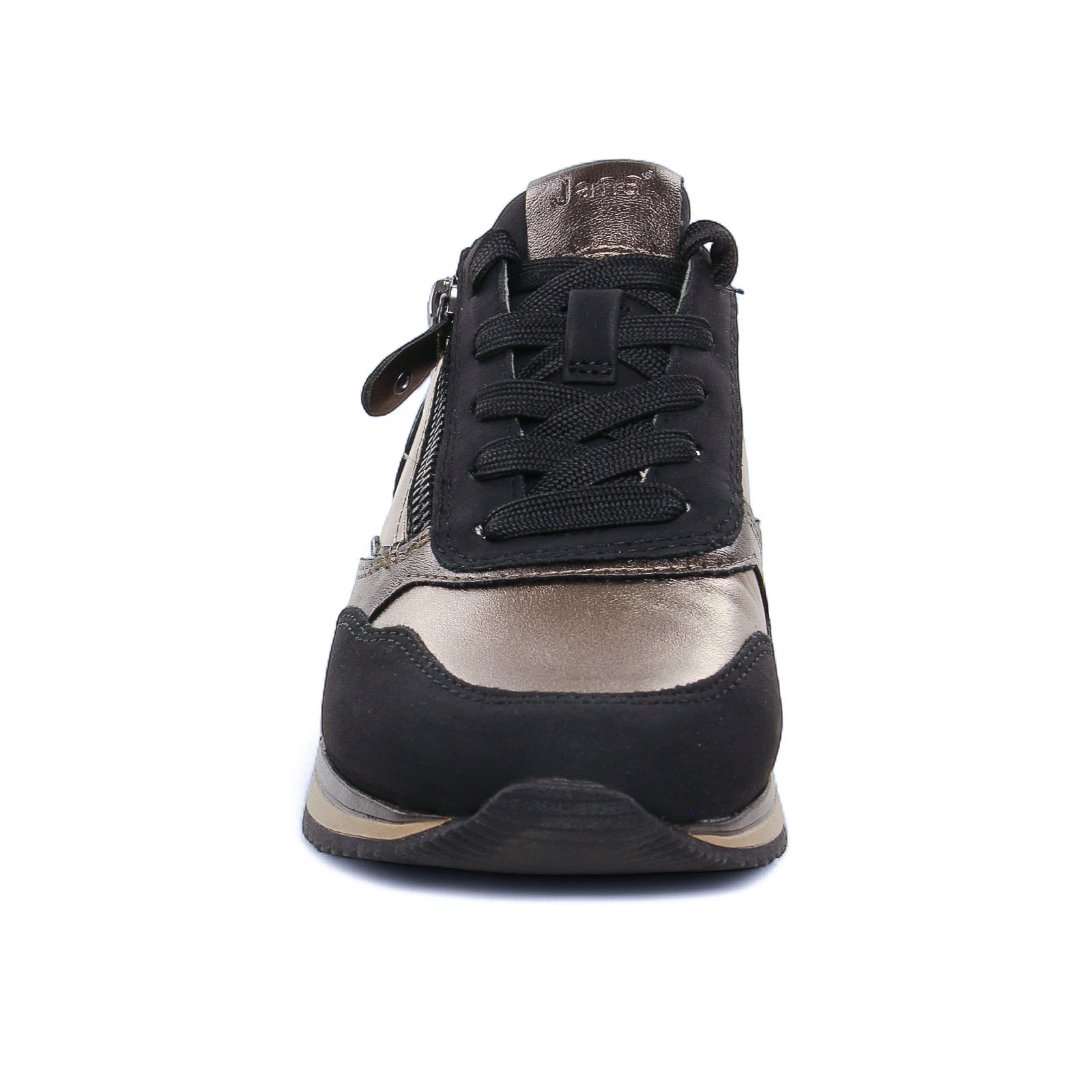 Baskets Mode de la marque Jana de couleur noir or. Glamours et chics ces baskets femme de la gamme Vegan, avec des motifs très tendances, des textures et des empiècements argentés ou dorés, zip latéral et lacets en coton assurent un ajustement pratique et confortable. Légèrement compensée, elle offre une silhouette élancée tout en restant agréable à porter. Sa semelle crantée garantit une adhérence optimale et un style affirmé !