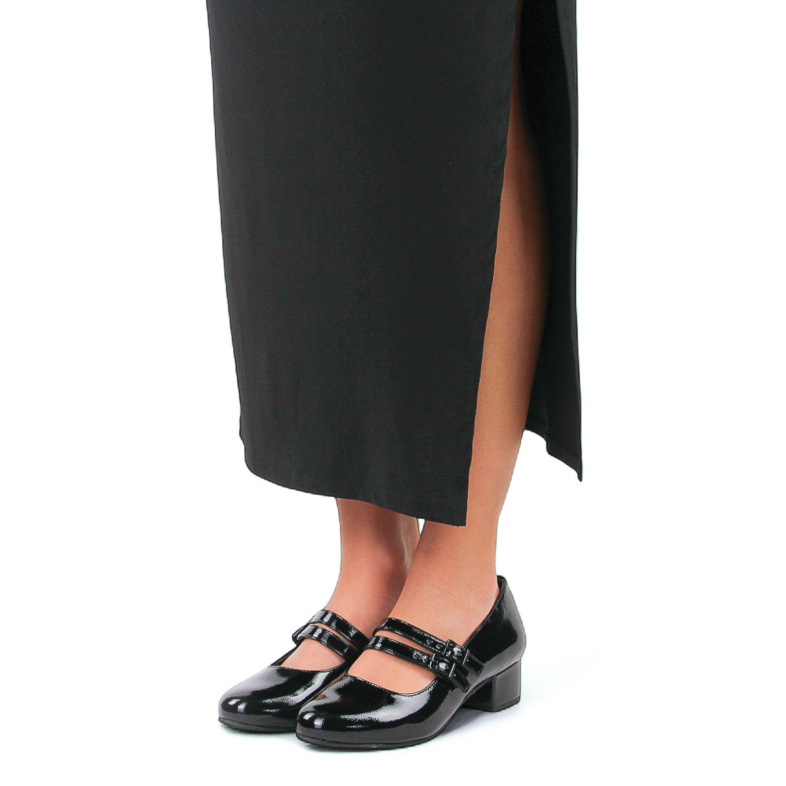 Escarpins Brides de la marque Jana de couleur noir. Escarpins de la gamme végane de la marque allemande JANA, une version vernis noir et une vernis rouge carmin, tige en simili cuir avec un aspect nervuré, 2 brides sur le coup de pied avec une boucle, un talon carré de 4 cm et une première Soft Line pour plus de confort !
