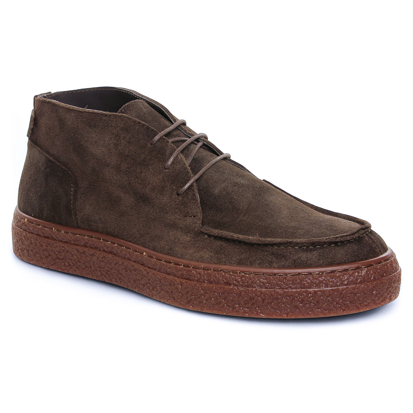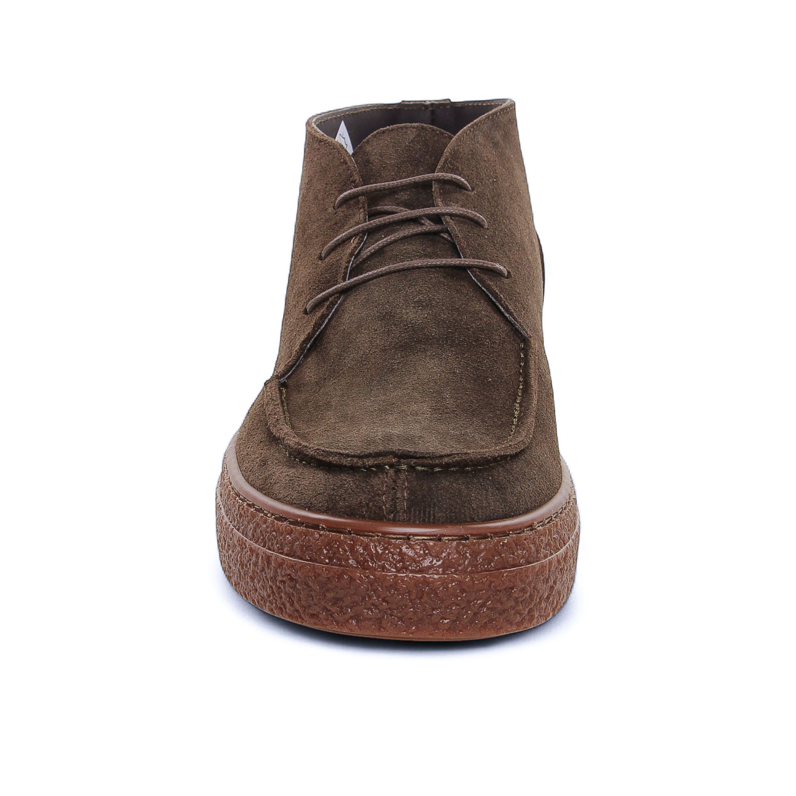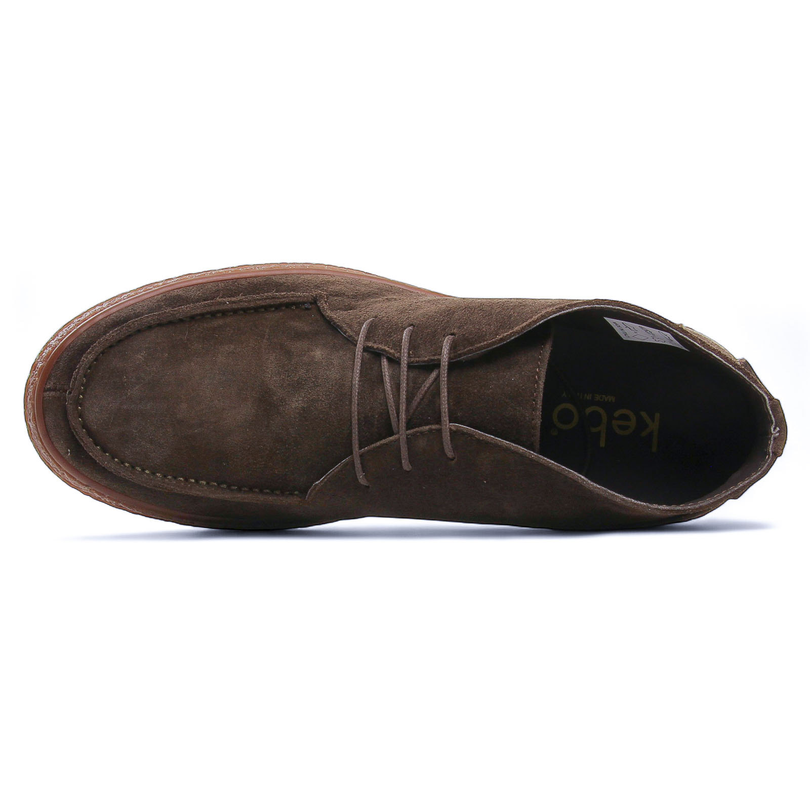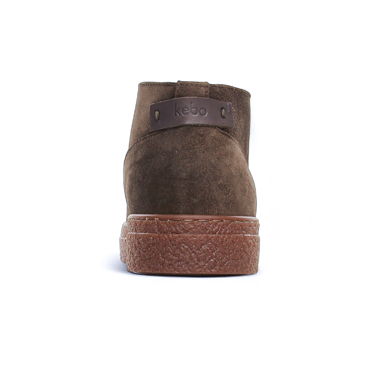 Bottines Chukka de la marque Kebo de couleur marron brun. Élégantes chaussures mi-montantes style Chukka et signées Kebo avec une tige en cuir suédé nubuck de qualité disponible en camel ou en marron foncé, des petits lacets ronds, bottines chukka de la nouvelle collection automne hiver 2025.