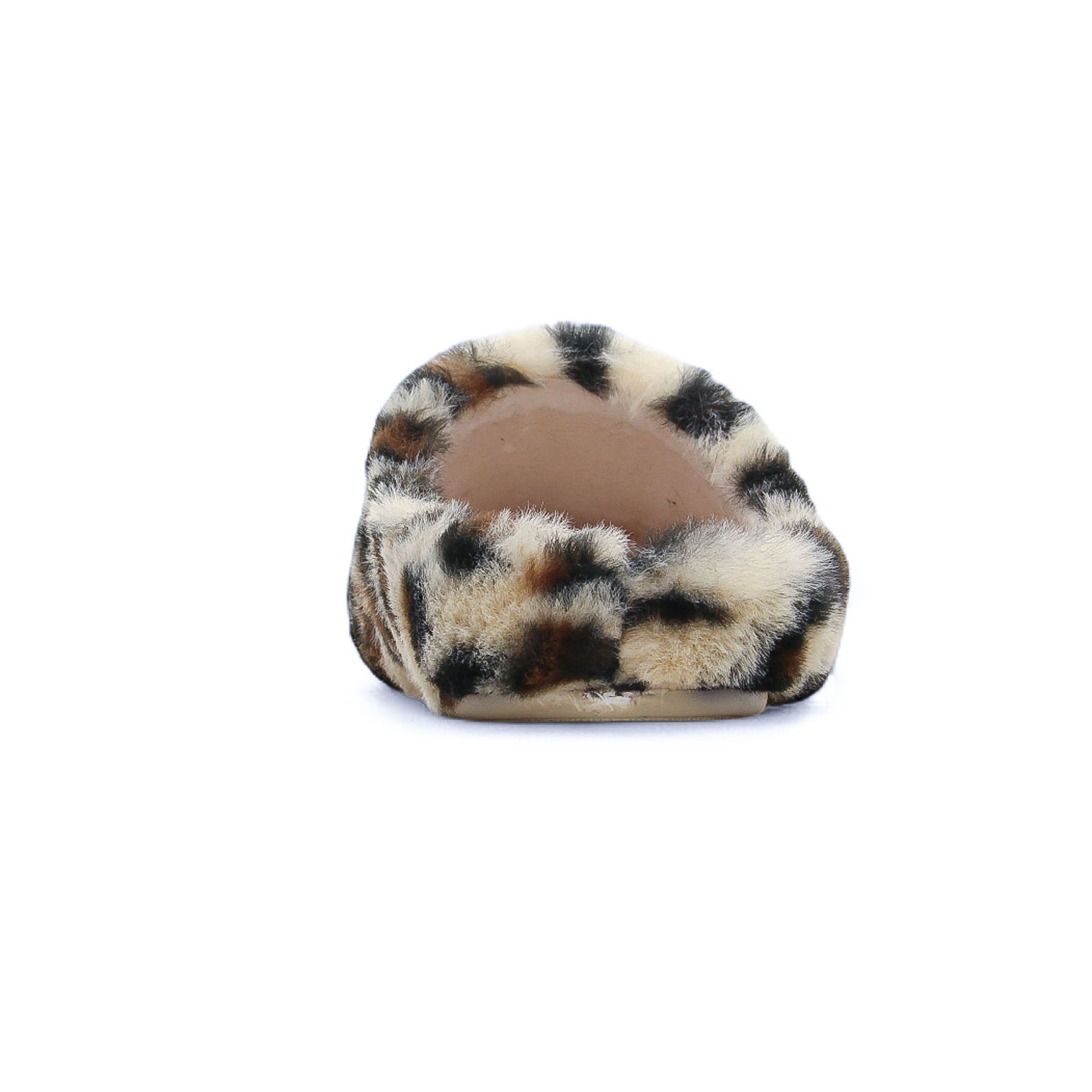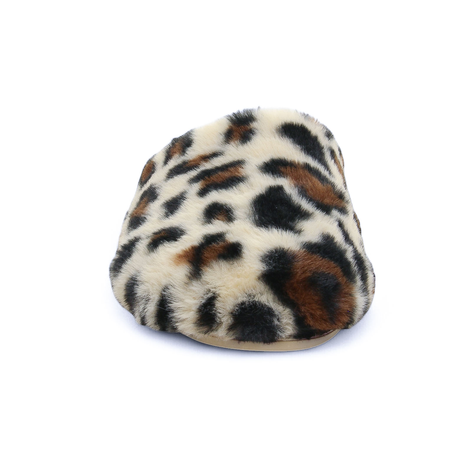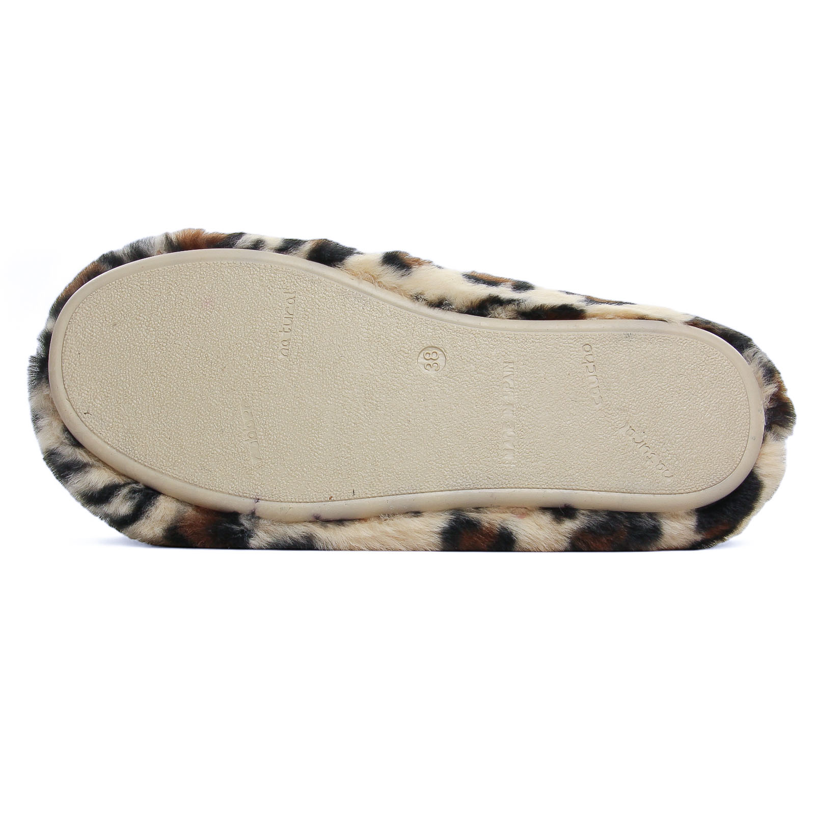 Chaussons de la marque Maison De L'espadrille de couleur beige léopard. Jolie mule chausson avec une première amovible légèrement compensée, une touche de fantaisie léopard et simili fourrure.