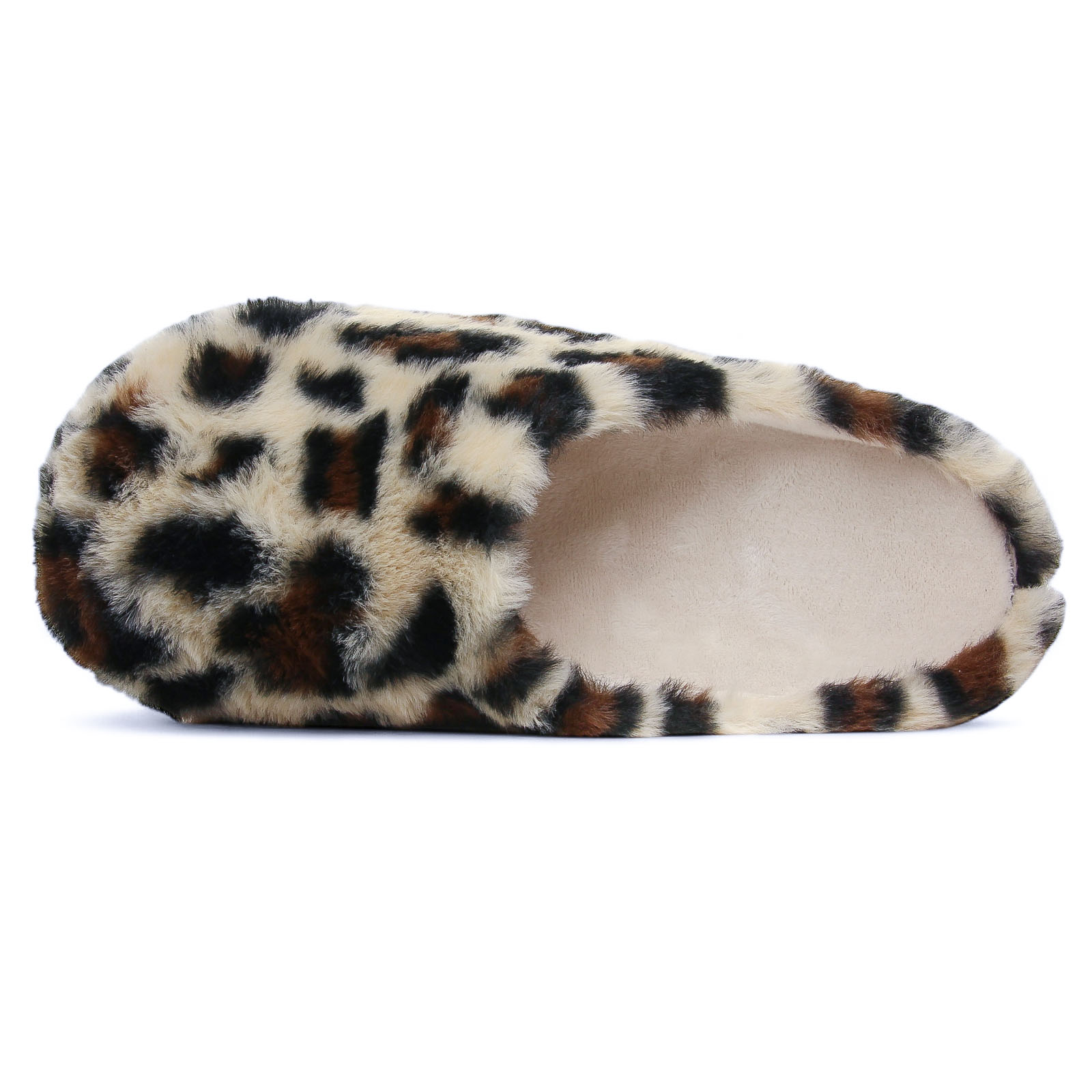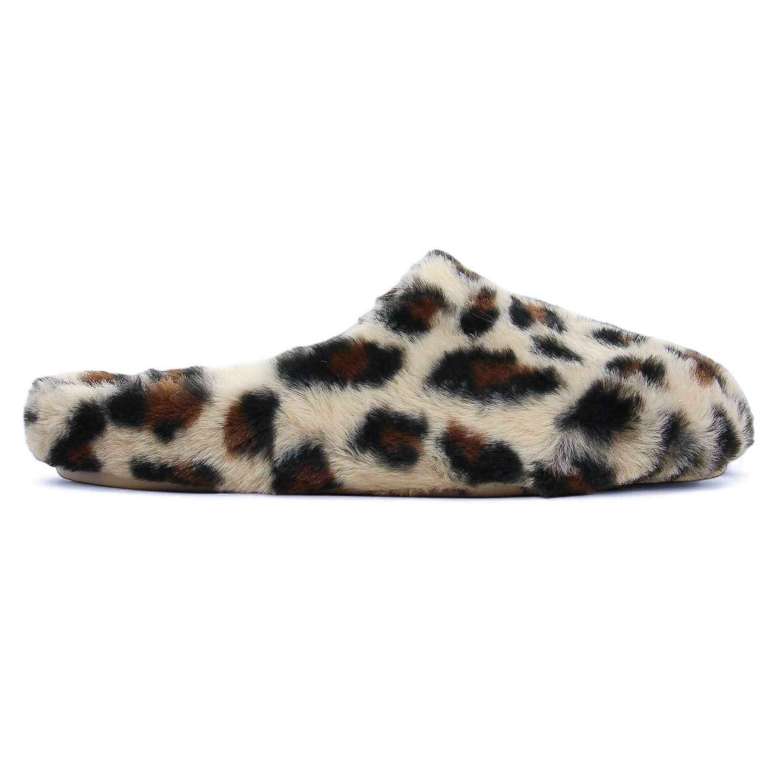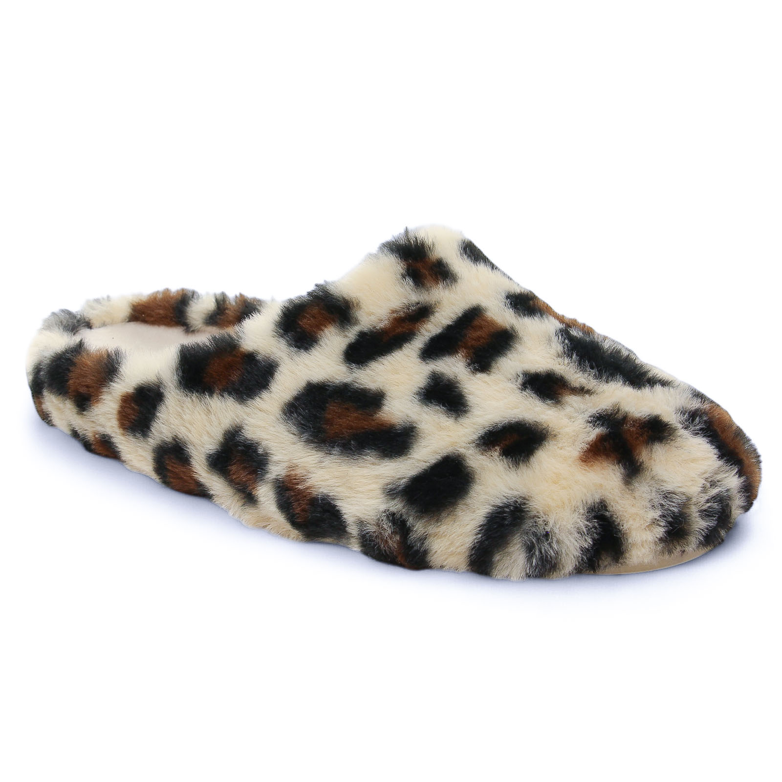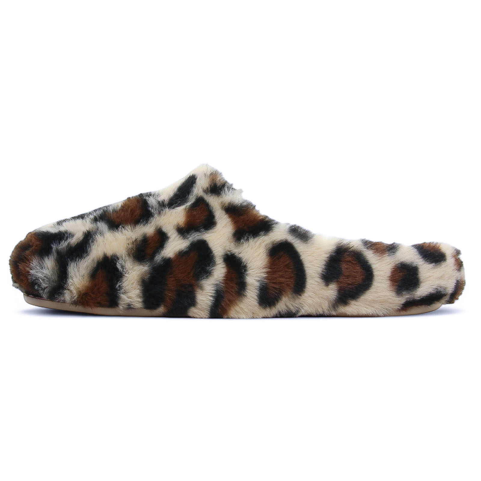 Chaussons de la marque Maison De L'espadrille de couleur beige léopard. Jolie mule chausson avec une première amovible légèrement compensée, une touche de fantaisie léopard et simili fourrure.