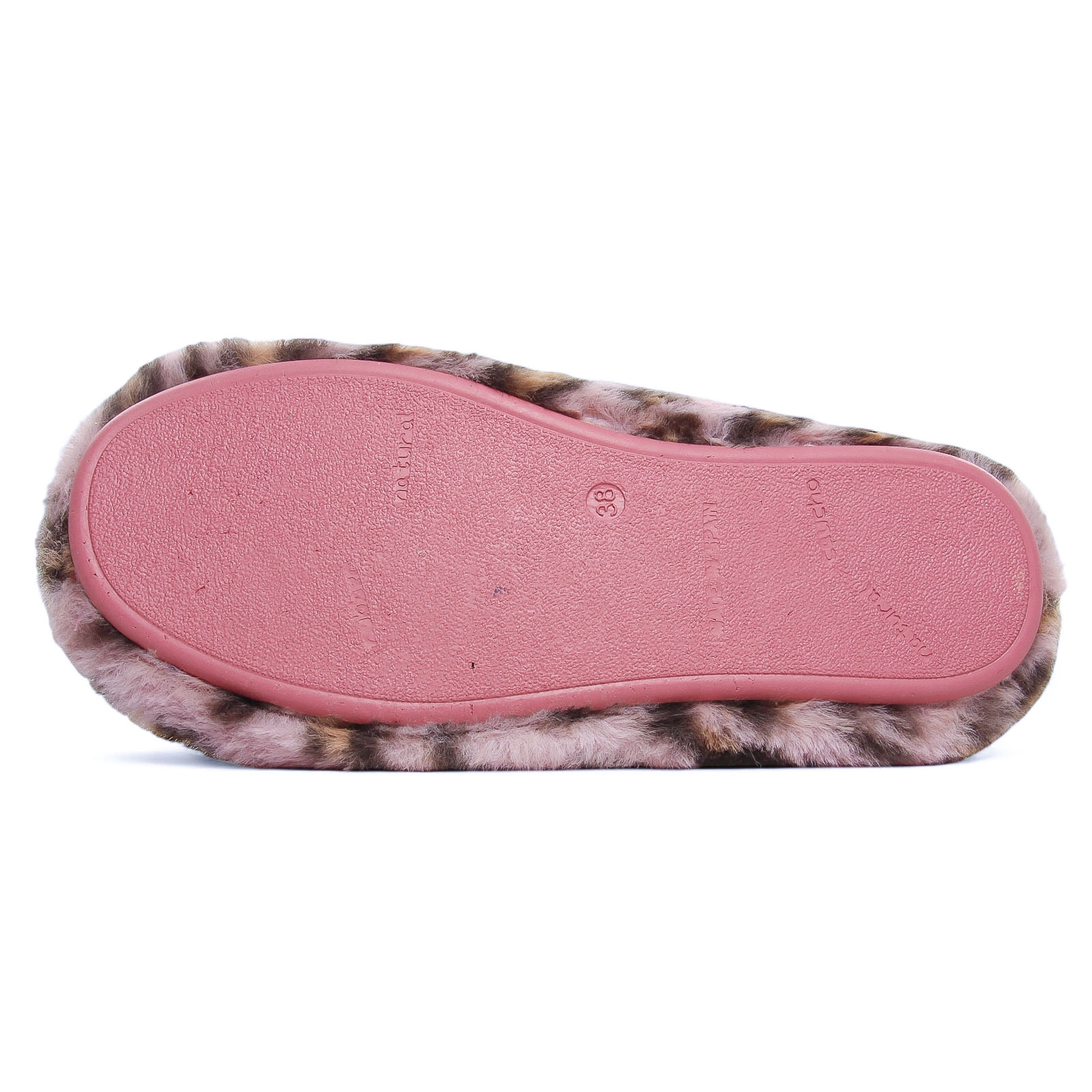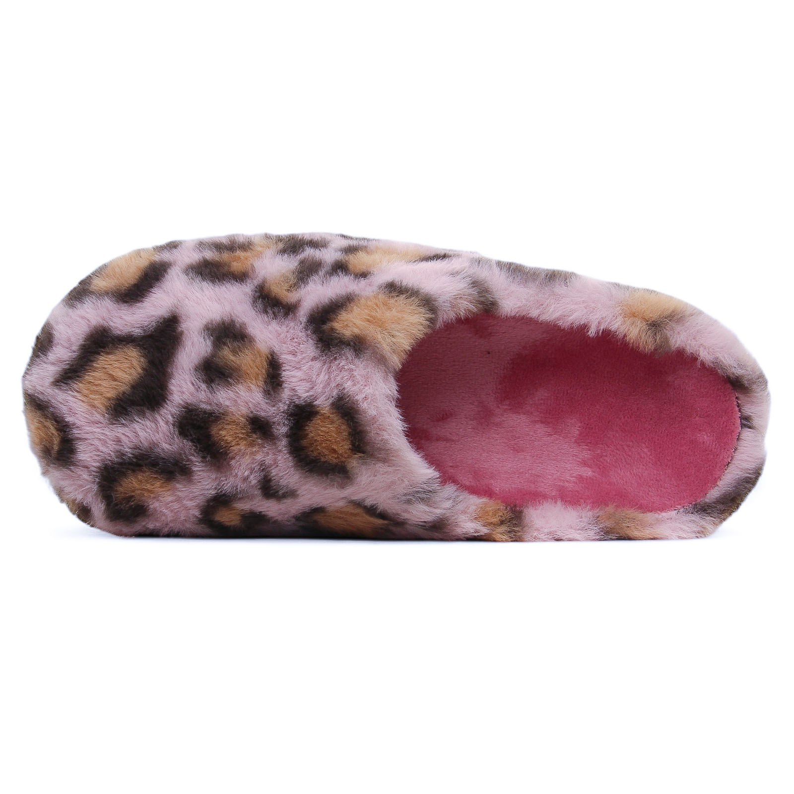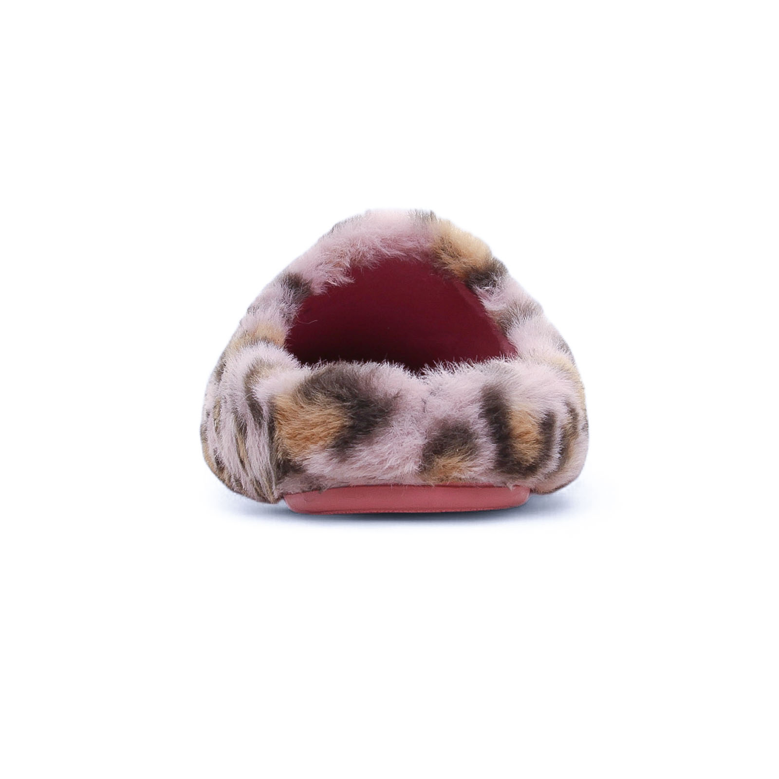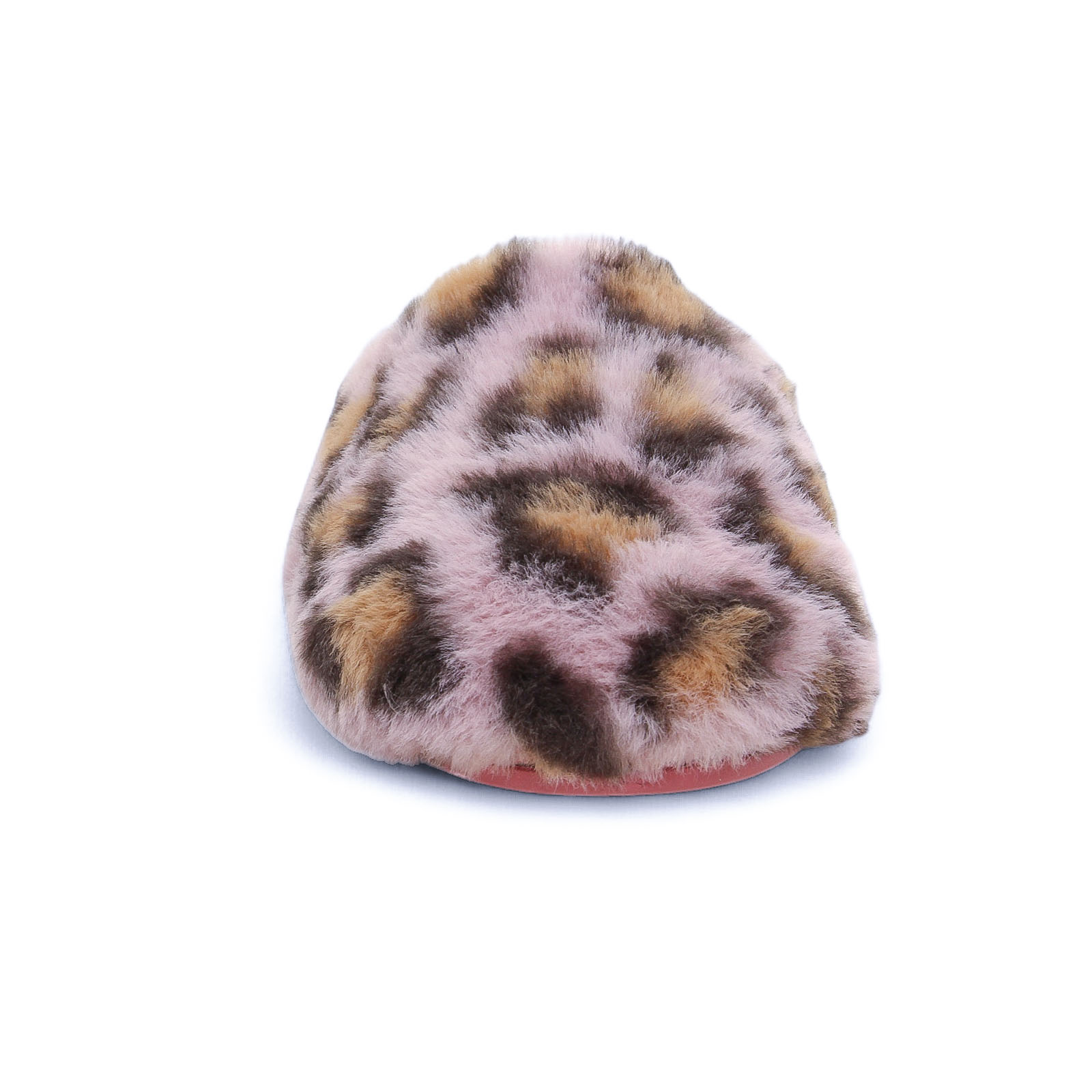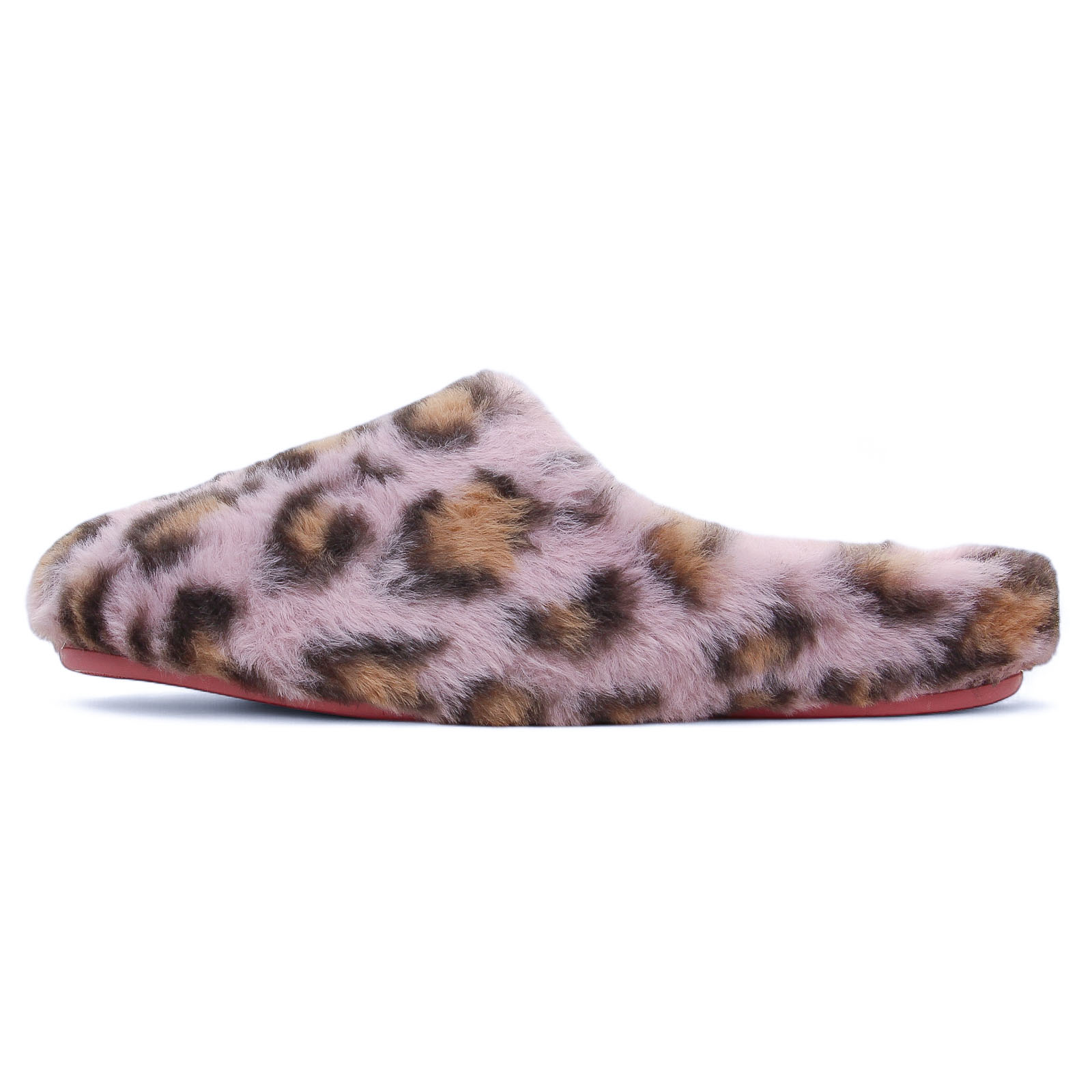 Chaussons de la marque Maison De L'espadrille de couleur rose léopard. Jolie mule chausson avec une première amovible légèrement compensée, une touche de fantaisie léopard et simili fourrure.