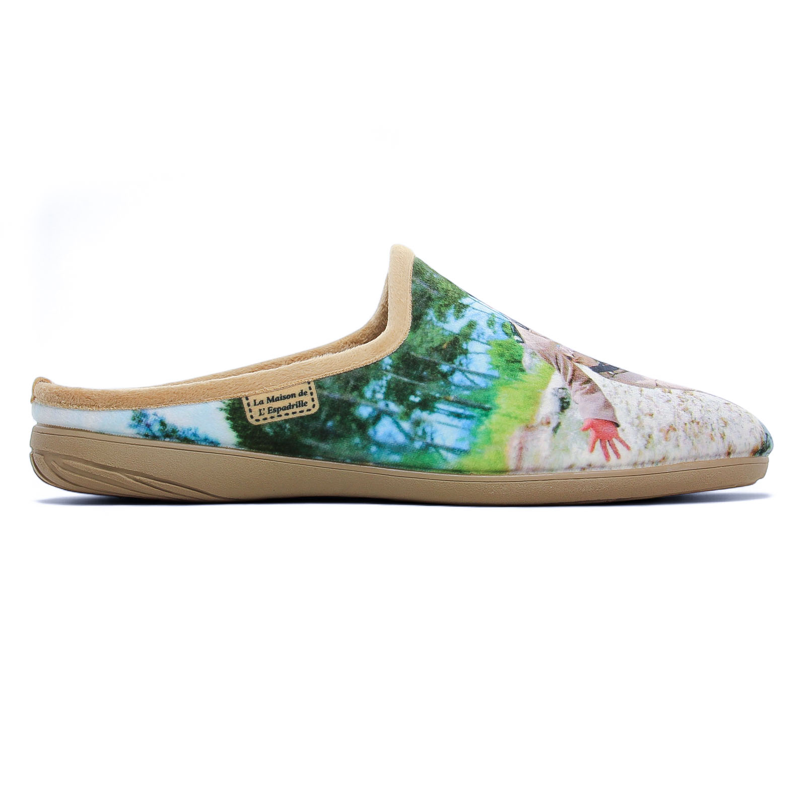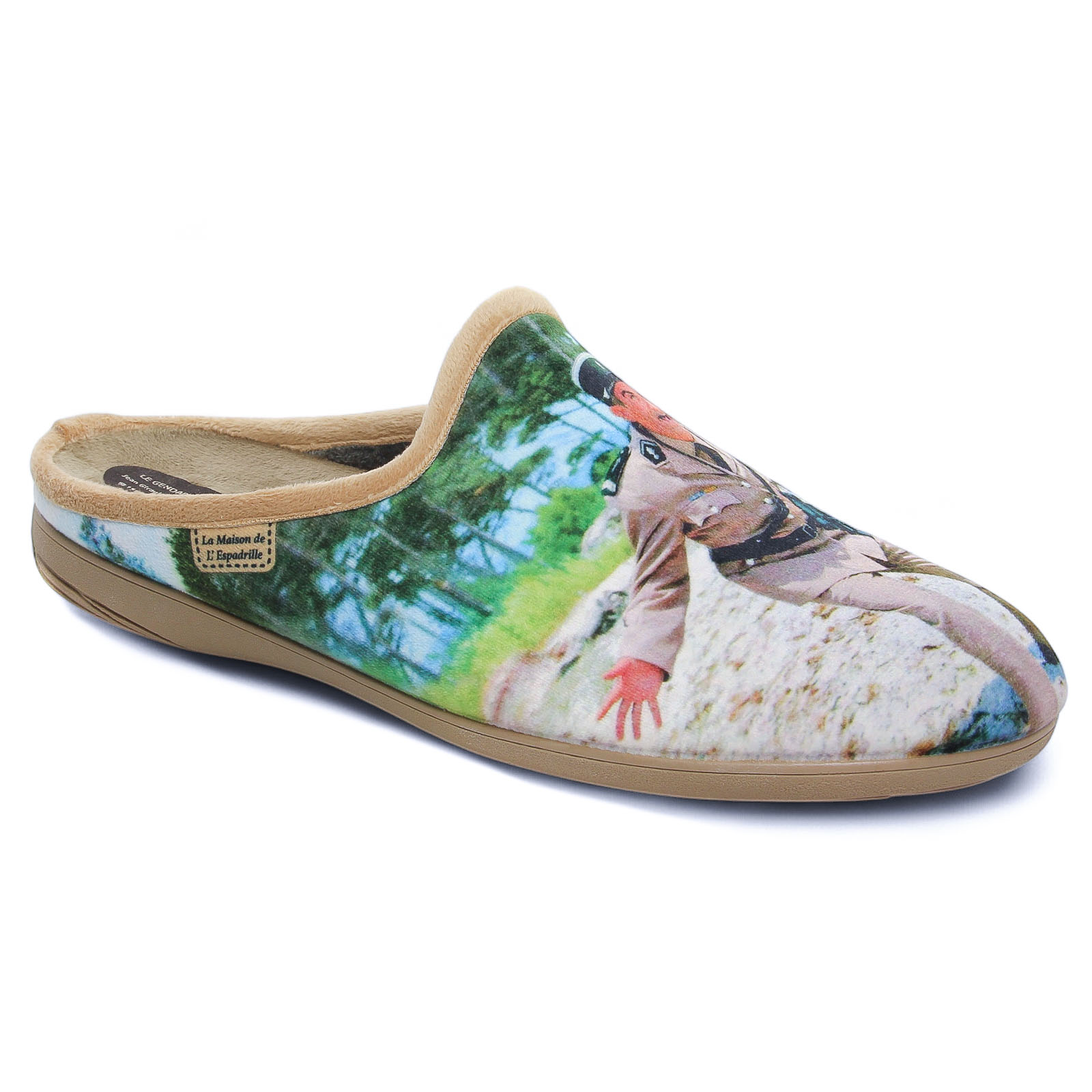 Chaussons de la marque Maison De L'espadrille de couleur gendarme beige. Mules chaussons avec l'imprimé de Louis de Funes dans les Gendarmes et Gendarmettes, un peu d'humour et de nostalgie pour vos soirées cocooning d'hiver avec les pieds bien au chaud, chaussons signés La Maison de L'espadrille.