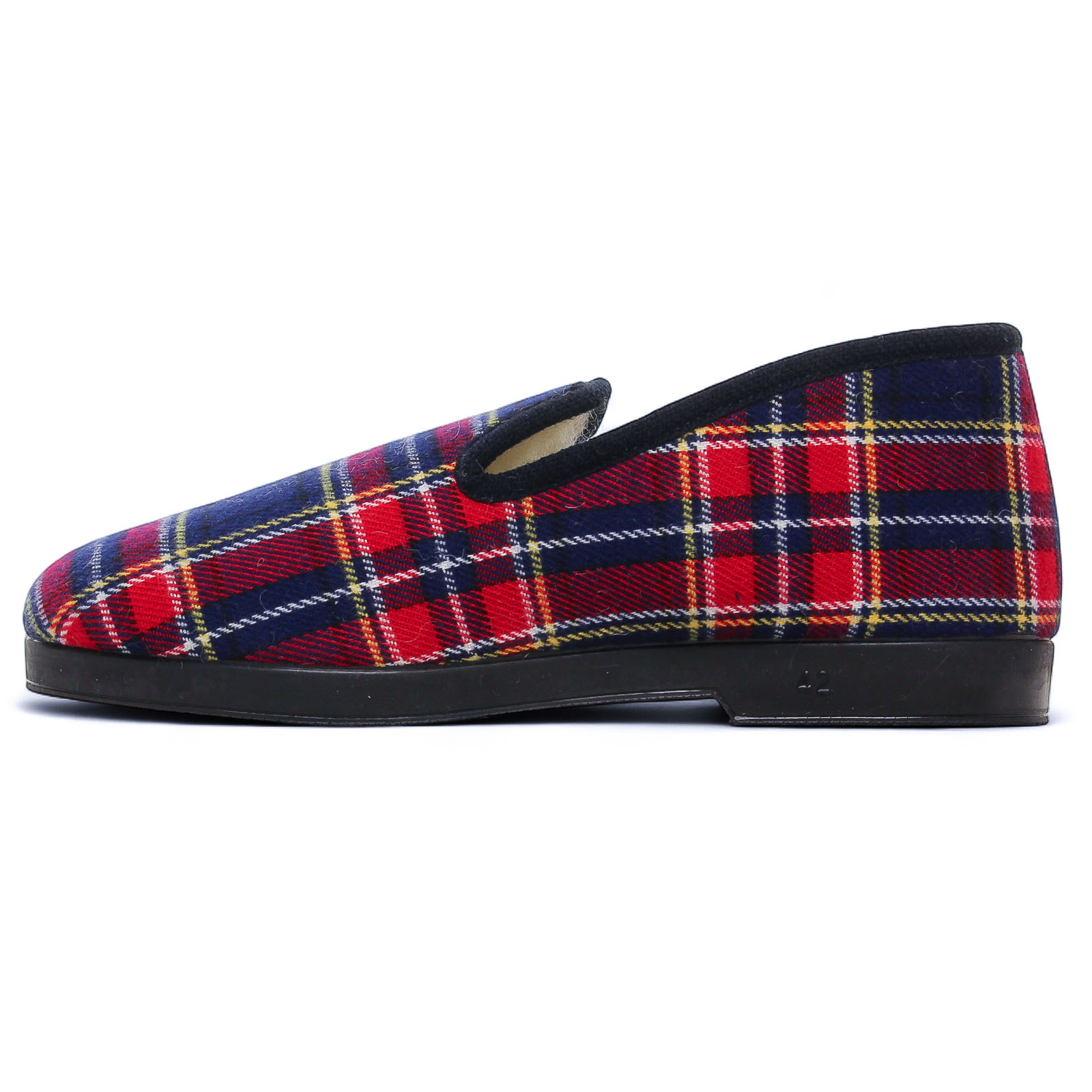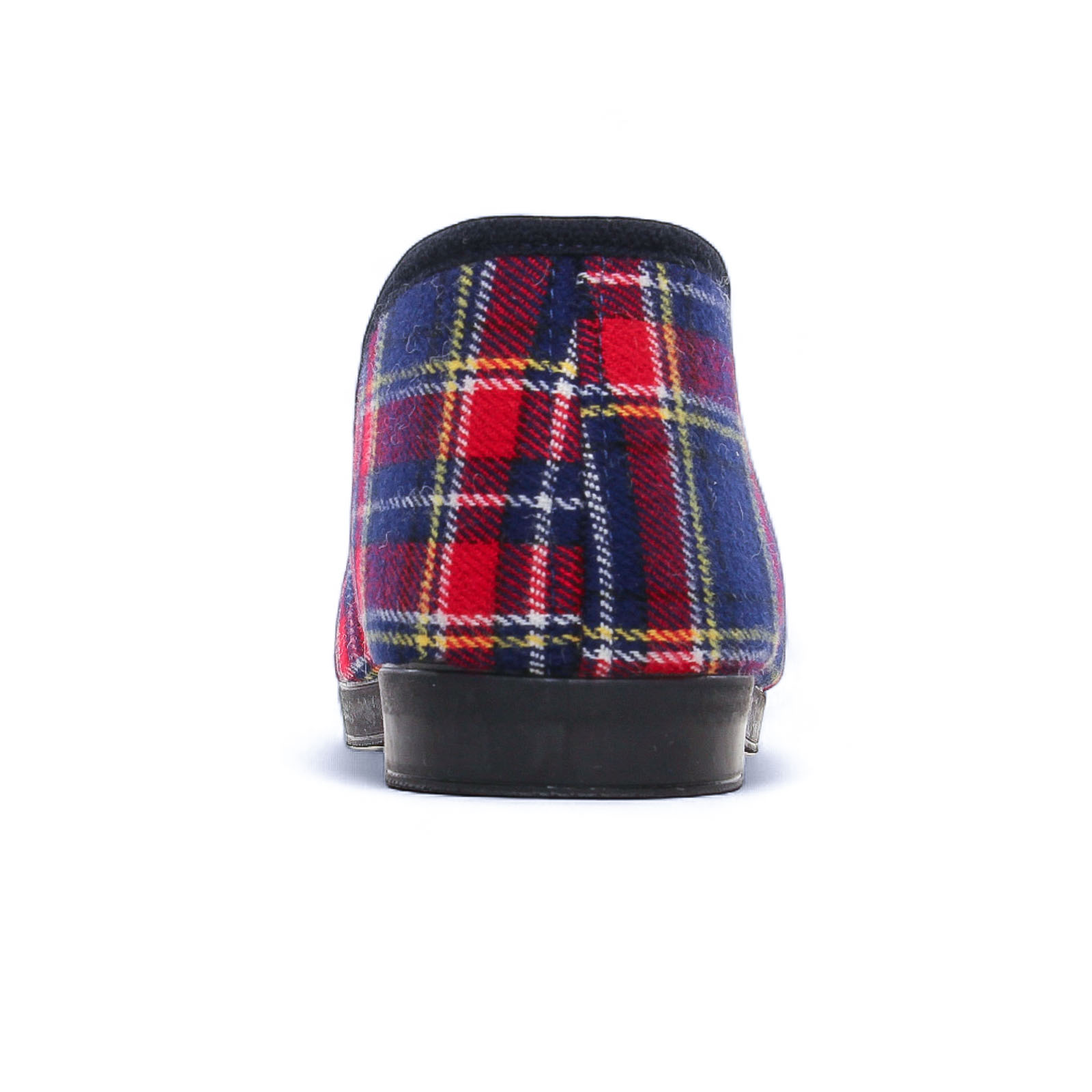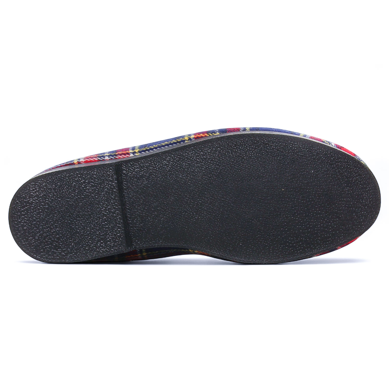 Chaussons de la marque Maison De L'espadrille de couleur bleu marine. Charentaises avec un imprimé écossais, impeccables pour vos soirées cocooning d'hiver avec les pieds bien au chaud, chaussons signés La Maison de L'espadrille.