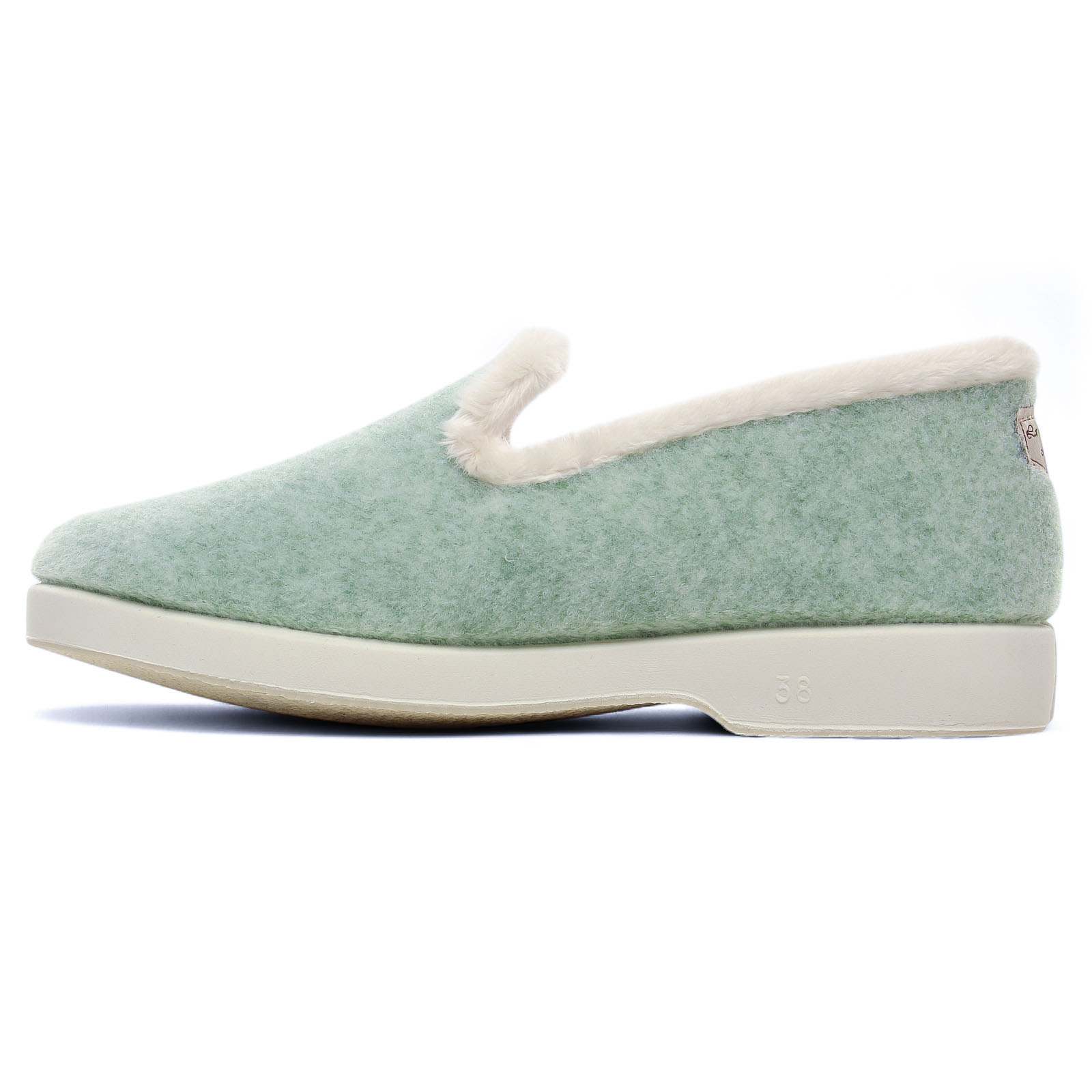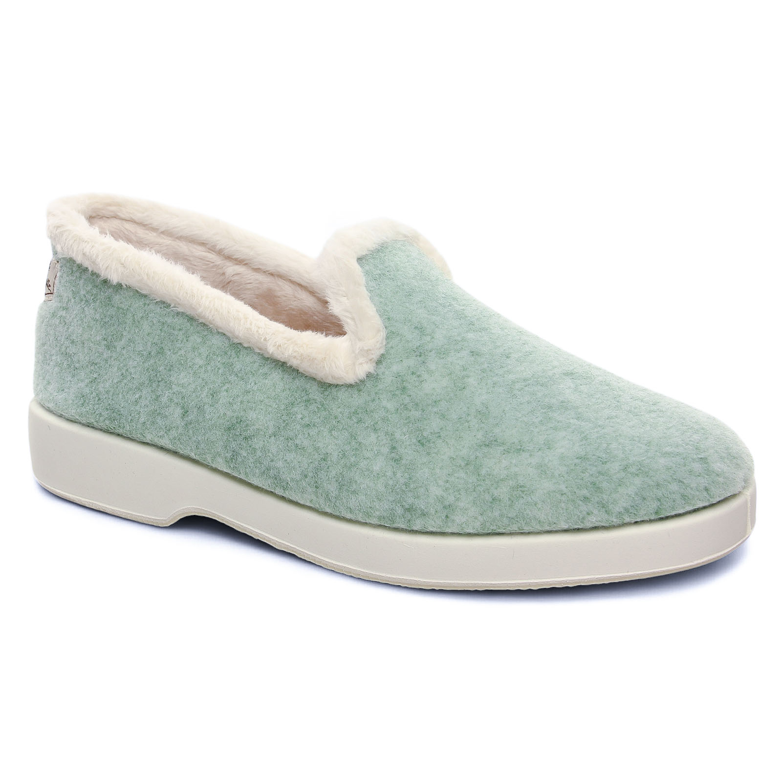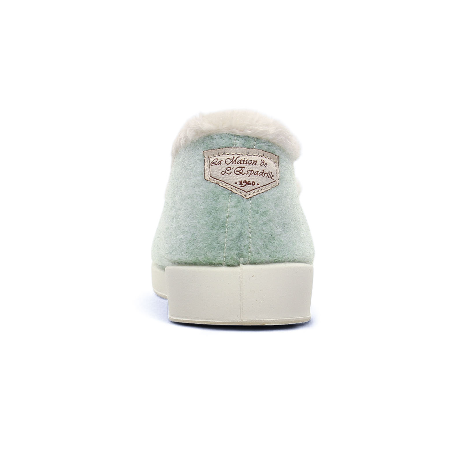 Chaussons de la marque Maison De L'espadrille de couleur vert anis. Chaussons avec une doublure chaude 100% laine, une tige textile et une semelle 100% caoutchouc, chaussons signés La Maison de l'Espadrille et disponibles dans de nombreux coloris.