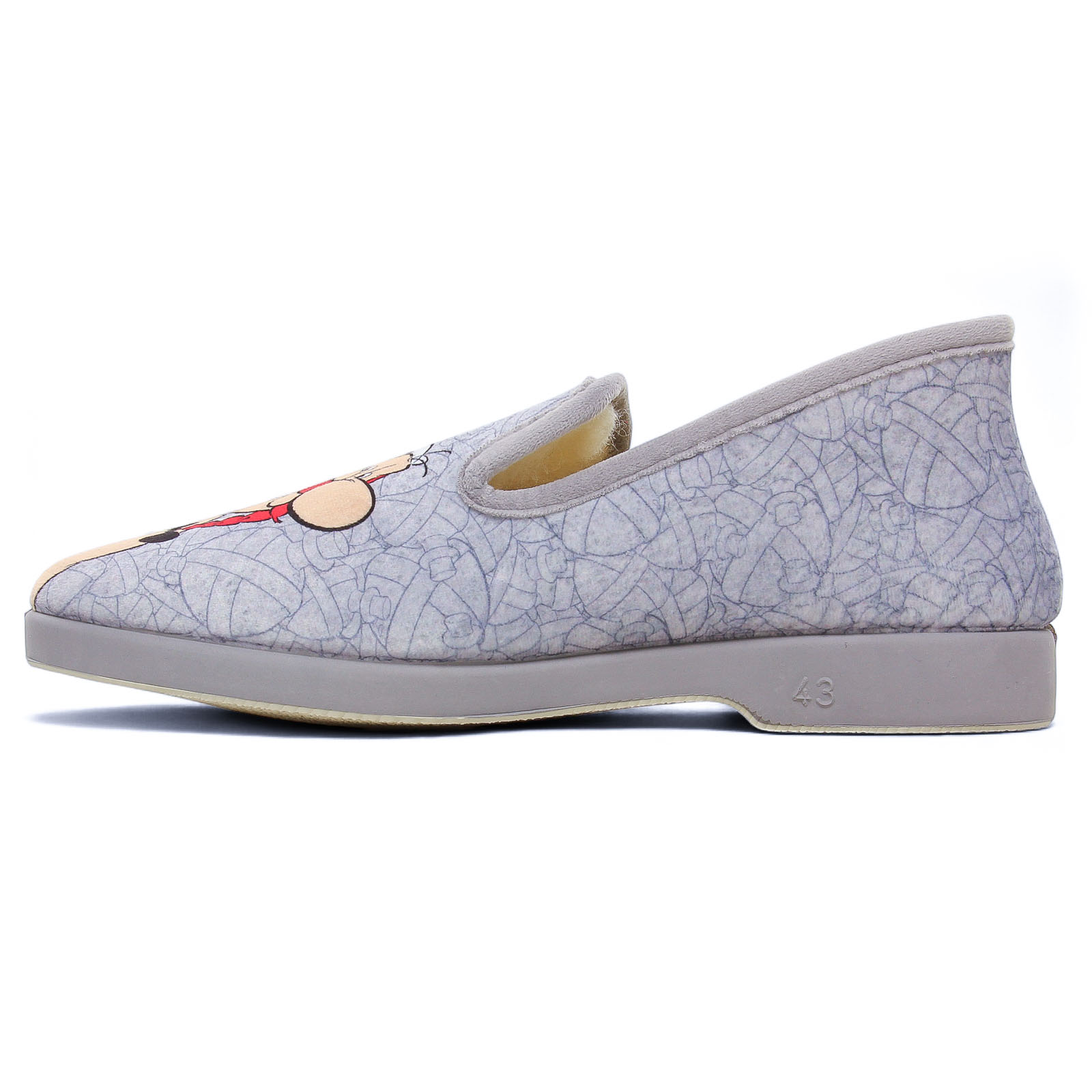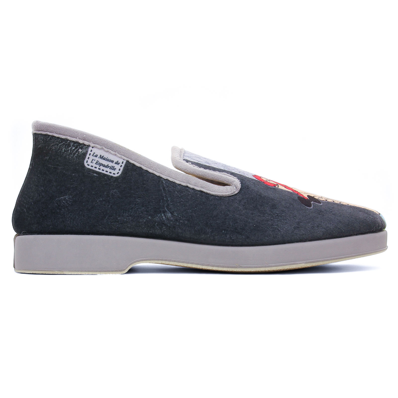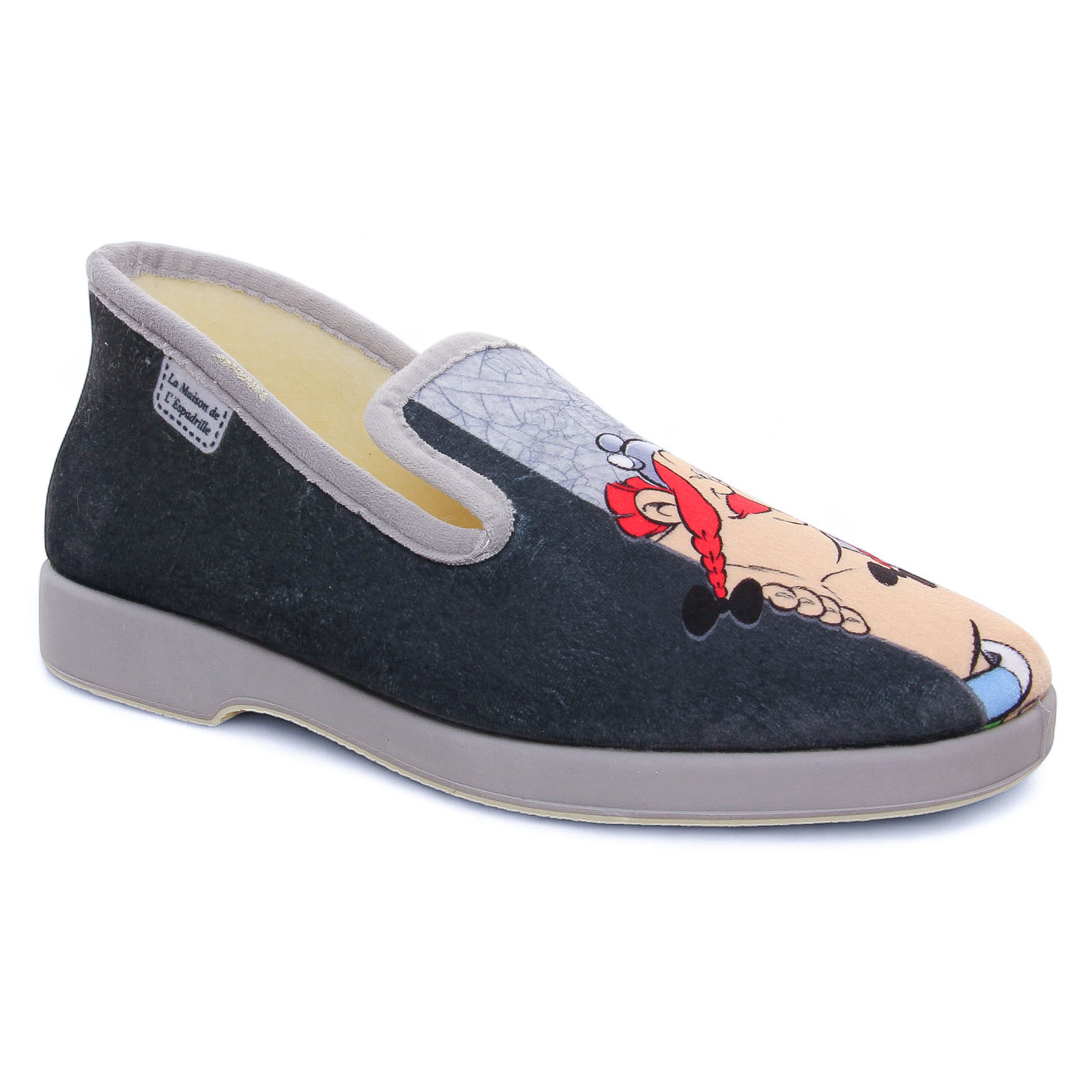 Chaussons de la marque Maison De L'espadrille de couleur asterix gris. Charentaises avec l'imprimé d'Obélix et d'Astérix, un peu d'humour BD pour vos soirées cocooning d'hiver avec les pieds bien au chaud, chaussons signés La Maison de L'espadrille.