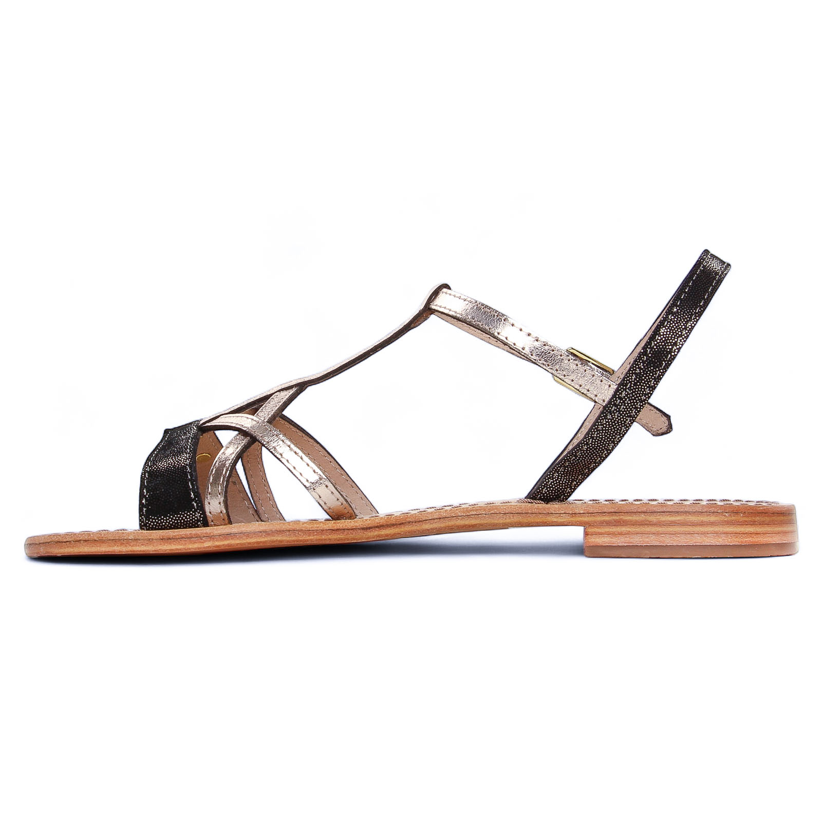 Sandales de la marque Les Tropéziennes de couleur noir irise. Un design chic et élégant, du glam à votre style estival, sandales tout cuir, mariage de textures de cuir superbes, entrelacement des brides original et moderne, les jolies sandales Hironela reviennent pour cette nouvelle collection Les Tropéziennes par M Belarbi avec une version or craquélé magnifique !