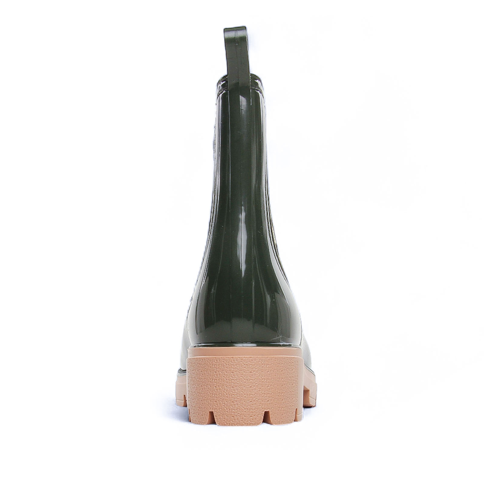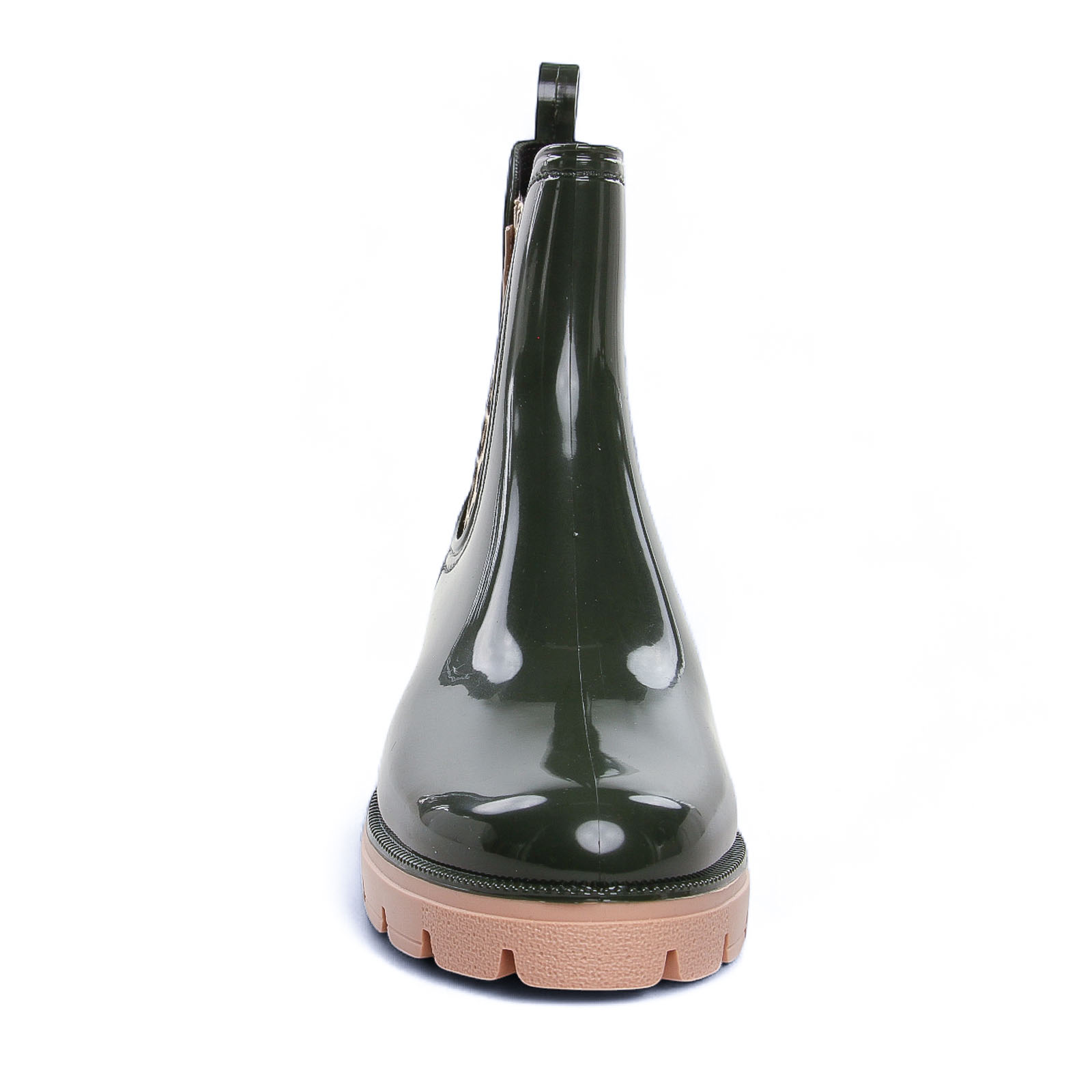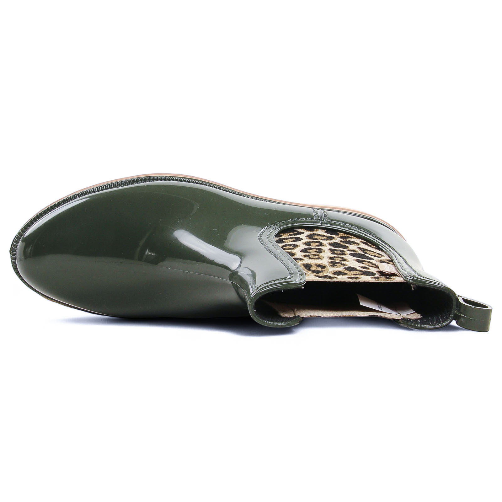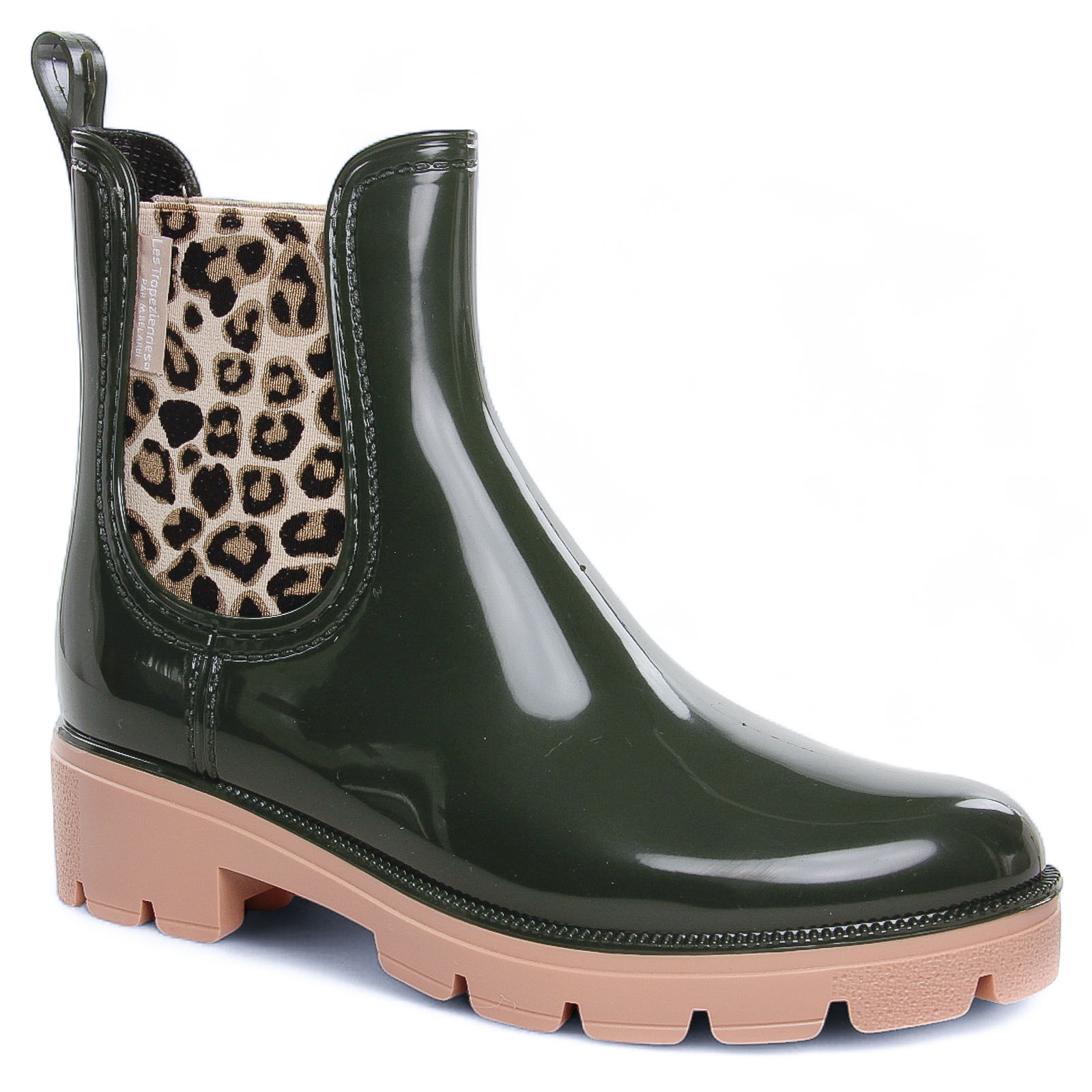 Boots Élastiquées de la marque Les Tropéziennes de couleur vert kaki. Bottines Chelsea de pluie une version crème élastique coté impression zèbre, une autre en vert kaki et impression léoperd sur les ganses élastiquées, un talon haut de 4 cm et un plateau de 2,5 cm à l'avant, une semelle couleur chair, affrontez les intempéries avec style !