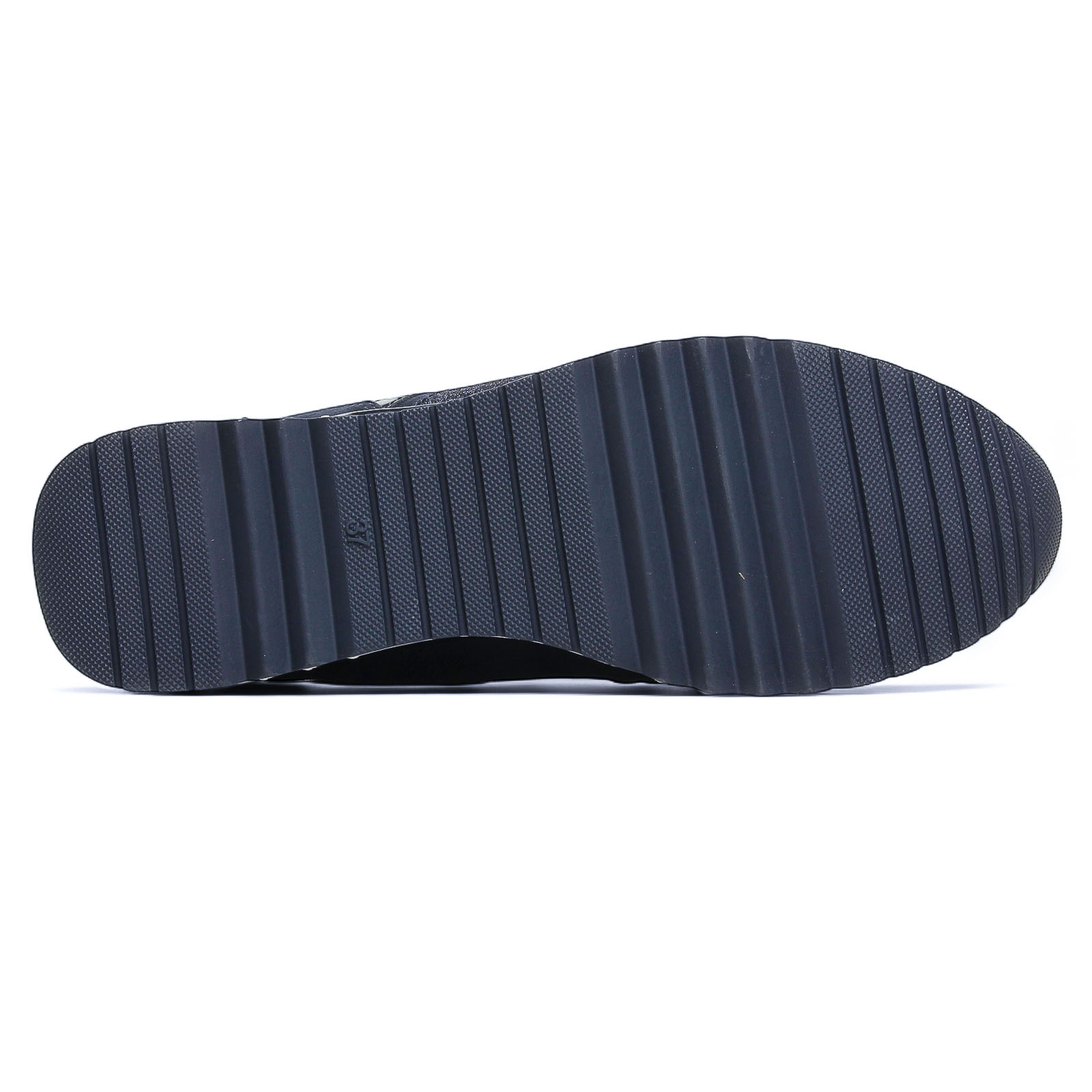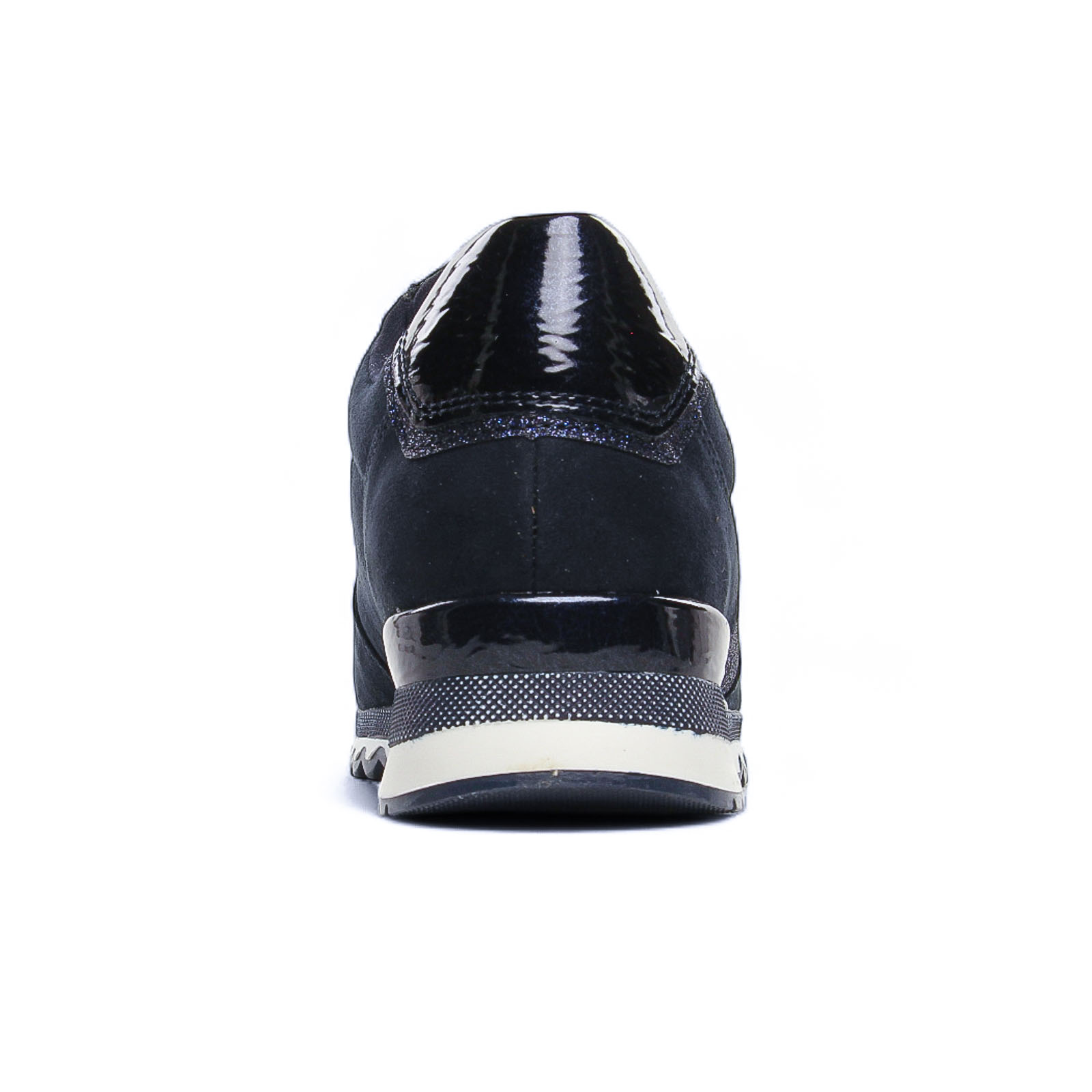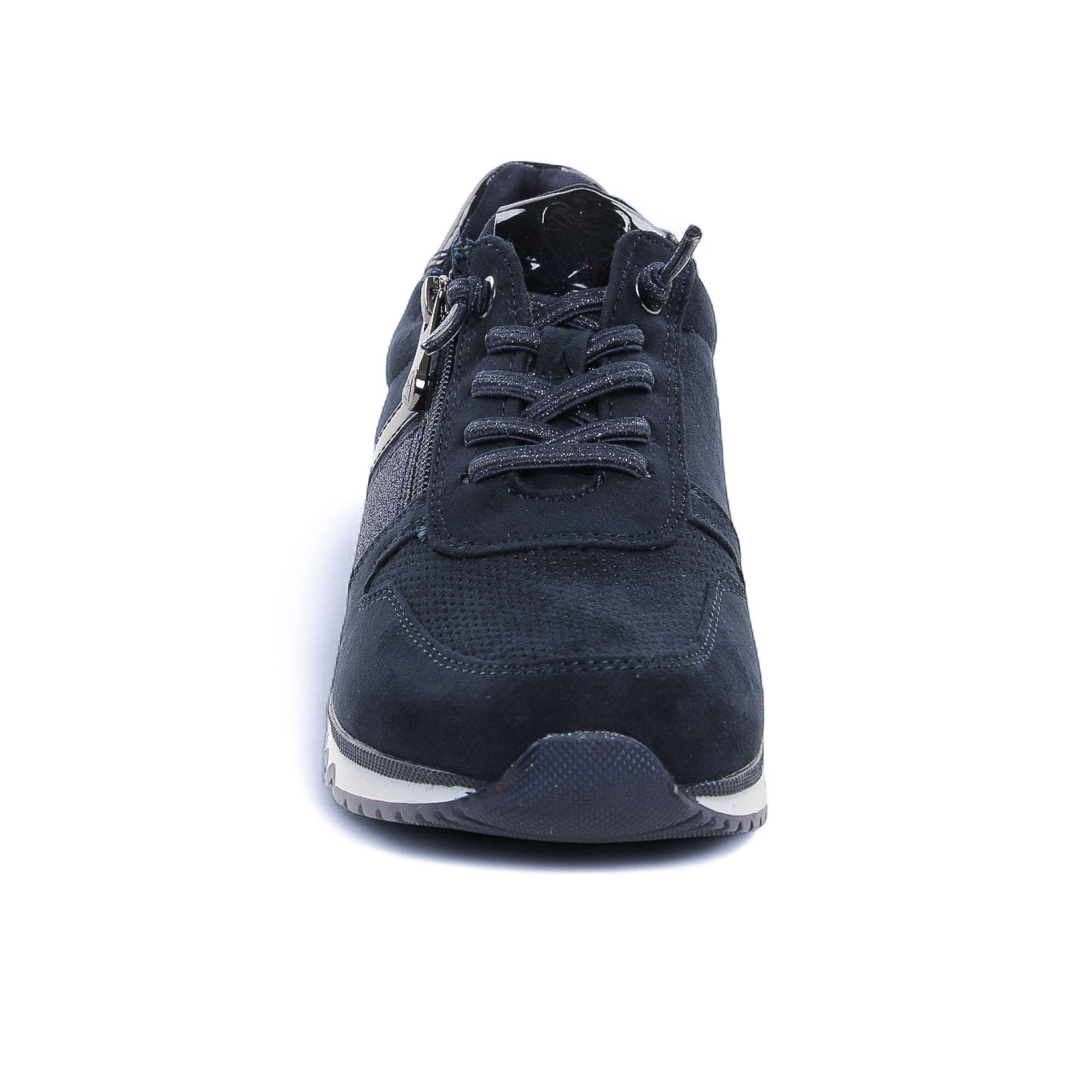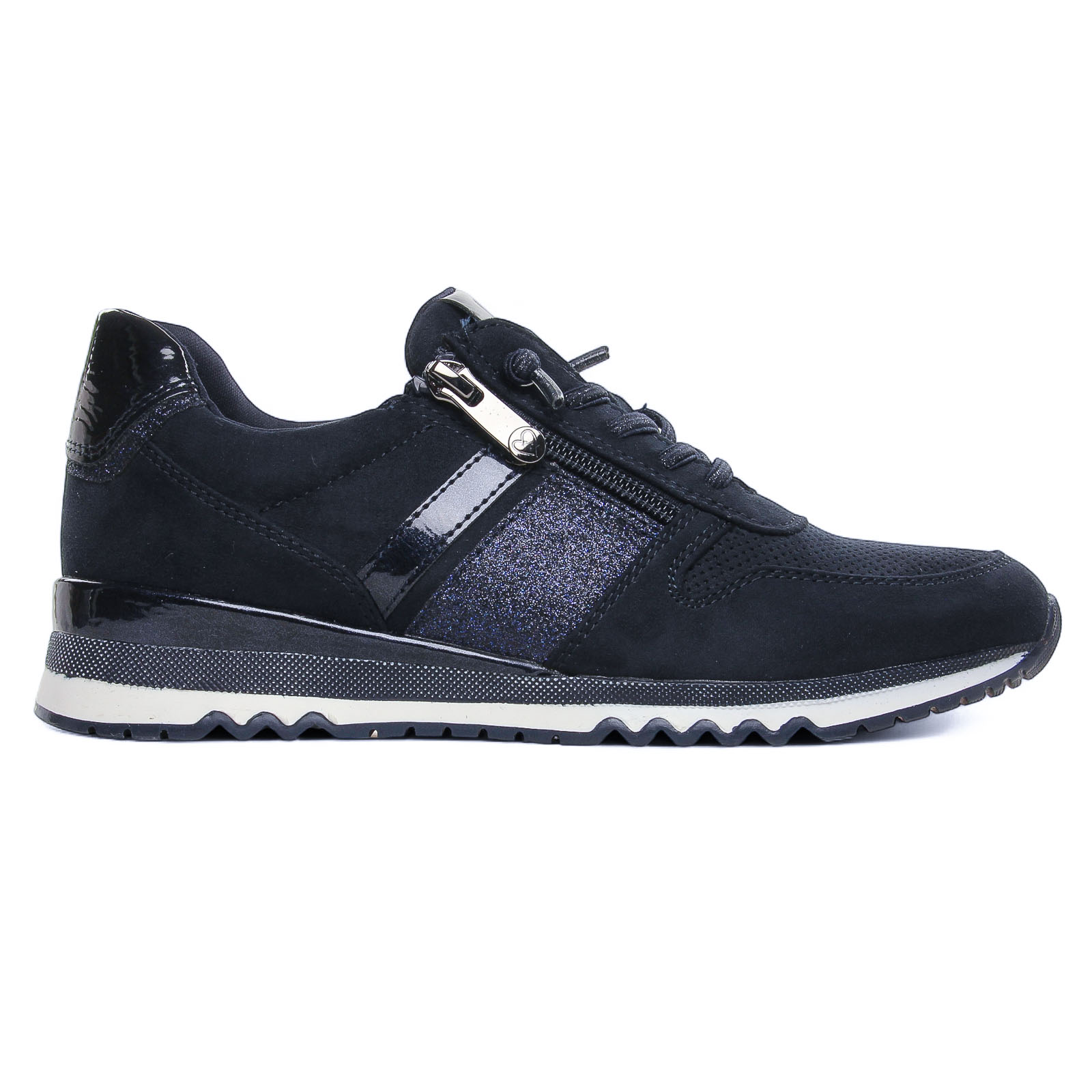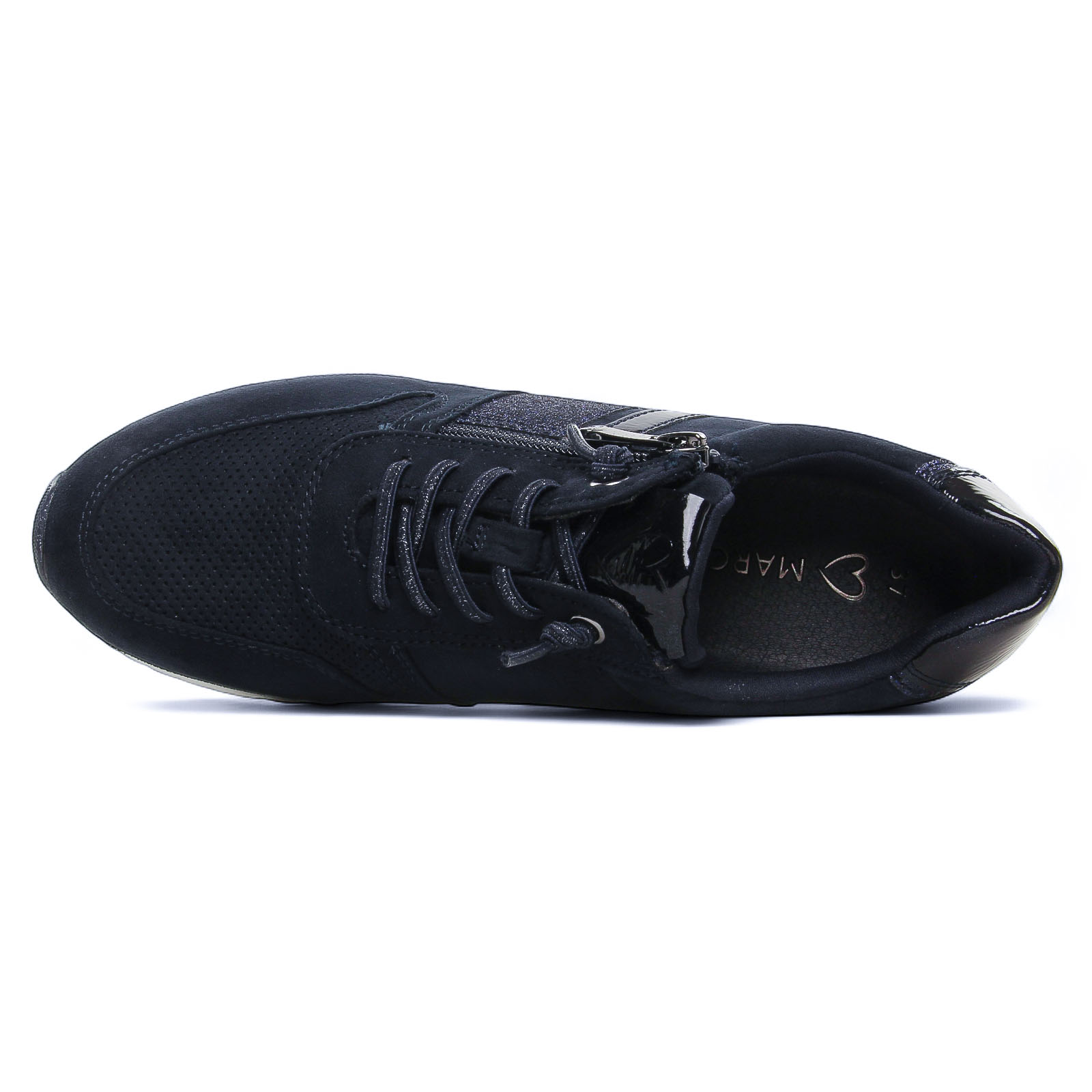 Baskets Mode de la marque Marco Tozzi de couleur bleu foncé. Sneaker pour femme confortable et élégante, tige textile et simi beige effet nubuck, baskets habillée, une première de propreté Feel Me confortable, paillettes or et un empiècement or à l'arrière de la chaussure, un zip et des lacets élastiqués qui permettent un effilement sans effort !