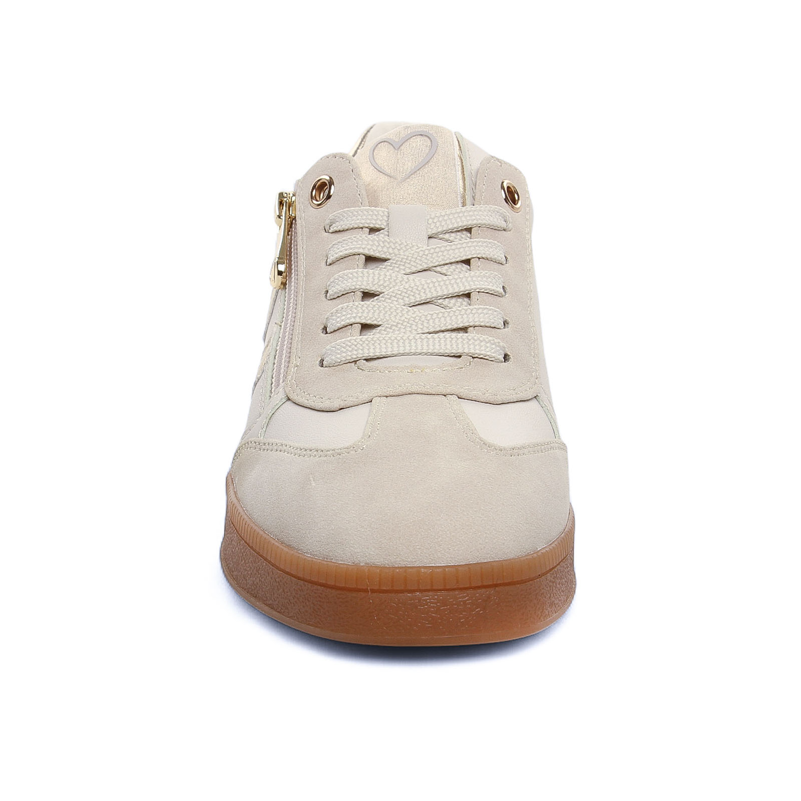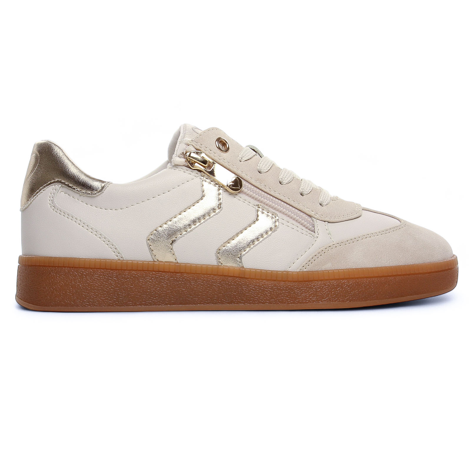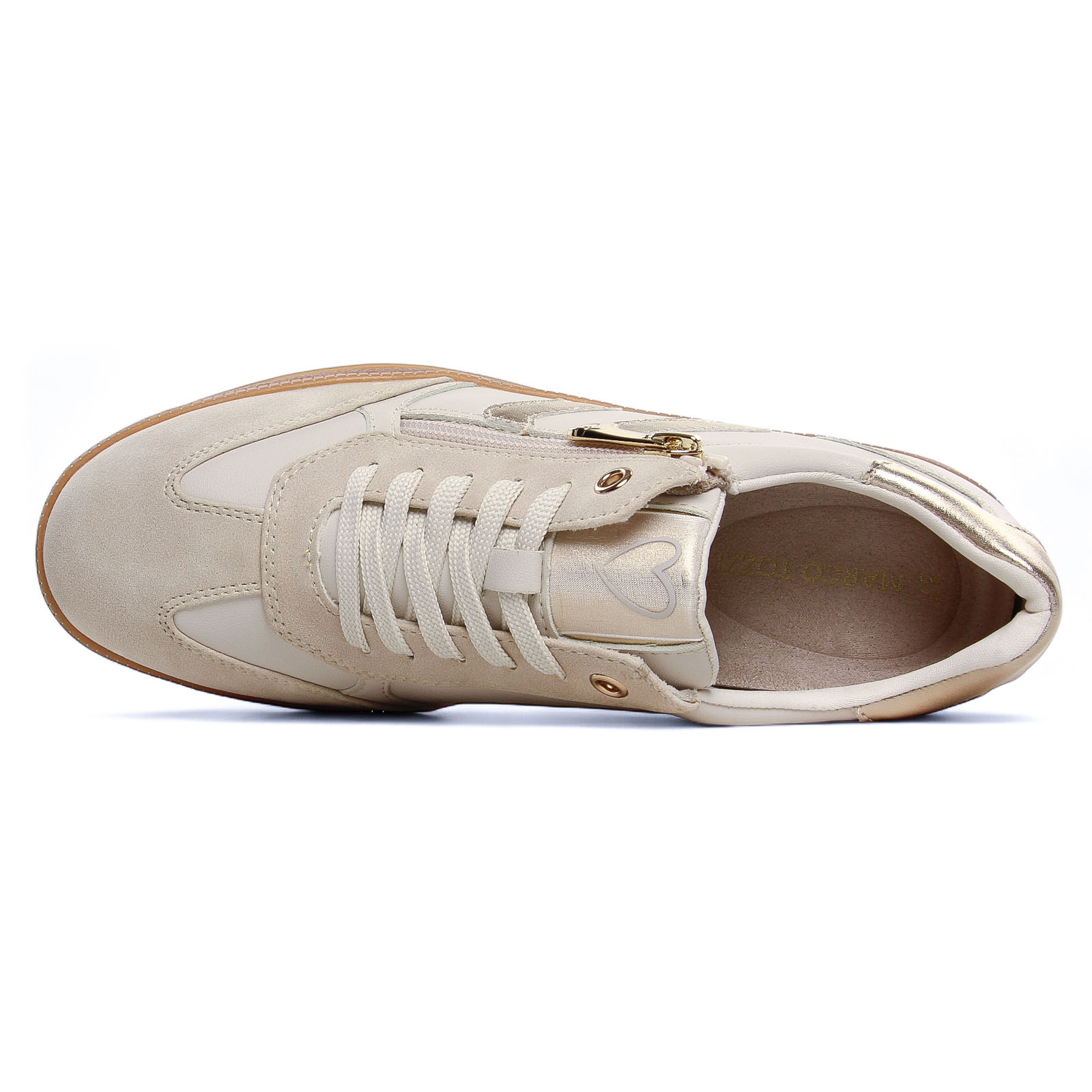 Baskets Mode de la marque Marco Tozzi de couleur blanc crème. Sneakers de la gamme végane, un bout rond, une tige avec un effet nubuck noir, insert au talon et sur le coté couleur blanc, une version crème et insert doré, un zip et des lacets coton, une première amovible et confortable, semelle effet crêpe.