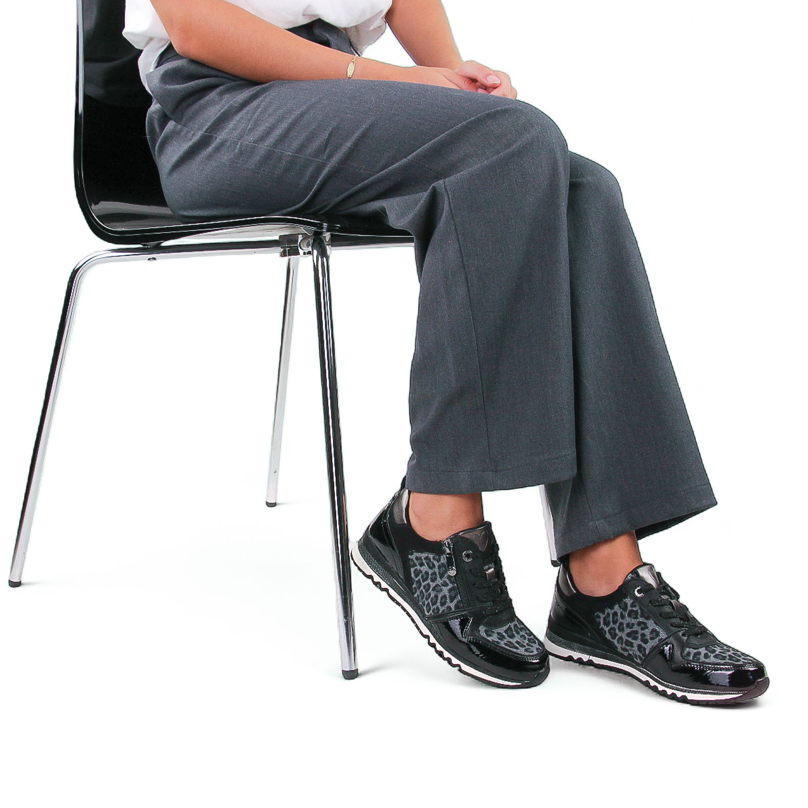 Baskets Mode de la marque Marco Tozzi de couleur noir gris. Baskets basses tendances signées par Marco Tozzi, chics et confortables, une première amovible, une tige construite avec modernité et originalité, des touches de léopard pour plus de glamour ! Parfaites pour une tenue décontracte et à un prix démocratique !