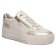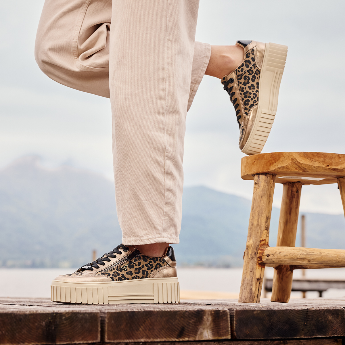 Baskets Compensees de la marque Marco Tozzi de couleur beige bronze. Élégante et glamour cette sneaker Marco Tozzi nouvelle collection 2025, une semelle plateforme crème en gomme légère haute de 5 cm au talon, tige vernis imprimé léopard, première confortable et amovible, un très beau modèle signé par la marque allemande.