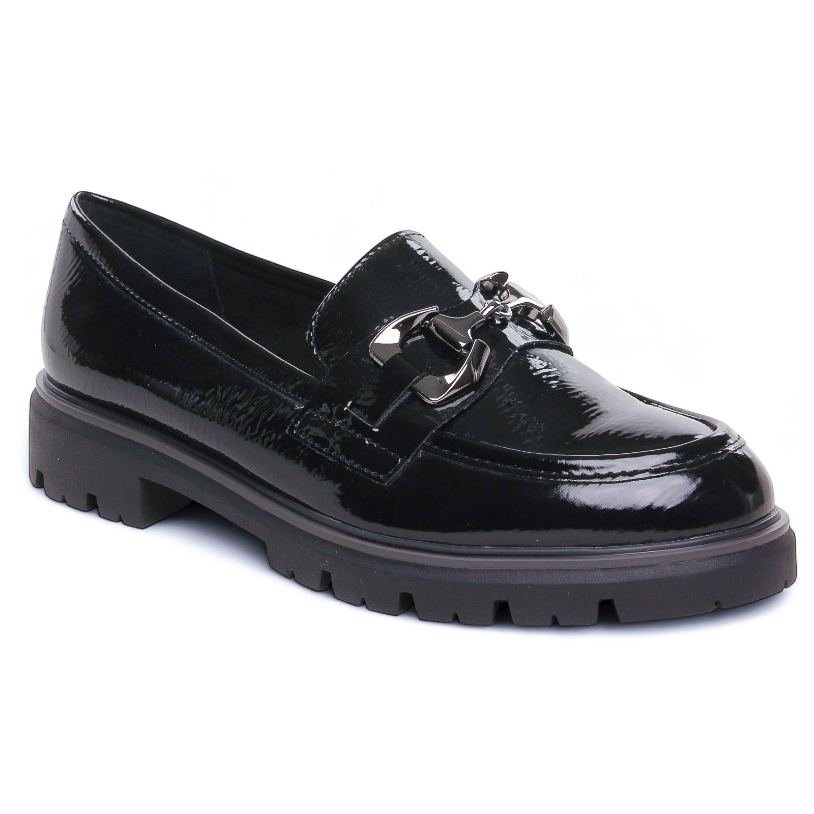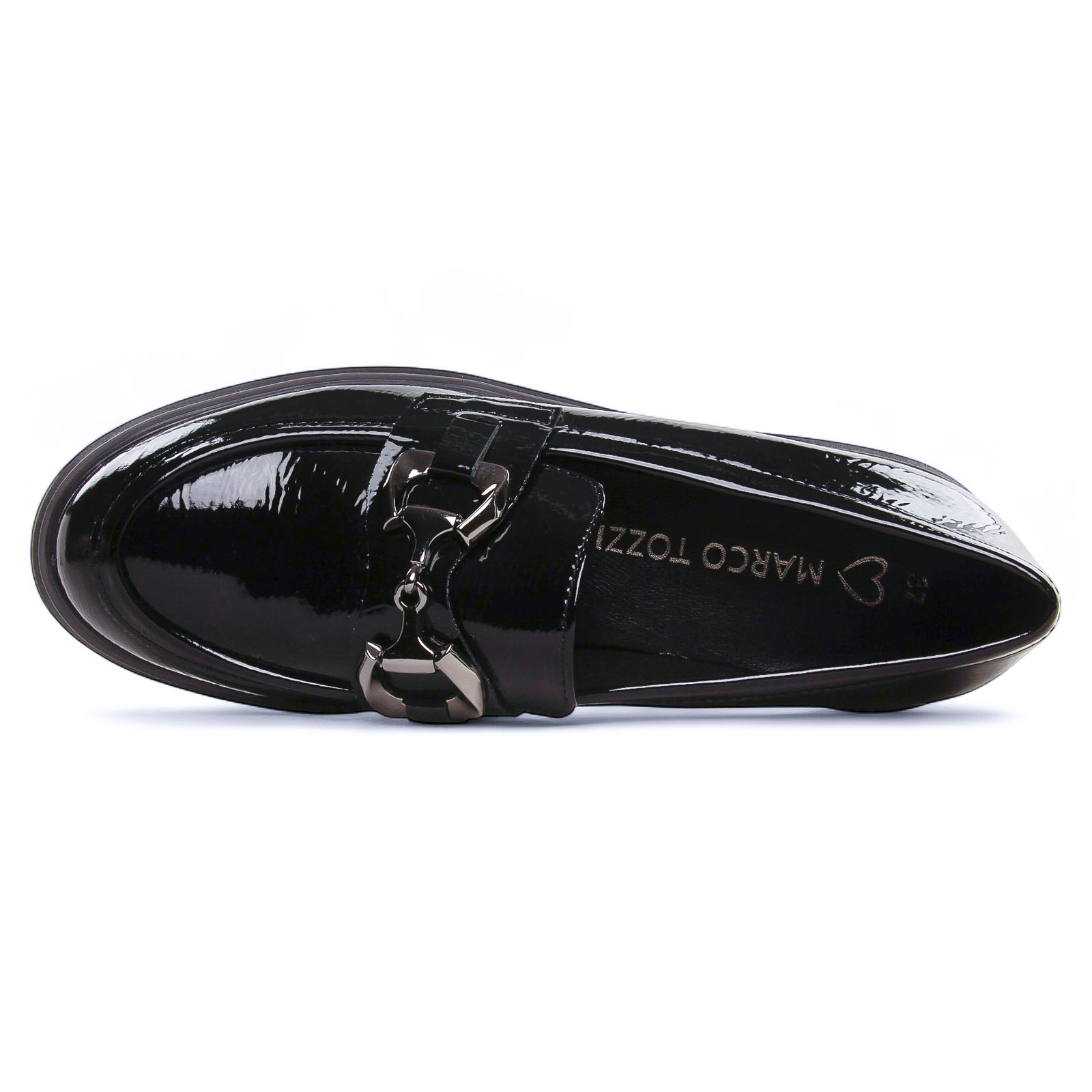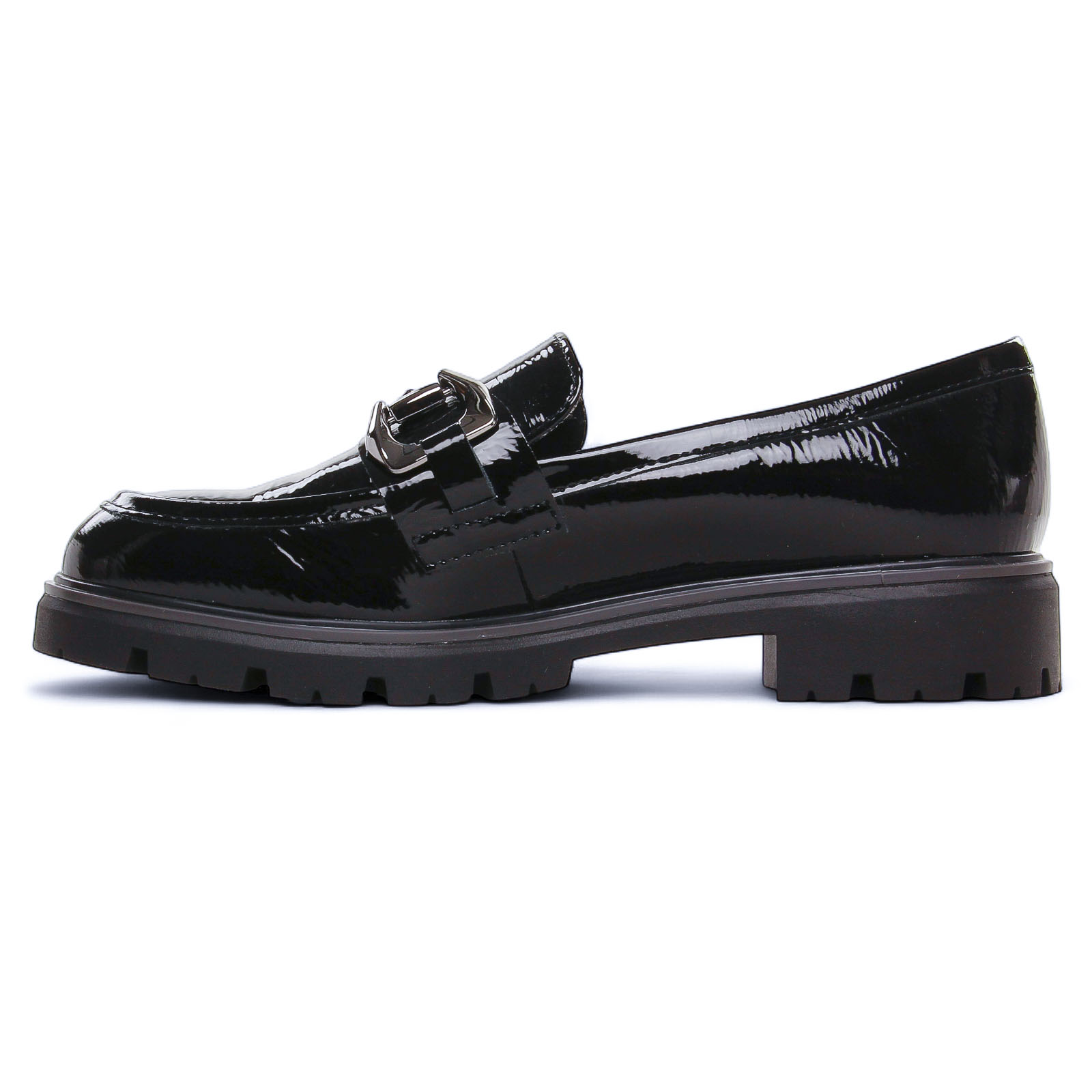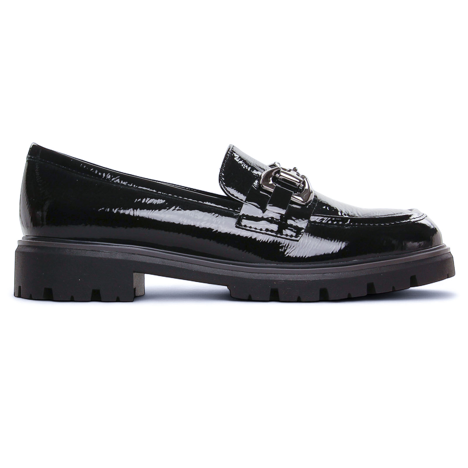 Mocassins de la marque Marco Tozzi de couleur noir vernis. Un beau mélange de genre, un mocassin classique sur une semelle crantée influence roots, une chaine à grosse maille arbore le haut du plateau, une tige en simili cuir vernis, une première ergonomique confortable, mocassins chics et modernes reviennent pour cette nouvelle collection automne Vegan hiver de chez Marco Tozzi.