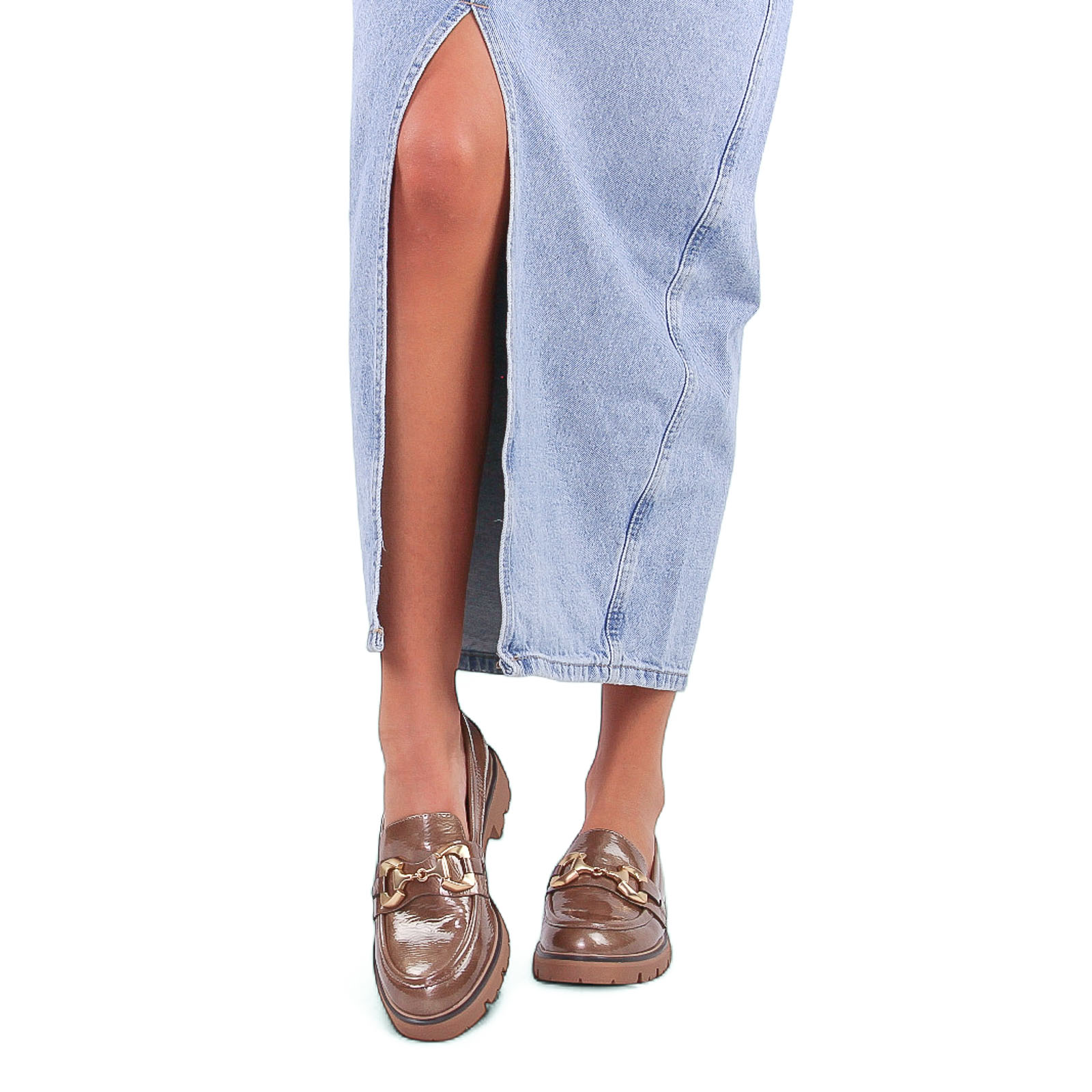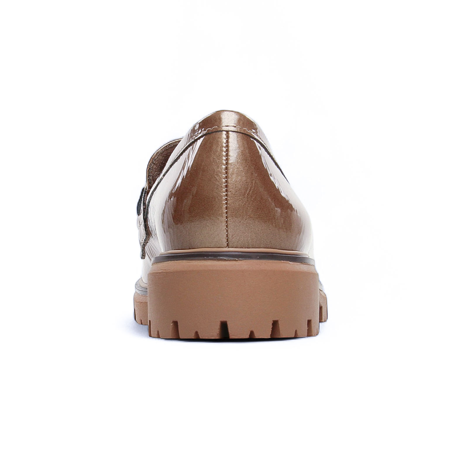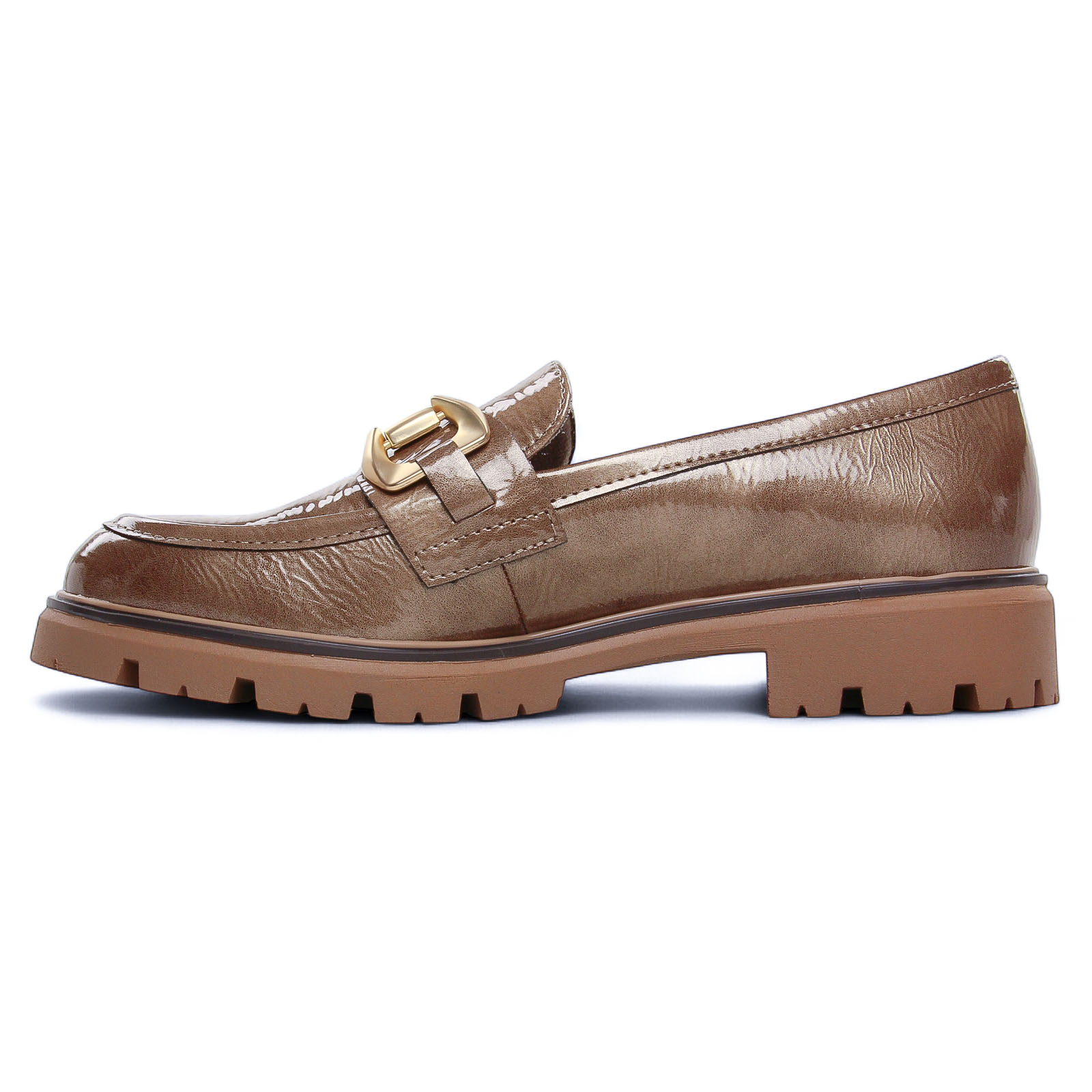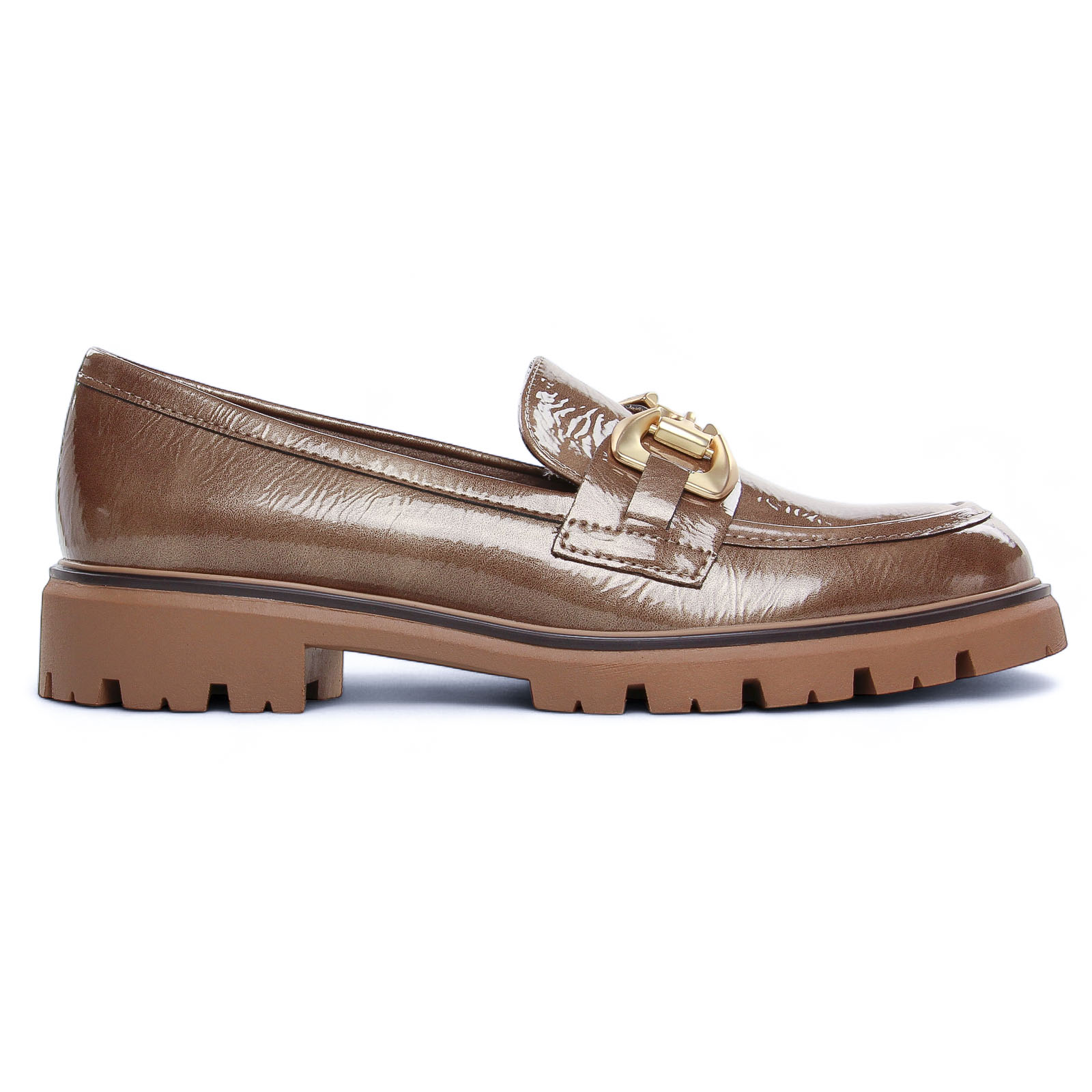 Mocassins de la marque Marco Tozzi de couleur beige taupe. Un beau mélange de genre, un mocassin classique sur une semelle crantée influence roots, une chaine à grosse maille arbore le haut du plateau, une tige en simili cuir vernis, une première ergonomique confortable, mocassins chics et modernes reviennent pour cette nouvelle collection automne Vegan hiver de chez Marco Tozzi.