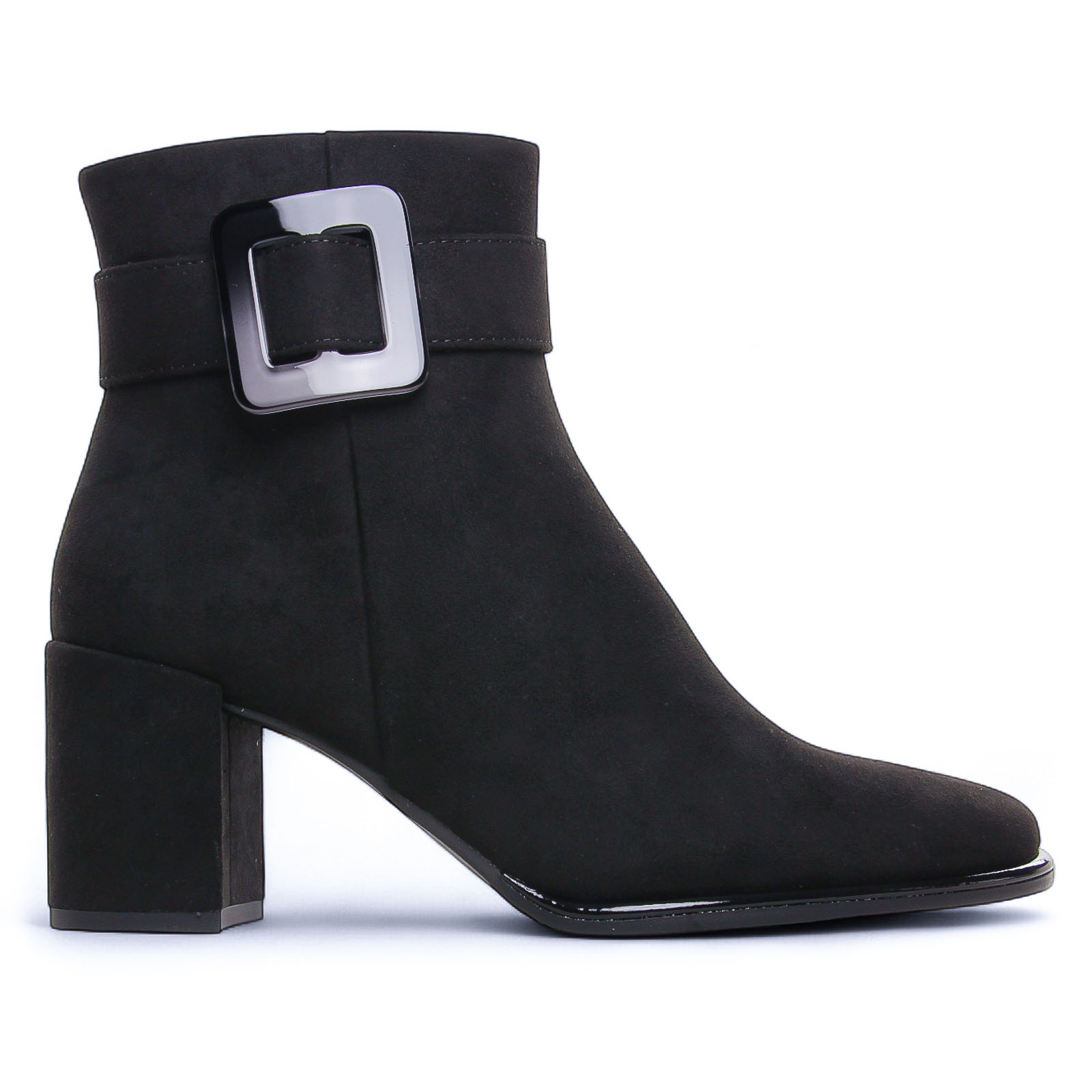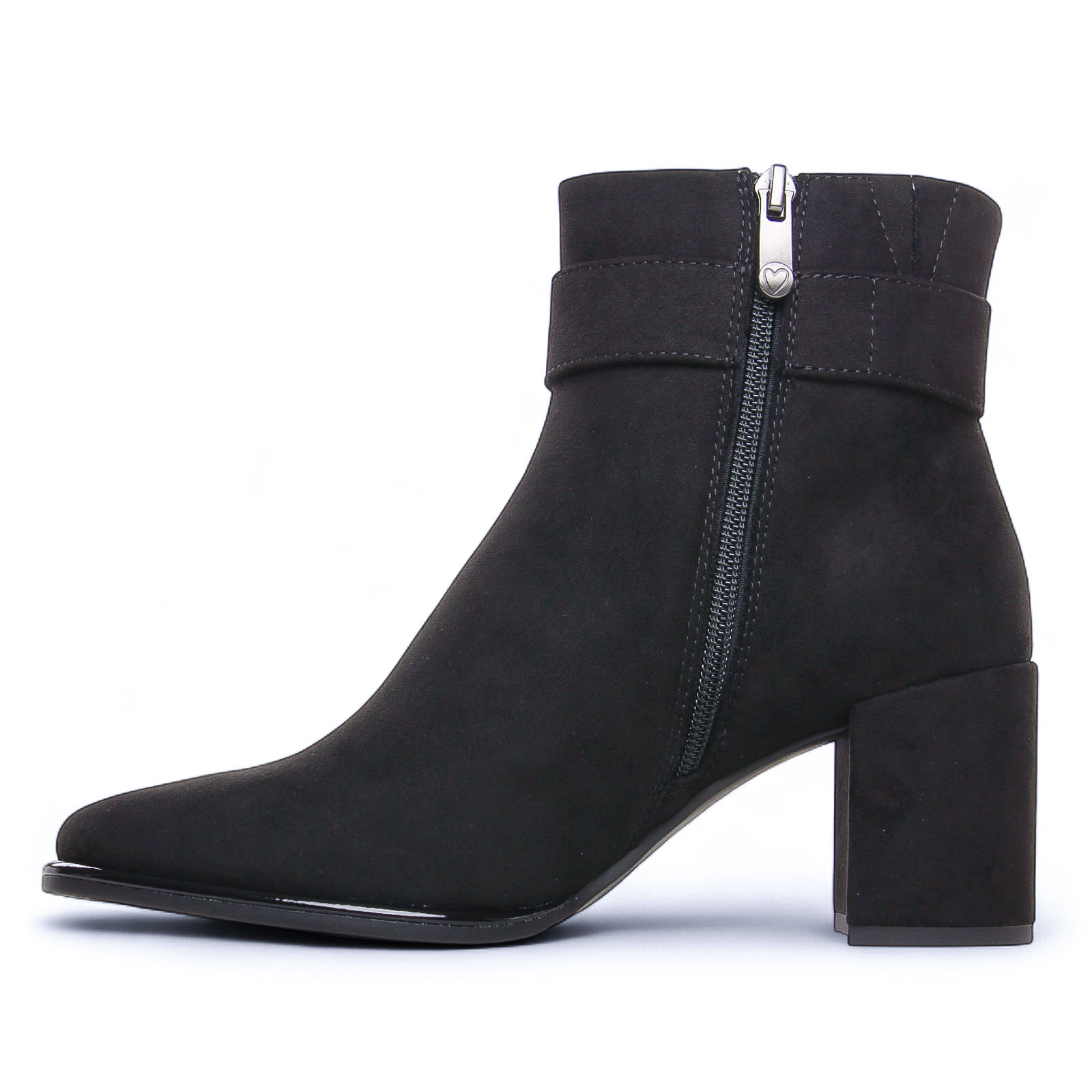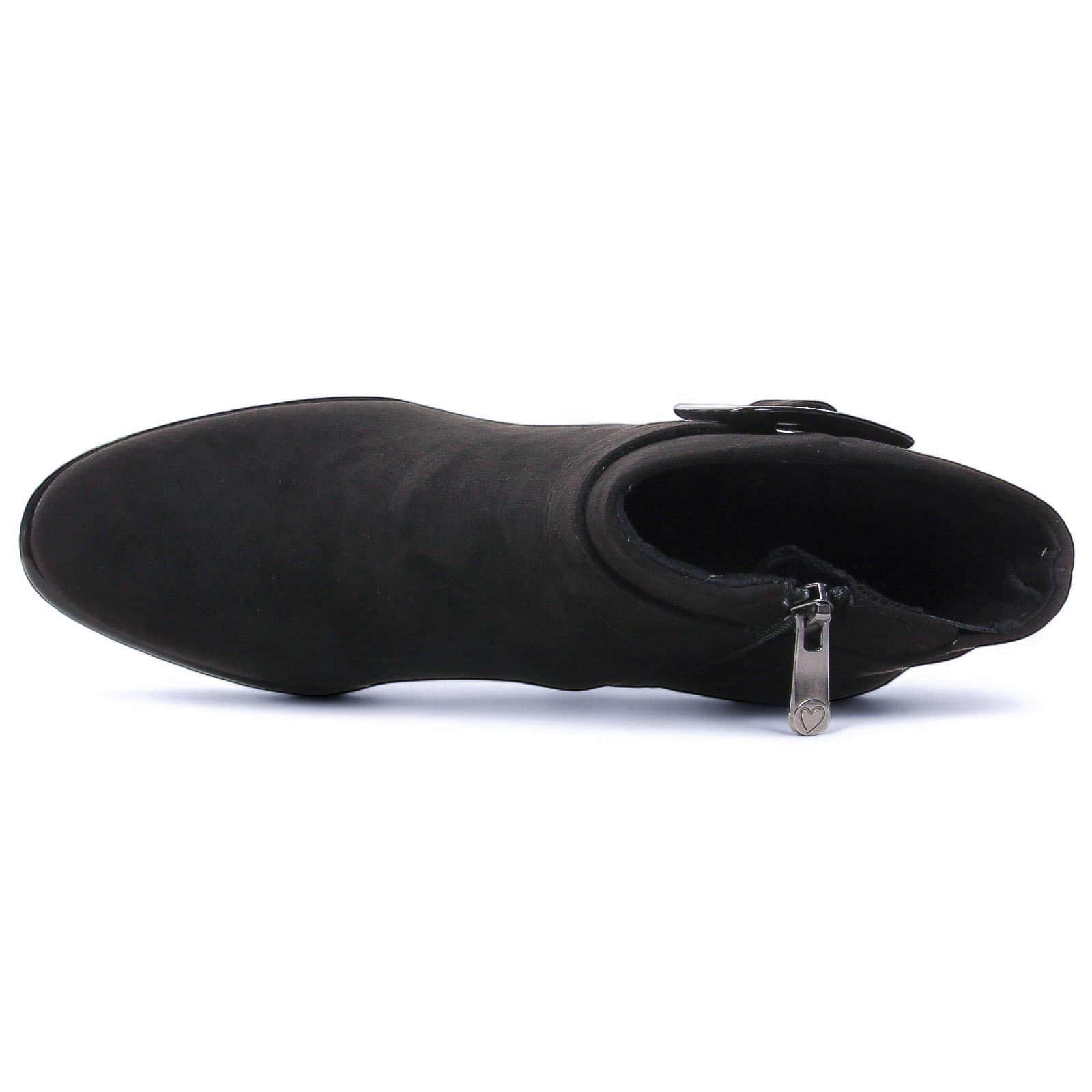 Bottines À Talon de la marque Marco Tozzi de couleur noir. Un talon haut de 7 cm pour ces jolies boots en velours beige ou noir pour cette nouvelle collection automne-hiver 2025, une bride fantaisie large à ornée d'une boucle métal carré moderne, un zip pour les chausser facilement, boots à talon chics et élégantes tout en étant confortable à un prix abordable : merci Marco Tozzi !