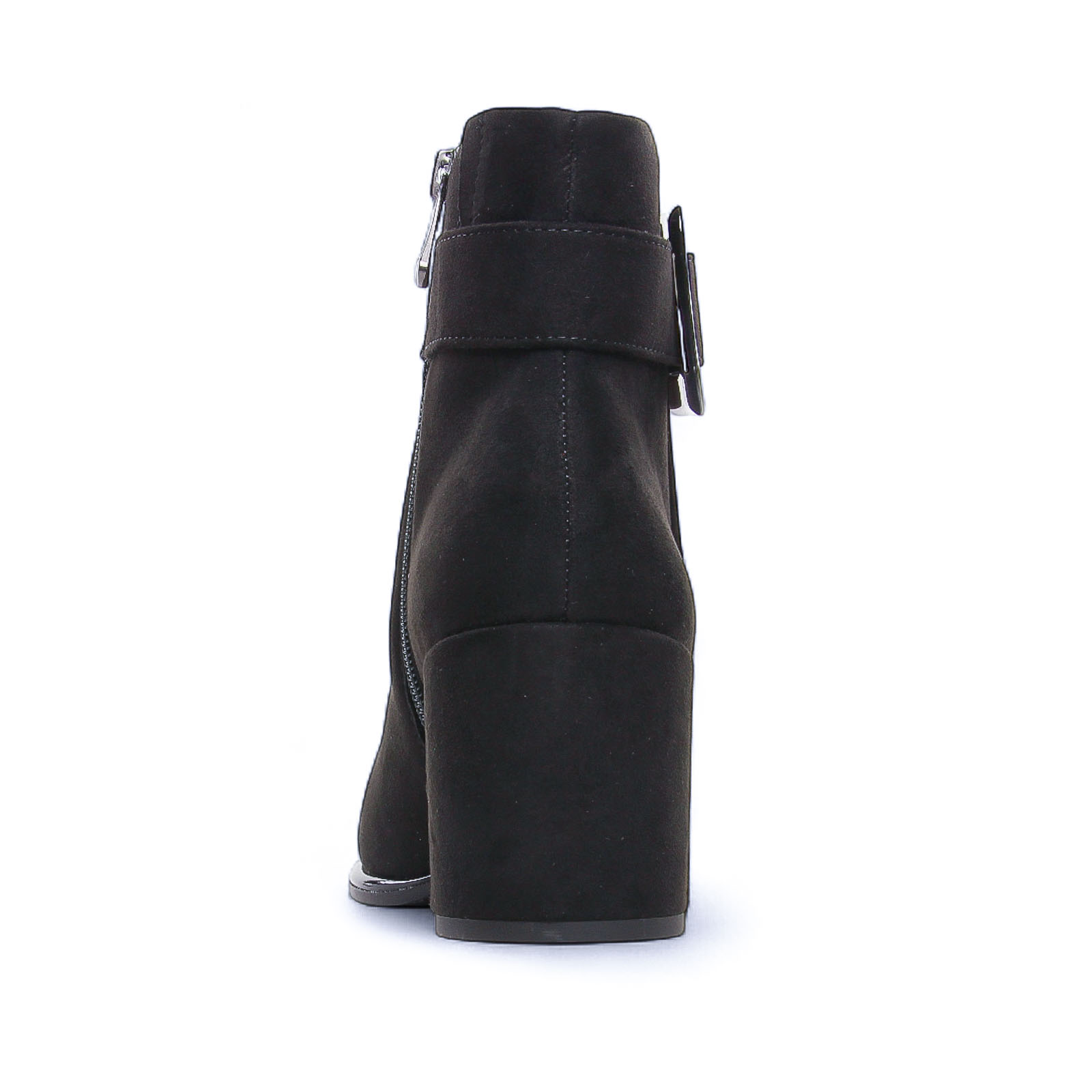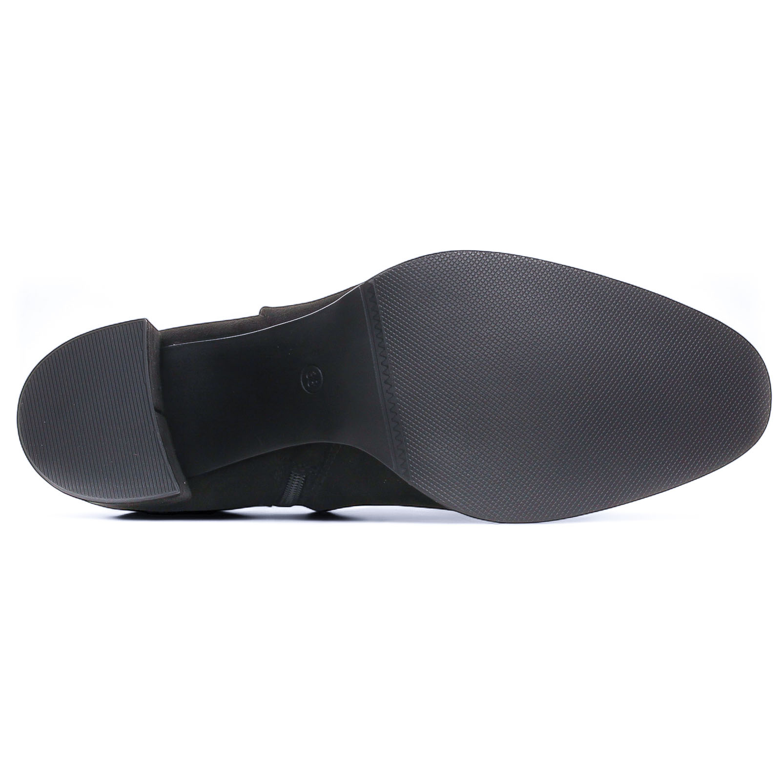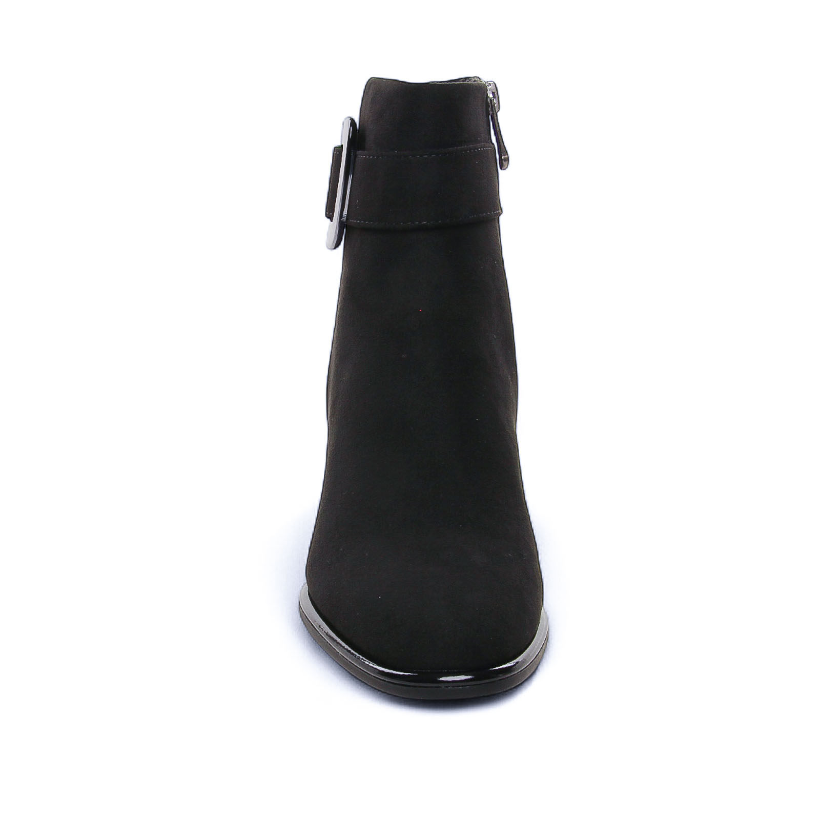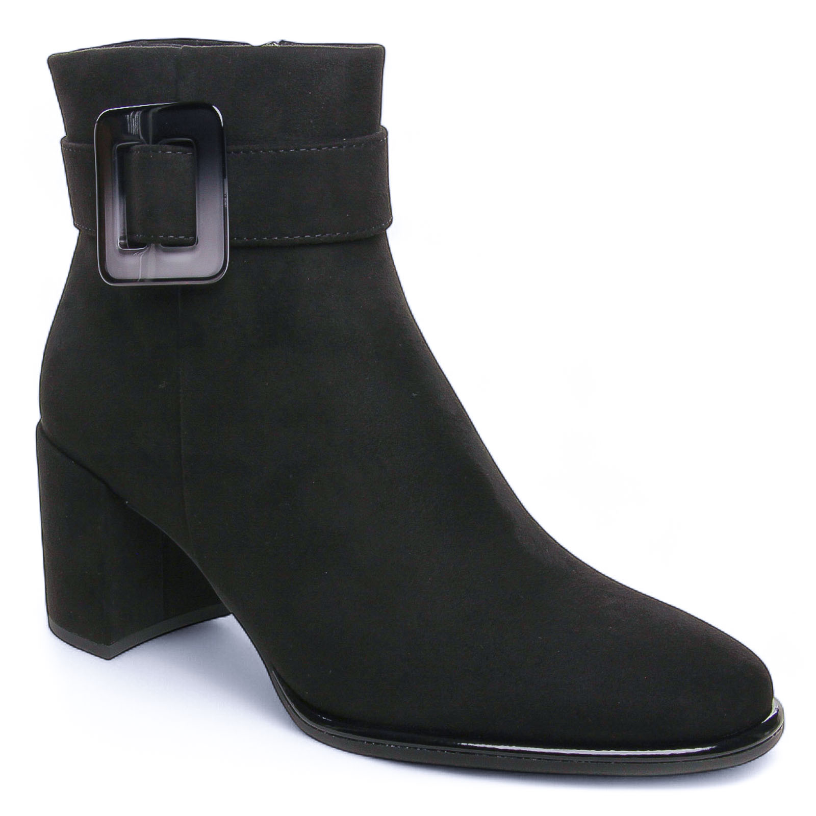 Bottines À Talon de la marque Marco Tozzi de couleur noir. Un talon haut de 7 cm pour ces jolies boots en velours beige ou noir pour cette nouvelle collection automne-hiver 2025, une bride fantaisie large à ornée d'une boucle métal carré moderne, un zip pour les chausser facilement, boots à talon chics et élégantes tout en étant confortable à un prix abordable : merci Marco Tozzi !