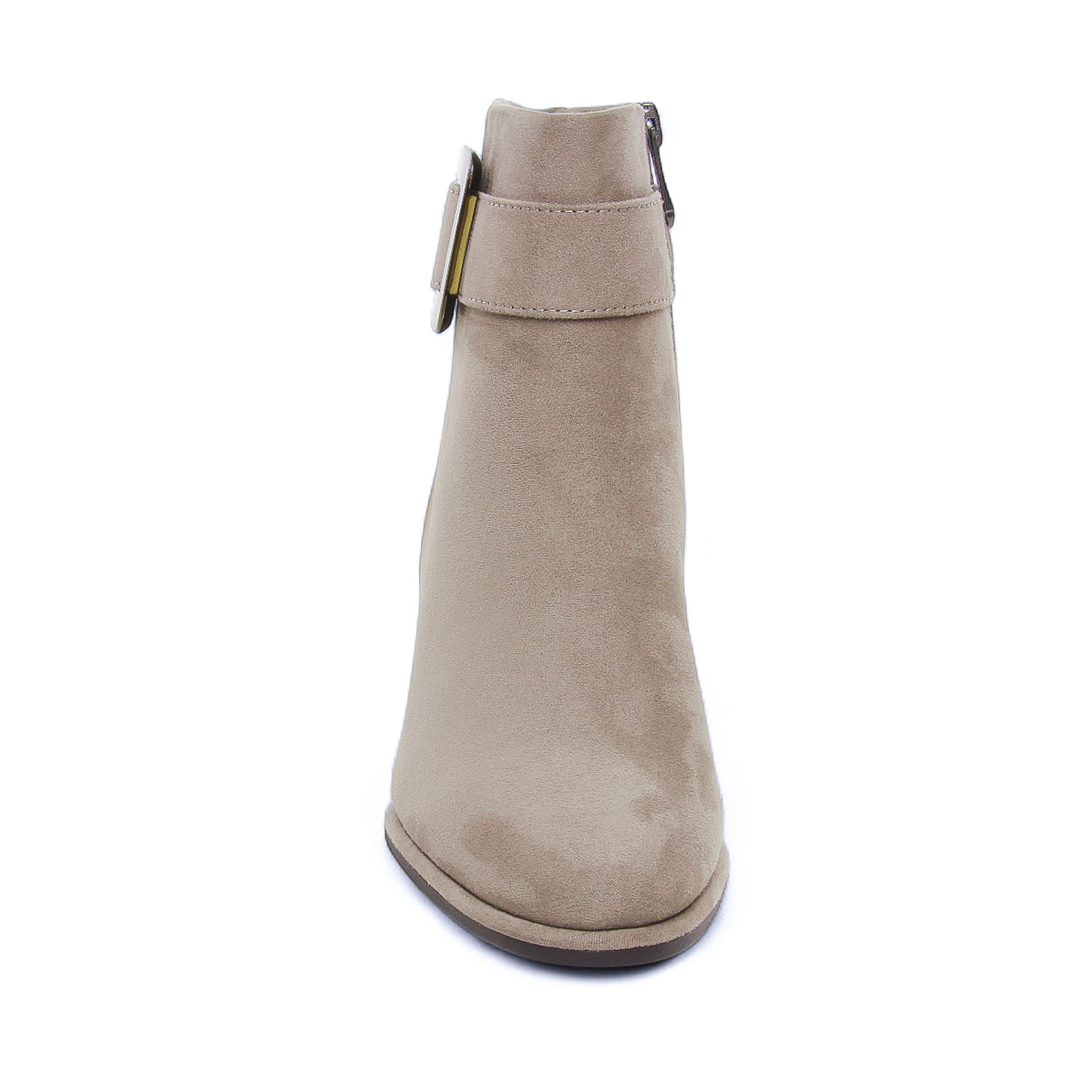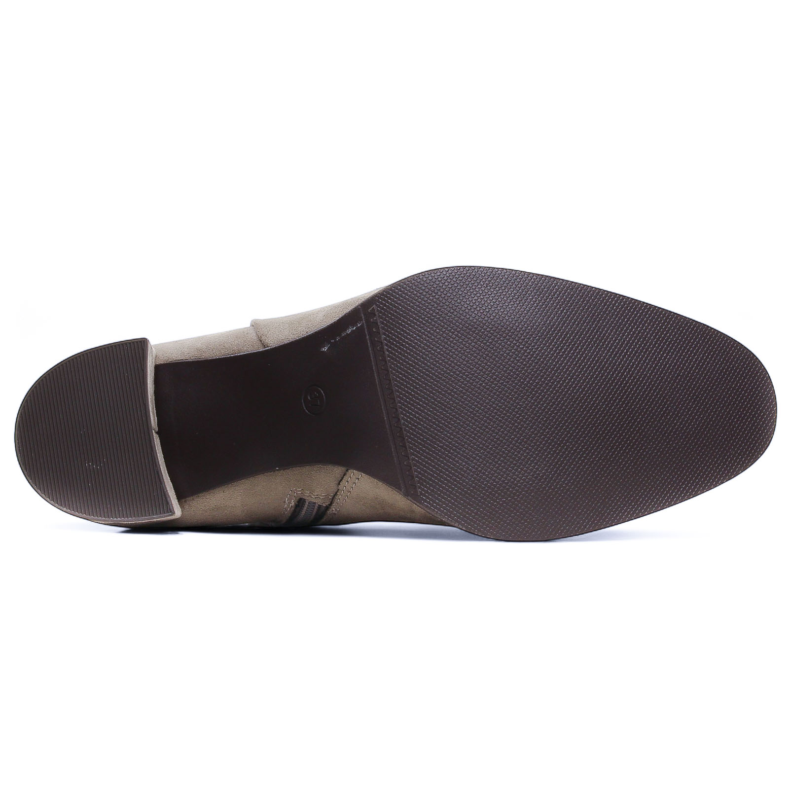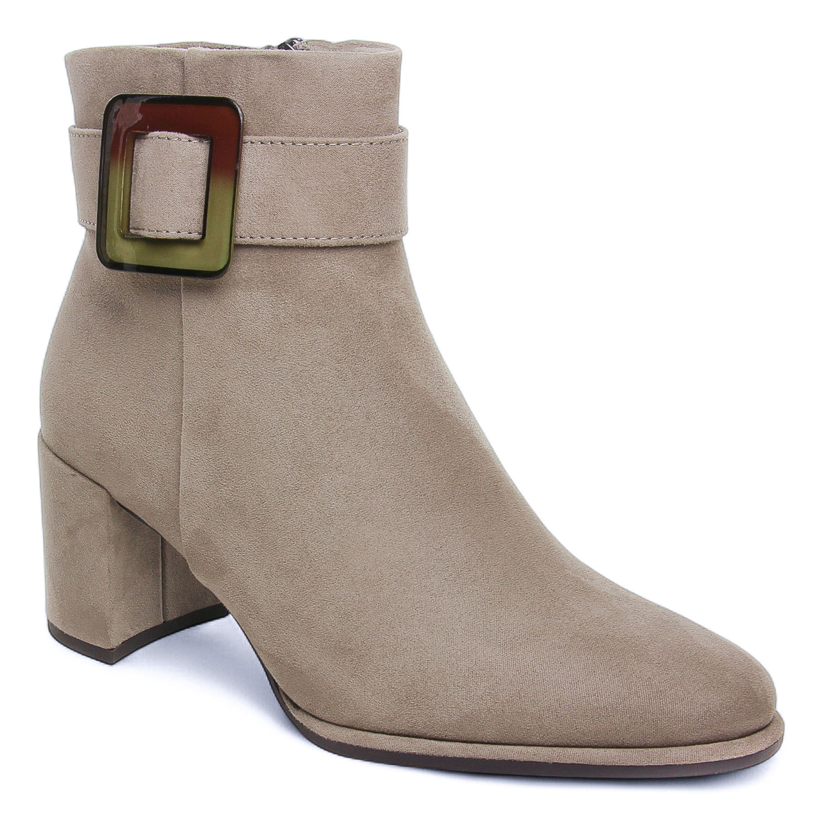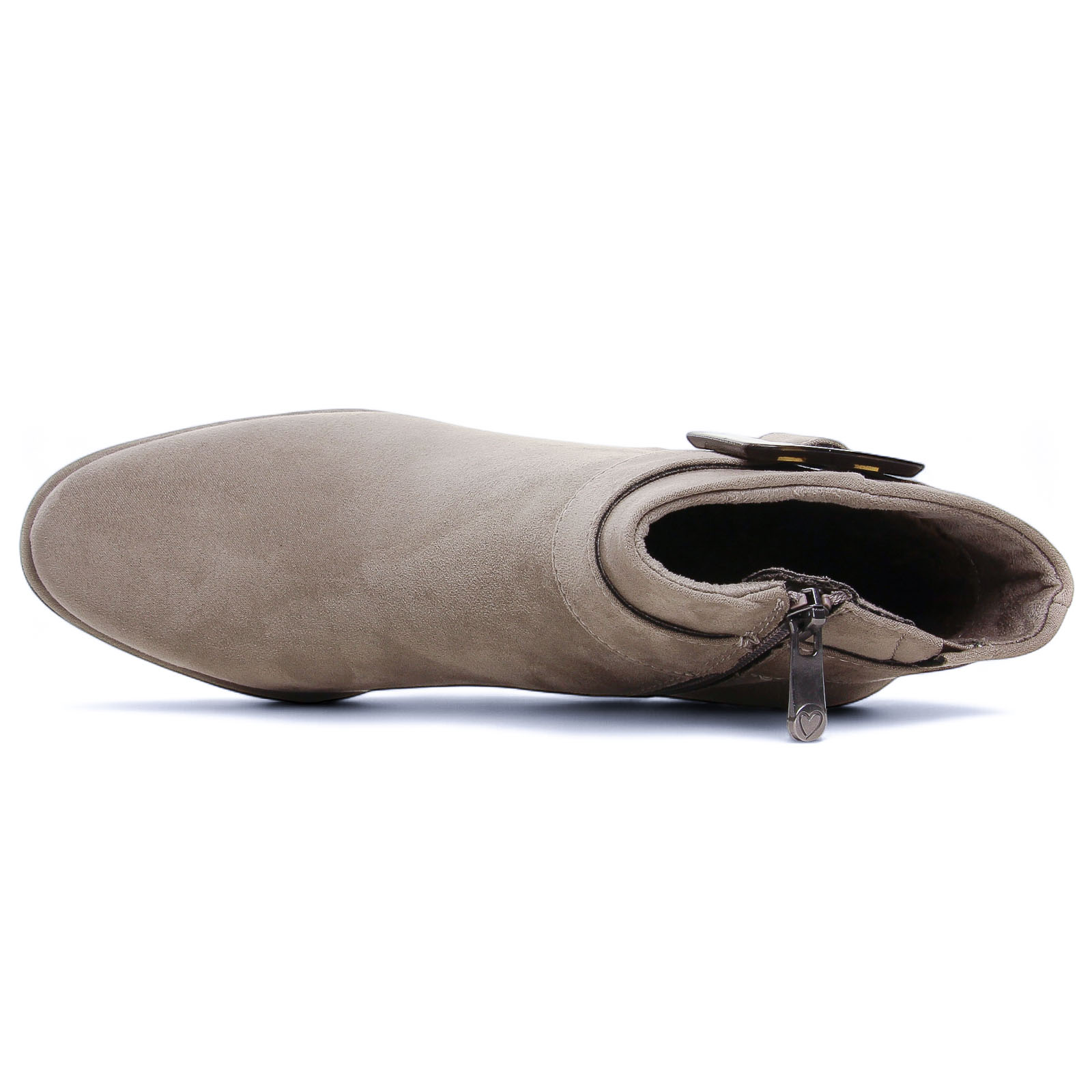 Bottines À Talon de la marque Marco Tozzi de couleur beige taupe. Un talon haut de 7 cm pour ces jolies boots en velours beige ou noir pour cette nouvelle collection automne-hiver 2025, une bride fantaisie large à ornée d'une boucle métal carré moderne, un zip pour les chausser facilement, boots à talon chics et élégantes tout en étant confortable à un prix abordable : merci Marco Tozzi !