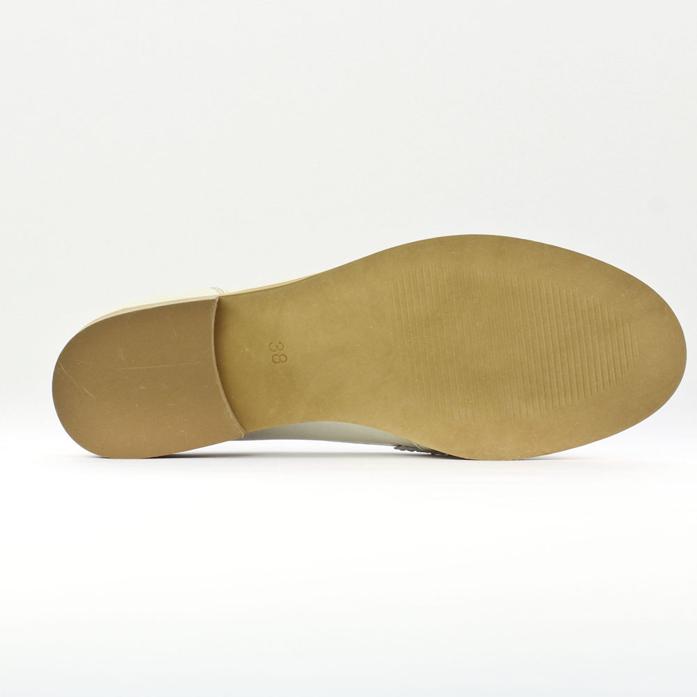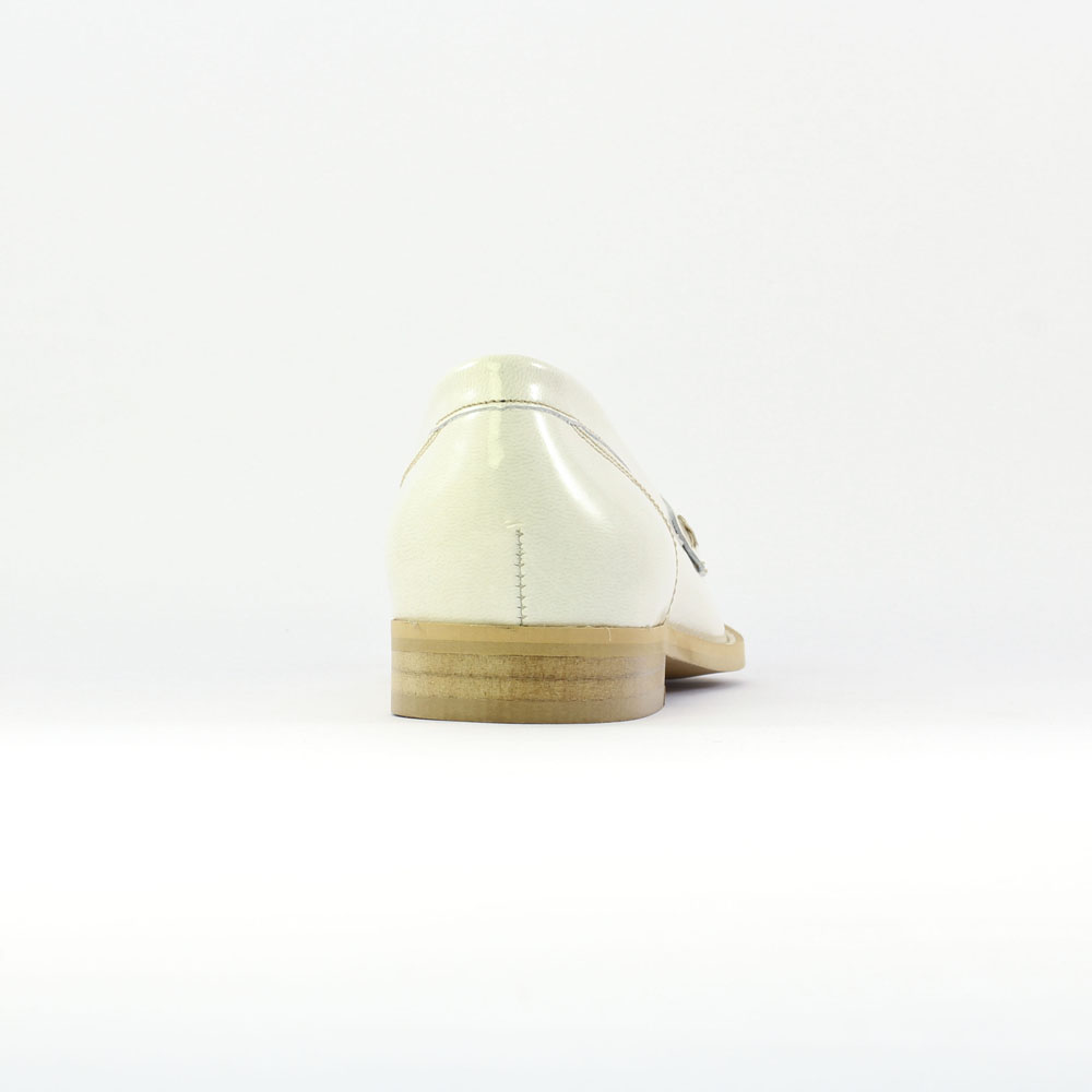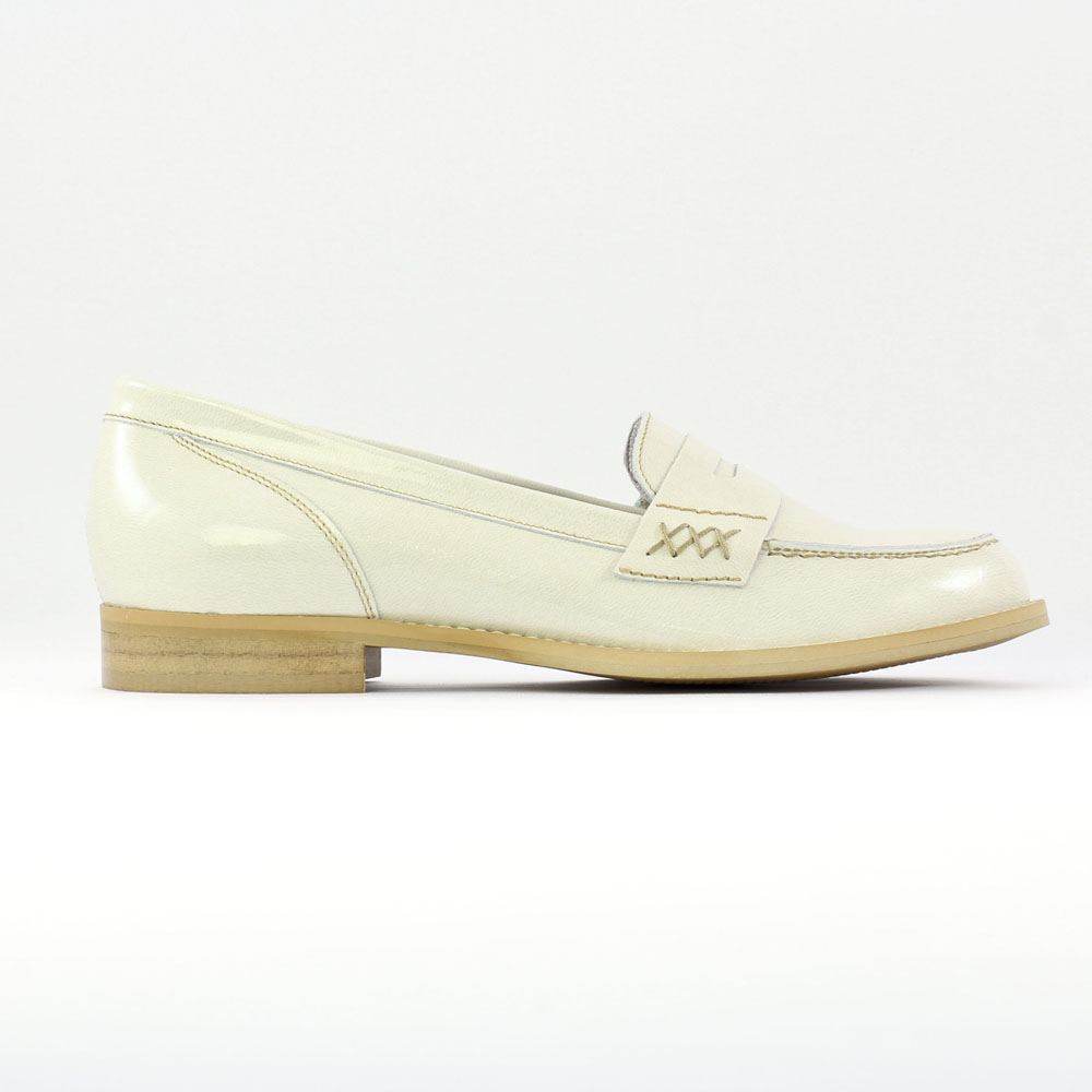 Mocassins de la marque Scarlatine de couleur blanc cassé. Mocassins femme en cuir, non doublés, première cuir, fabriqués en Espagne, tige en cuir vernis noir, semelle en gomme élastomère.