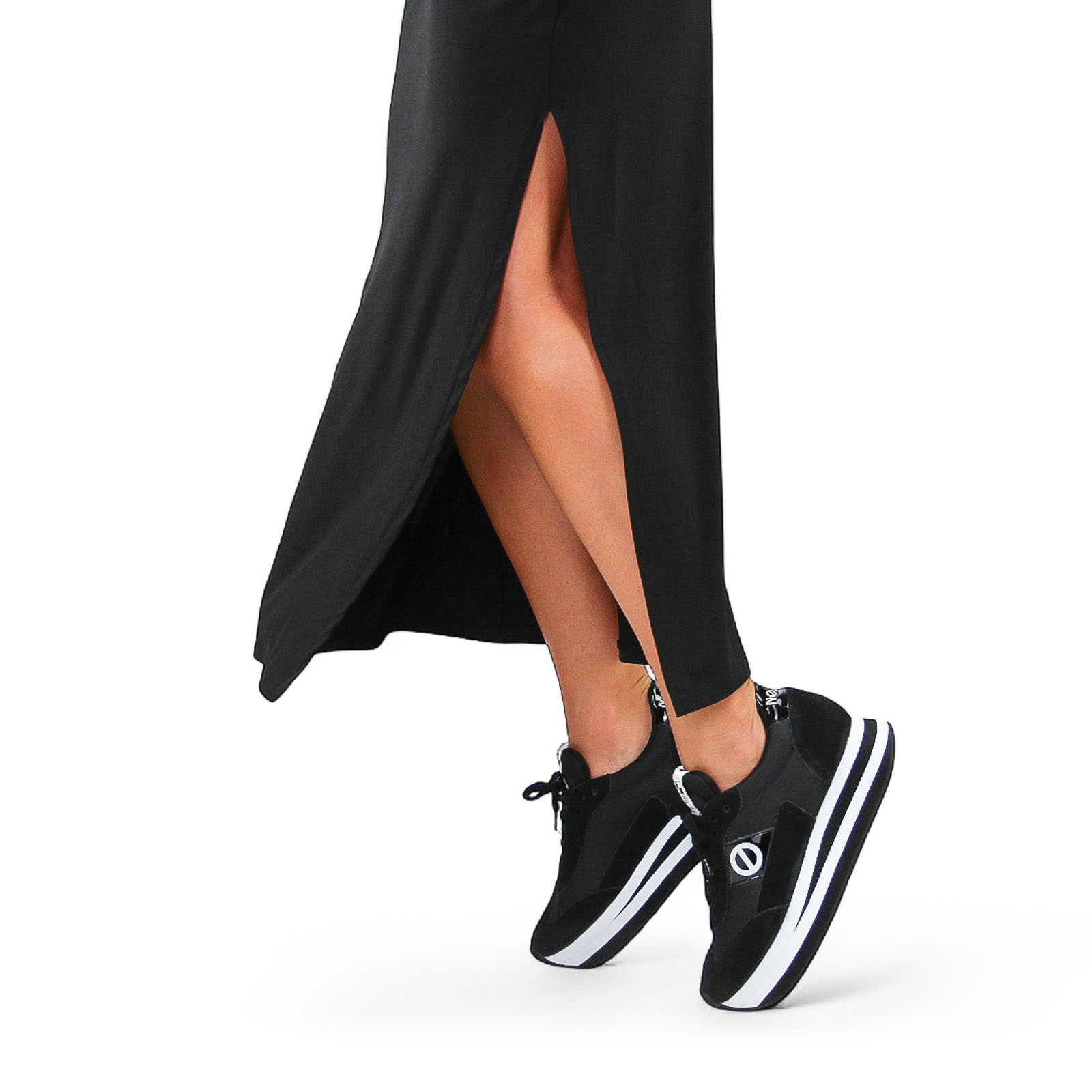 Baskets Plateforme de la marque No Name de couleur noir. Le joli modèle FLEX JOGGER ajoute une touche de glamour à votre style sporty chic ! Une première amovible, très confortable, sneaker en cuir velours avec insert de motifs ou de textures, un design moderne et audacieux signé No Name : on adore !